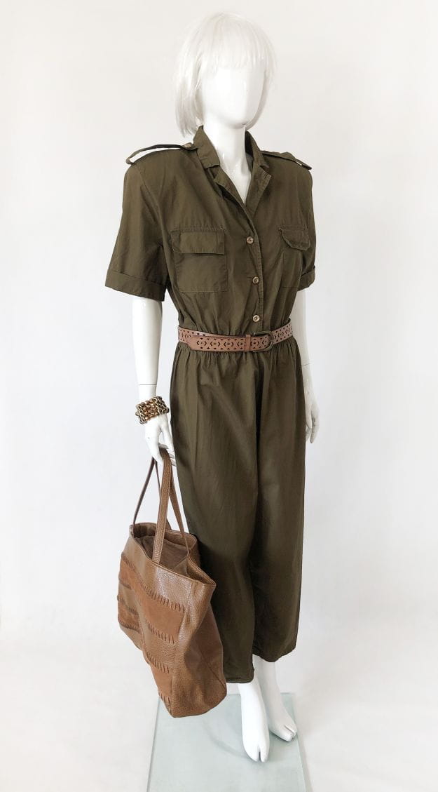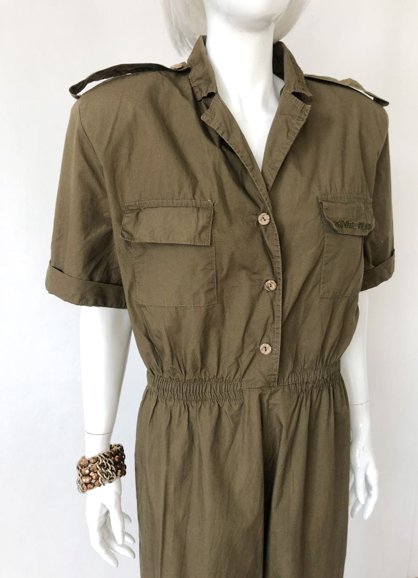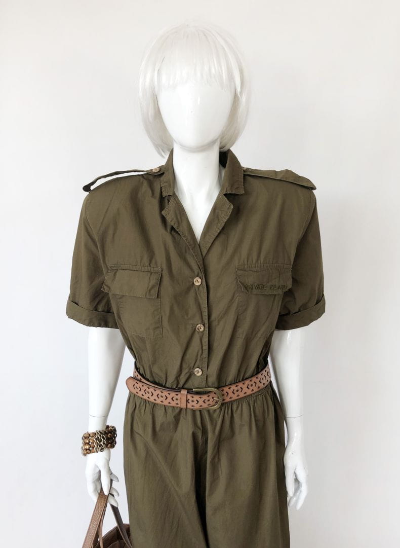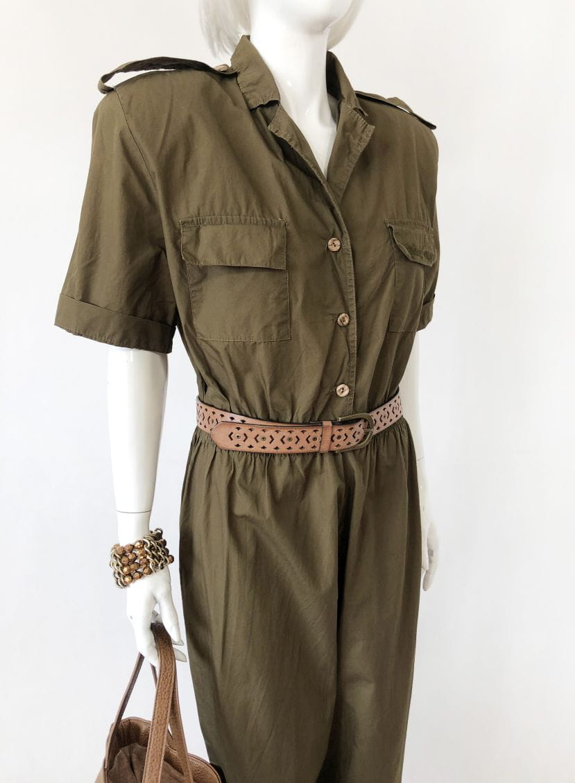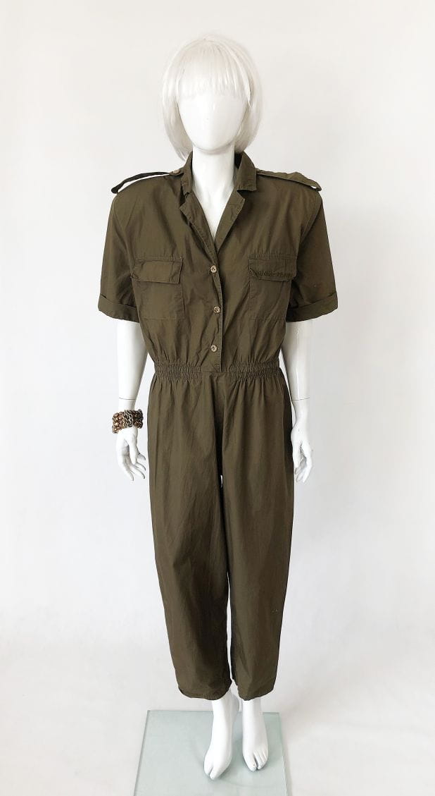 Kombinezon vintage militarnym stylu. Rozpinana góra z krótkim rękawem, na piersiach kieszenie. W ramionach poduszki. Talia na gumce. Długie nogawki. Pasek nie jest elementem sprzedaży.