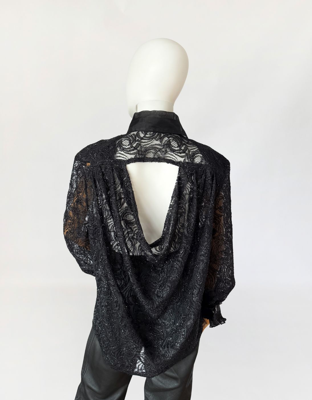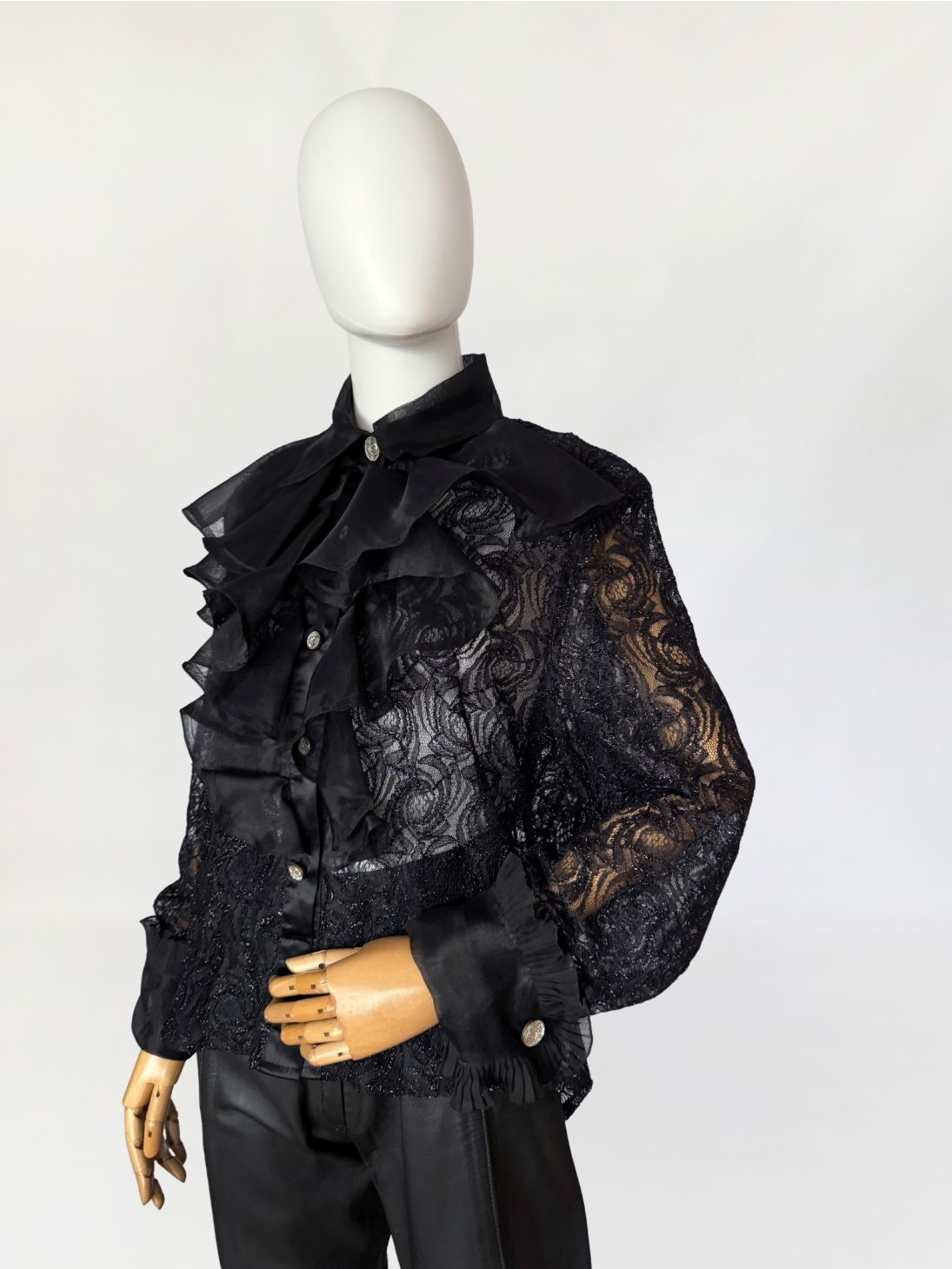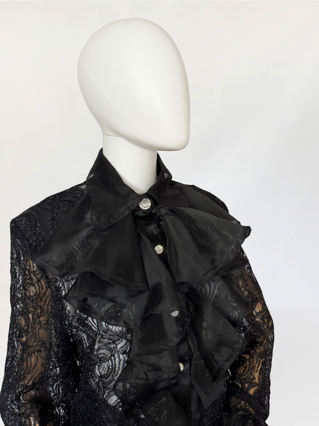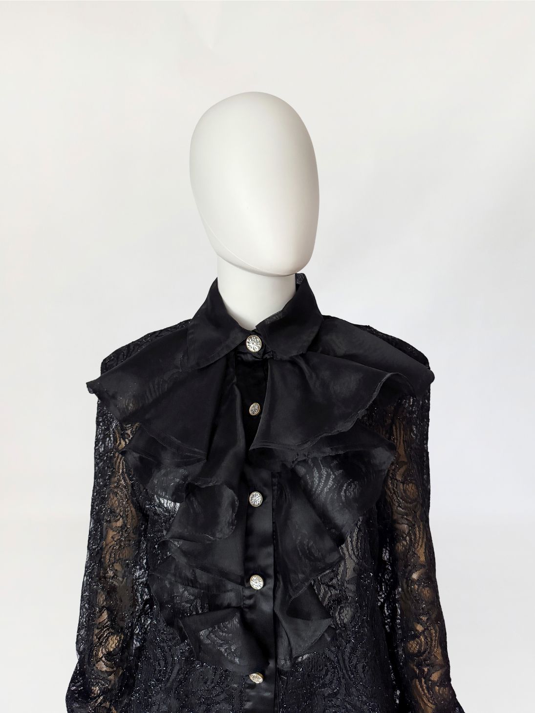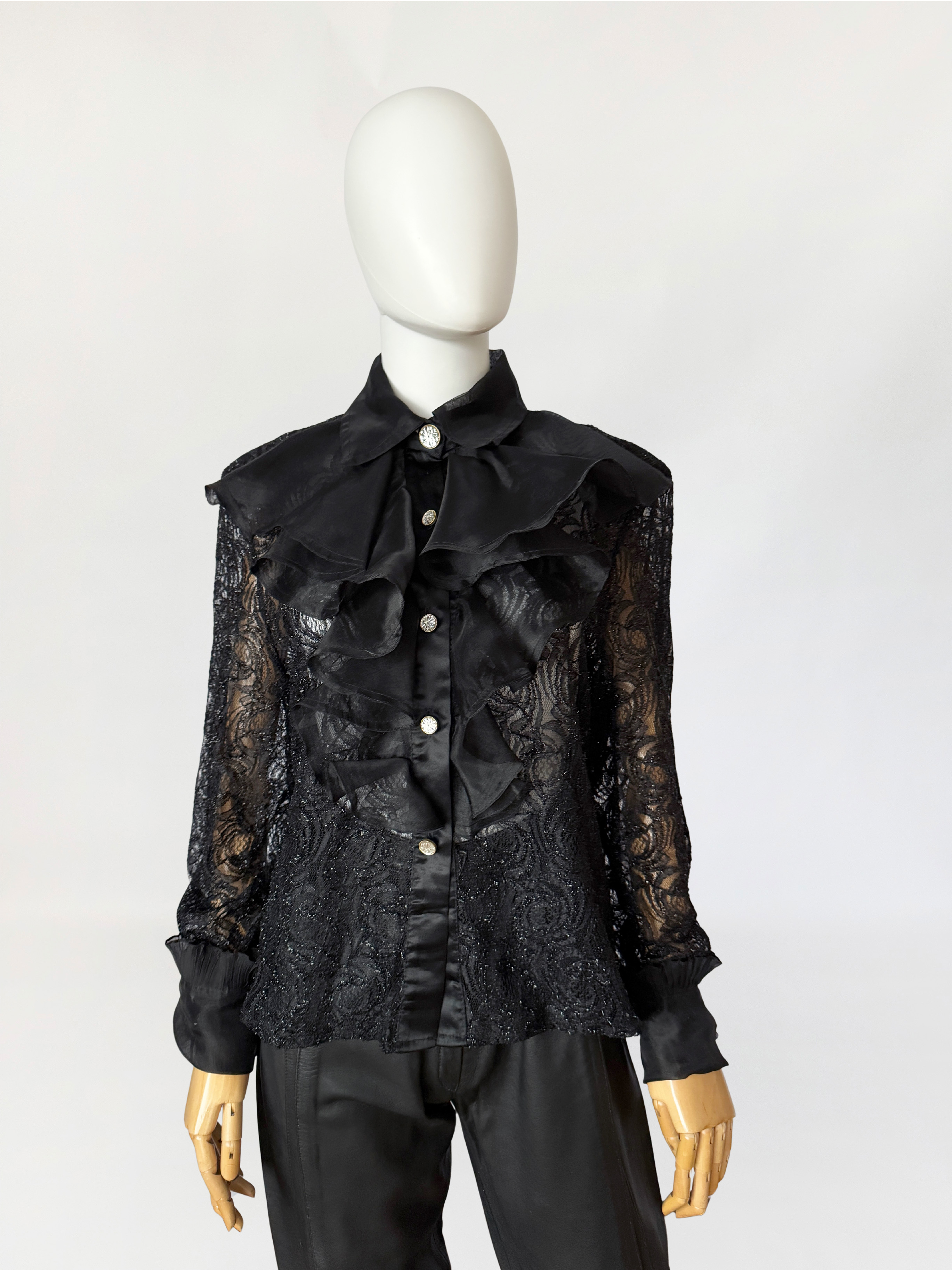 Koszula vintage wykonana z ażurowej koronki o drobnym, regularnym motywie roślinnym z subtelną, metaliczną nitką. Przód wykończony obszernym żabotem z czarnej organzy, nakładanym warstwowo i osadzonym na klasycznej listwie guzikowej. Guziki biżuteryjne, mocno osadzone w stabilnym podszyciu. Kołnierz szeroki, usztywniany, również z organzy, podobnie jak mankiety wykończone marszczeniem i drobną falbaną. Plecy z głębokim, drapowanym wycięciem, swobodnie opadającym. Rękawy wszywane klasycznie, o pełnej długości.