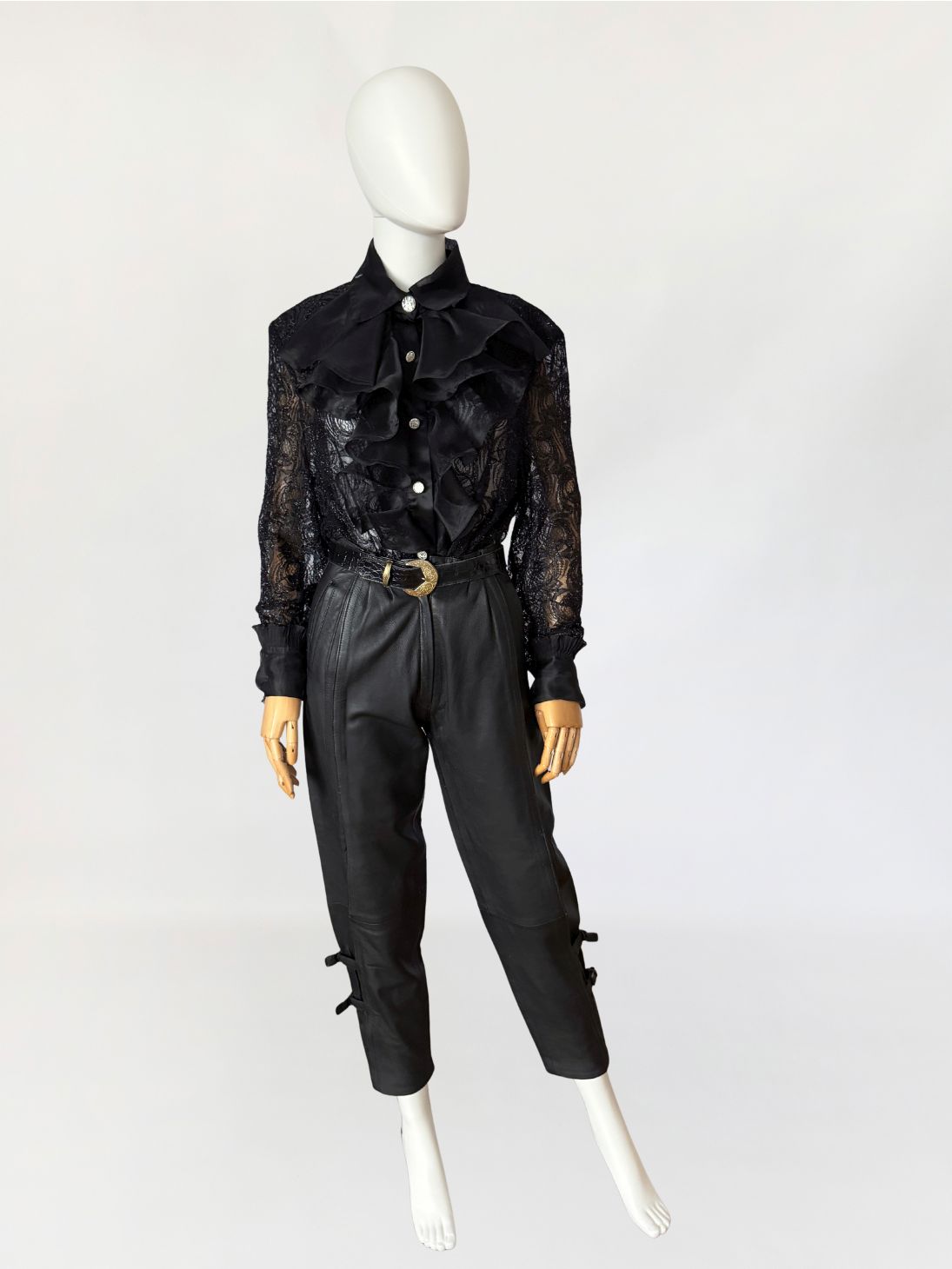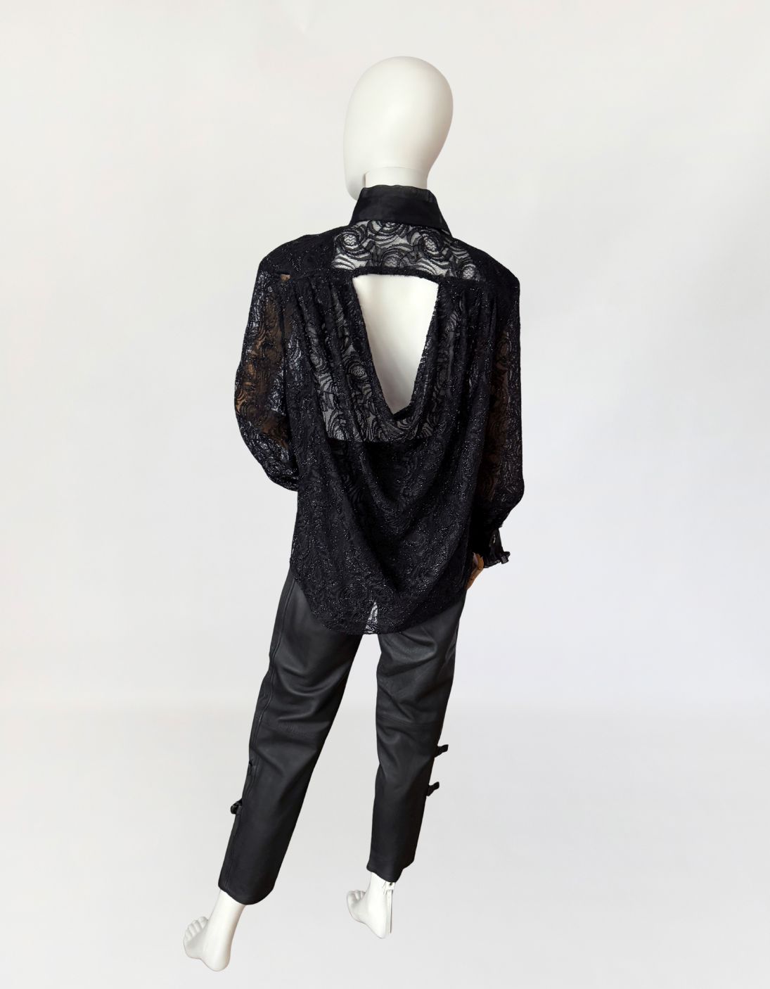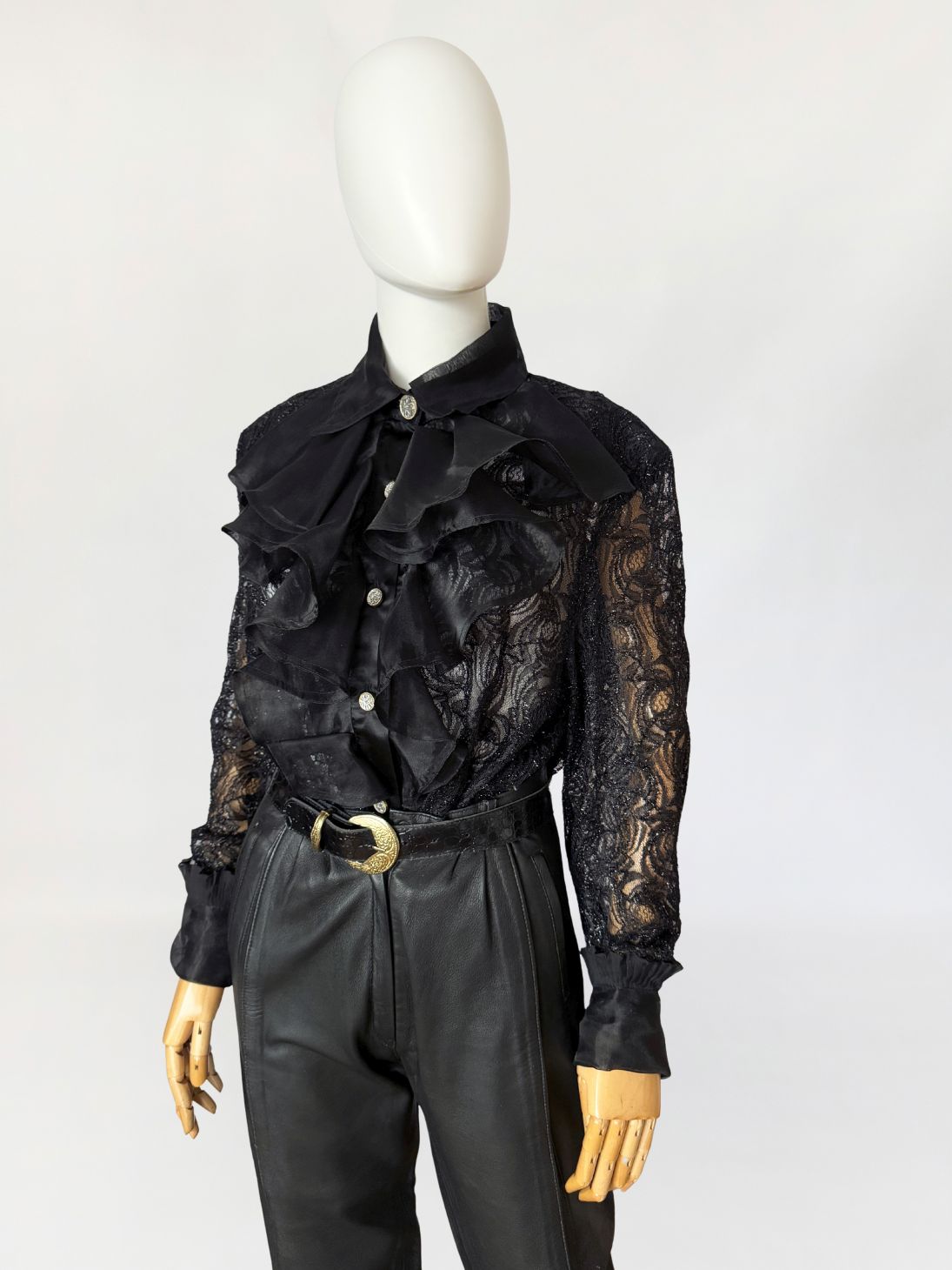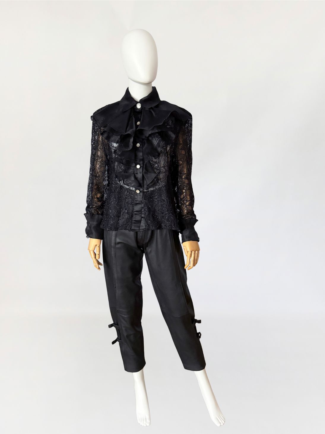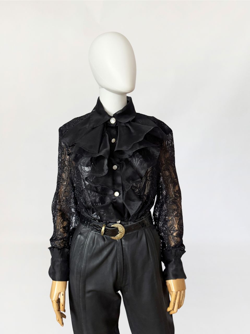 Koszula vintage wykonana z ażurowej koronki o drobnym, regularnym motywie roślinnym z subtelną, metaliczną nitką. Przód wykończony obszernym żabotem z czarnej organzy, nakładanym warstwowo i osadzonym na klasycznej listwie guzikowej. Guziki biżuteryjne, mocno osadzone w stabilnym podszyciu. Kołnierz szeroki, usztywniany, również z organzy, podobnie jak mankiety wykończone marszczeniem i drobną falbaną. Plecy z głębokim, drapowanym wycięciem, swobodnie opadającym. Rękawy wszywane klasycznie, o pełnej długości.