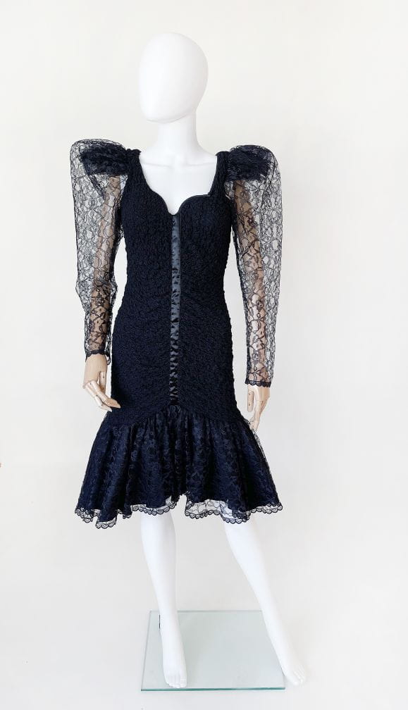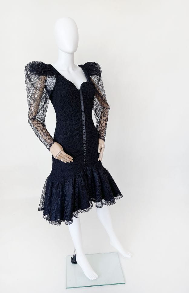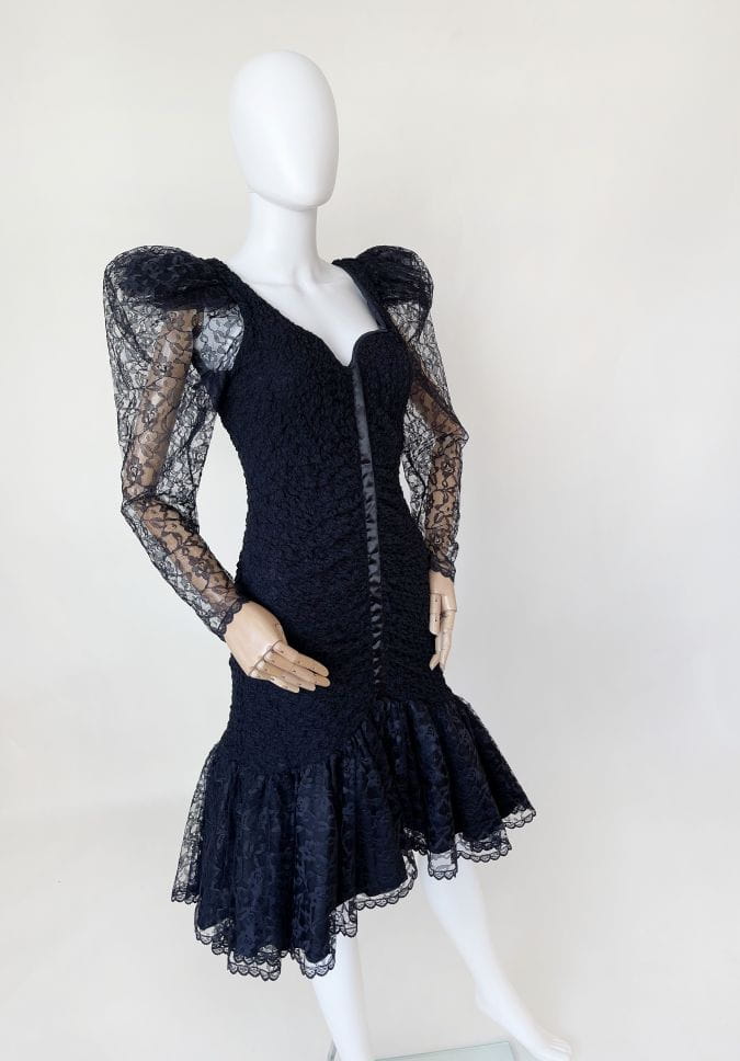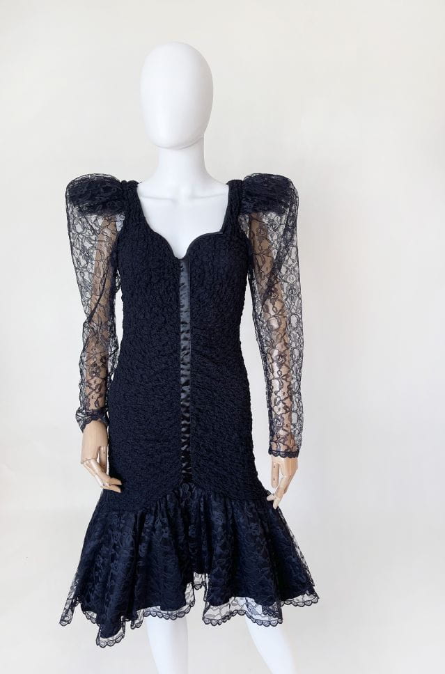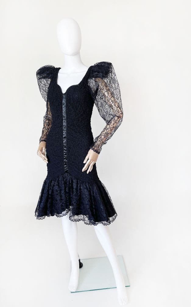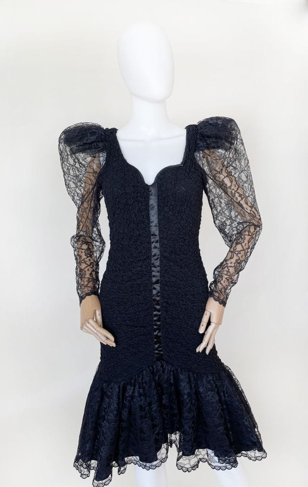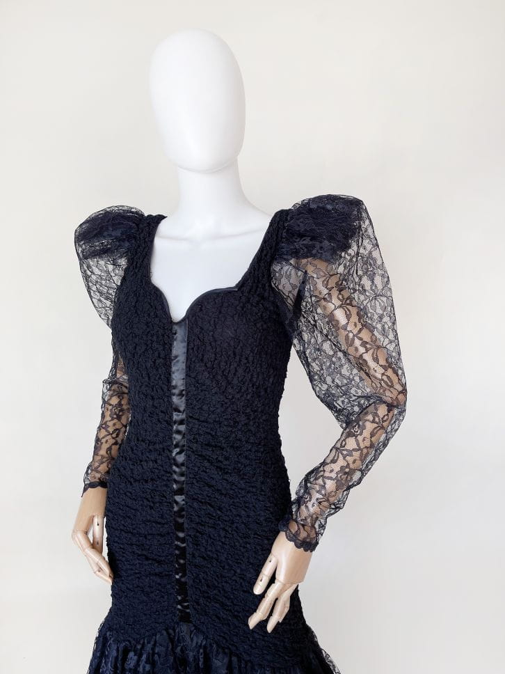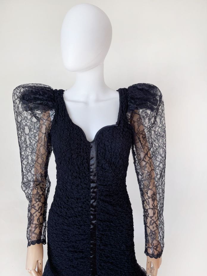 Oryginalna sukienka vintage z lat 80-tych made in USA. Kwintesencja dekady, model w stylu młodej Madonny, Cyndi Lauper z długimi rękawami i bufiastymi "dramatic shoulders", które podtrzymuje tiulowa konstrukcja. Sukienka została wykonana z drapowanej, elastycznej tkaniny koronkowej. Ma dopasowany fason, na samym dole mocno rozkloszowana. Dół swobodnie i naturalnie unosi się za sprawą tiulowej podszewki. Dekolt mocniej wycięty, typu serce. Usztywniony fiszbinami u góry. Długie rękawy zwężają się w kierunku nadgarstków. Na plecach wycięcie w górnej części. Przepinana na guzik na karku.