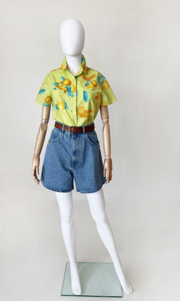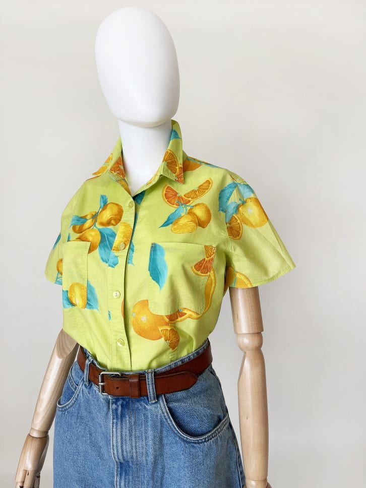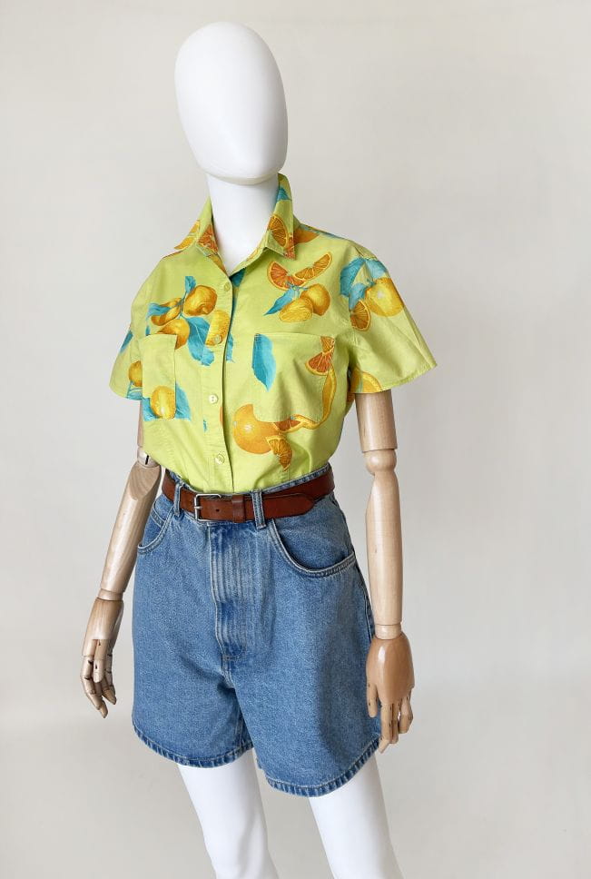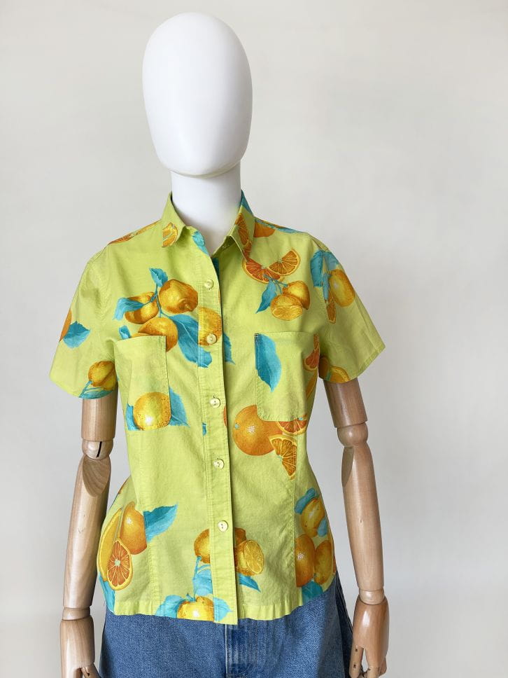 Koszula vintage o klasycznym, lekko taliowanym fasonie z krótkimi rękawami. Wykonana z bawełnianej tkaniny w kolorowe owocowe printy. W górnej części nieduże kieszenie.