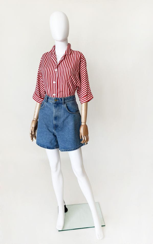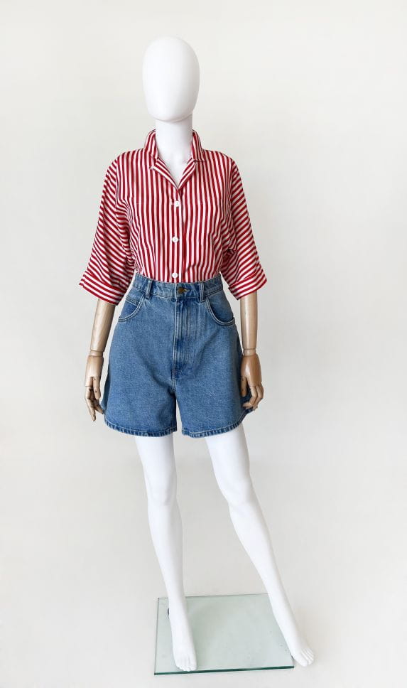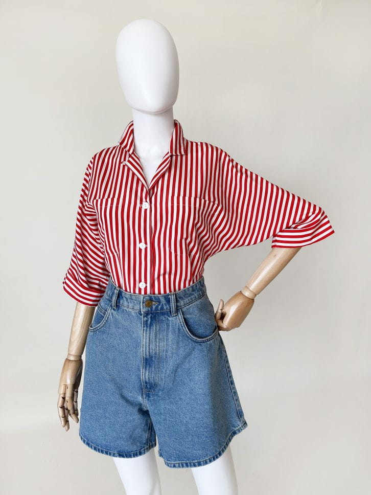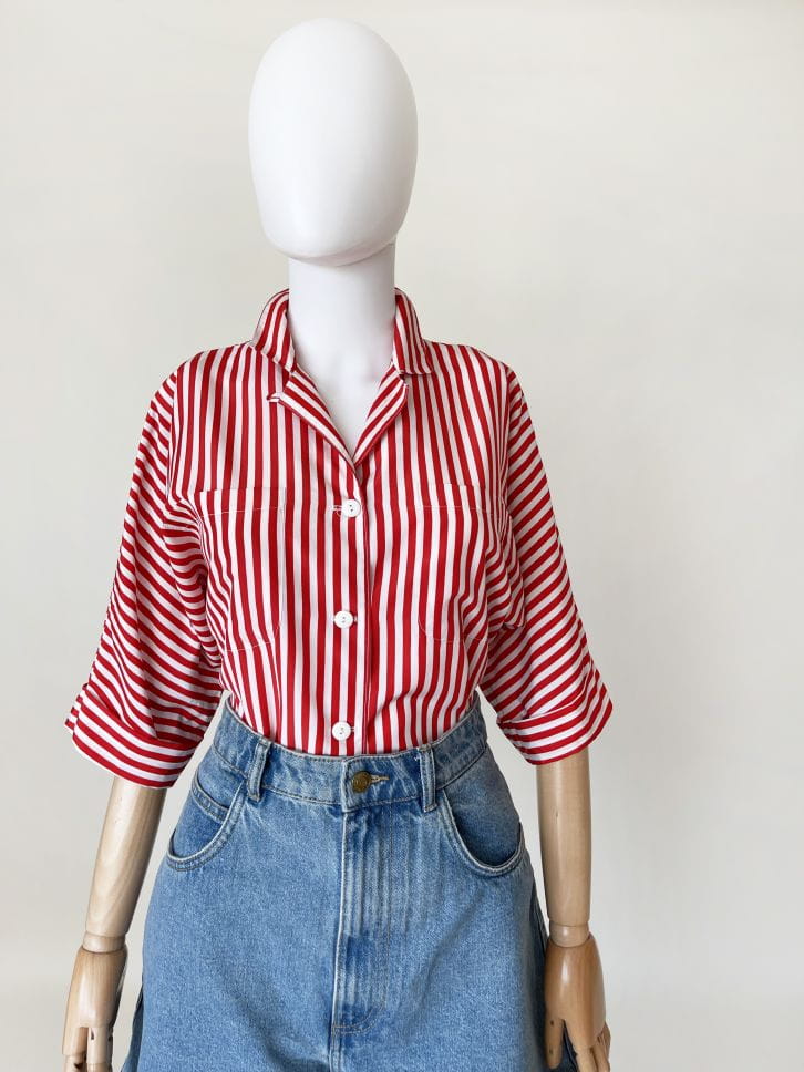 Koszula vintage made in USA, wykonana z lekkiej syntetycznej tkaniny w czerwone pasy. Luźny fason z krótkimi rękawami.