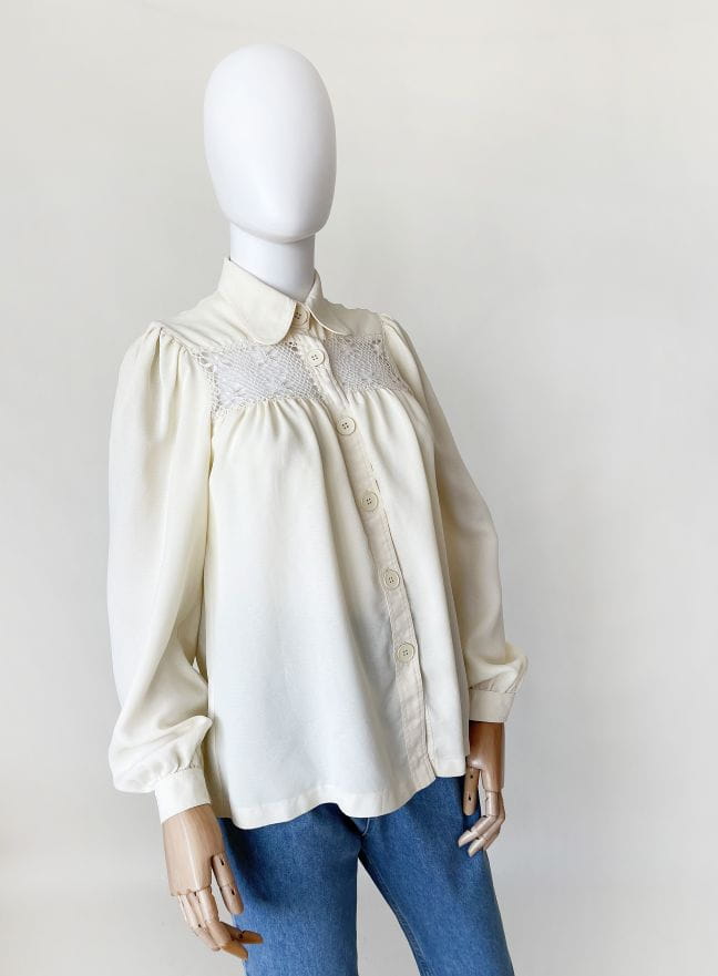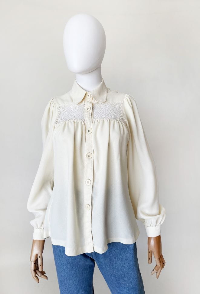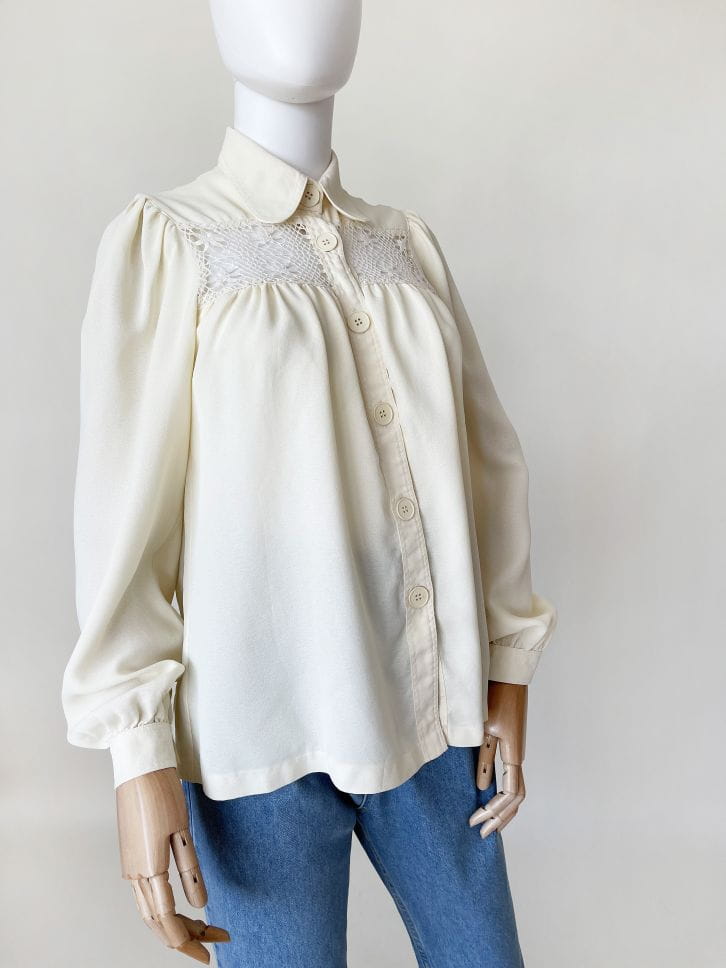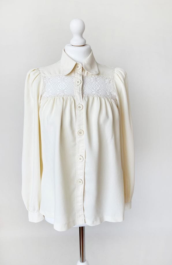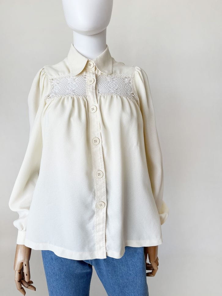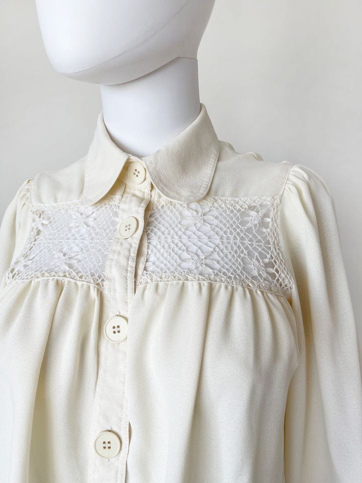 Koszula vintage z lat 70-tych wykonana z syntetycznej tkaniny w kolorze śmietankowym. W górnej partii ażurowa wstawka. Na wysokości biustu drapowana. Długie szerokie rękawy, przepinane w nadgarstkach.