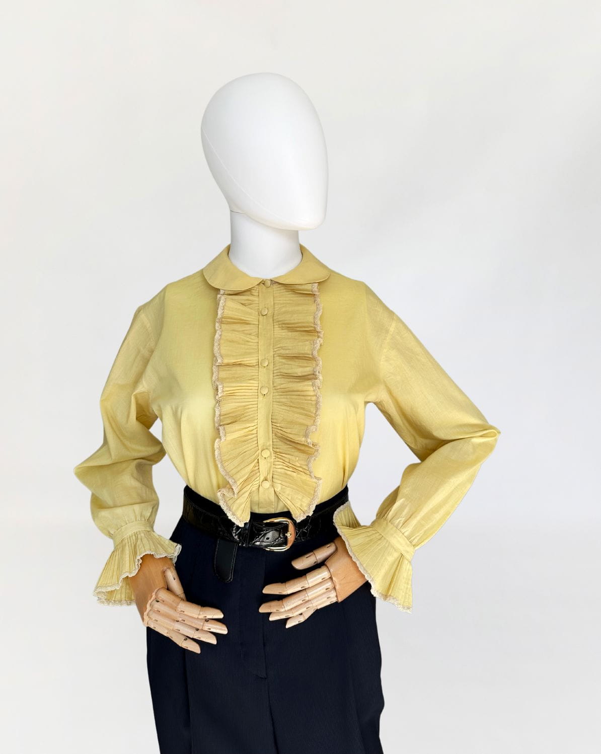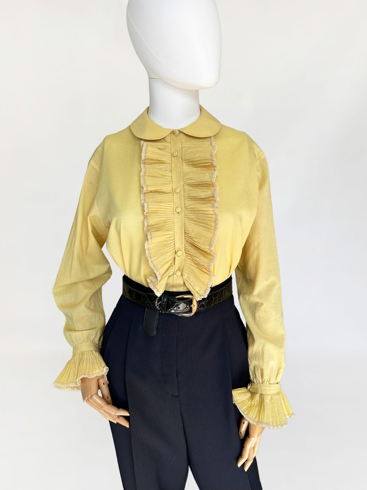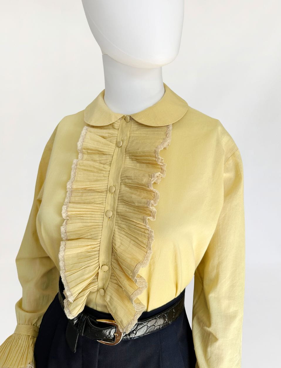 Romantyczna, wiekowa włoska koszula vintage. Uszyta z lekkiej bawełnianej tkaniny w kolorze waniliowego puddingu. U góry nieduży okrągły kołnierz, a niżej okazały plisowany dekoracyjny żabot, wykończony koronkową walansjerką. Duże ozdobne mankiety uszyte w taki sam sposób jak żabot. Całość zapinana na oblekane guziki.