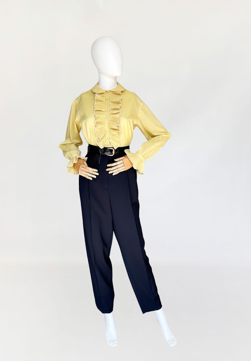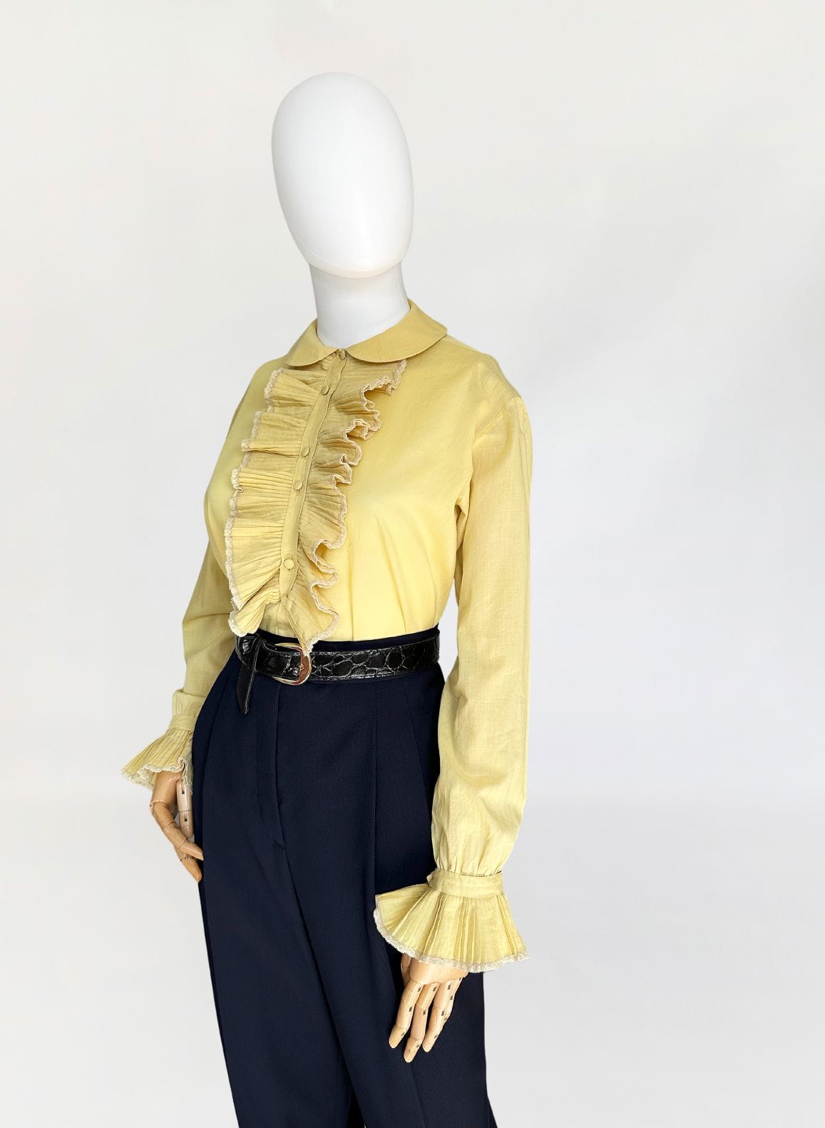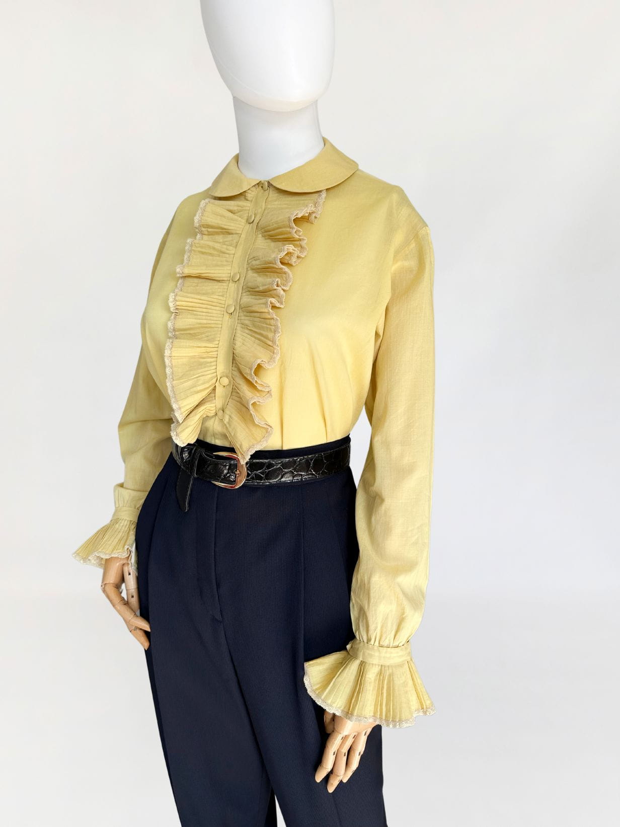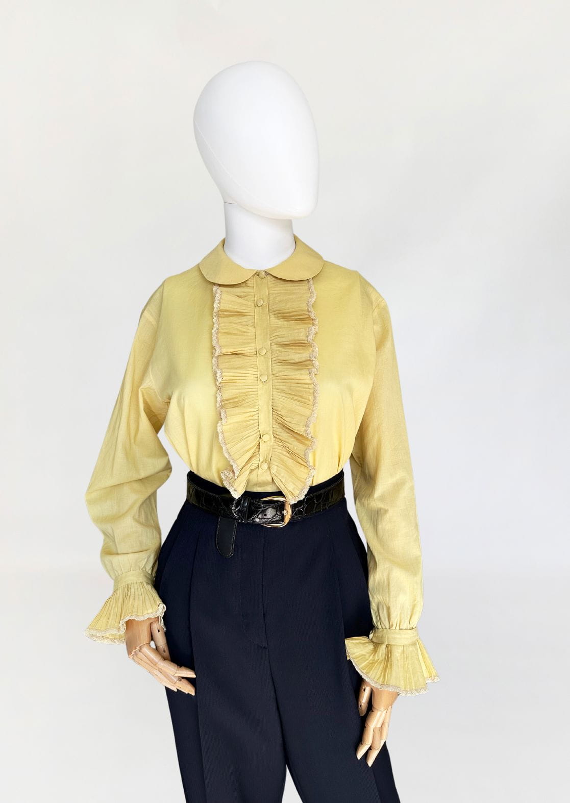 Romantyczna, wiekowa włoska koszula vintage. Uszyta z lekkiej bawełnianej tkaniny w kolorze waniliowego puddingu. U góry nieduży okrągły kołnierz, a niżej okazały plisowany dekoracyjny żabot, wykończony koronkową walansjerką. Duże ozdobne mankiety uszyte w taki sam sposób jak żabot. Całość zapinana na oblekane guziki.