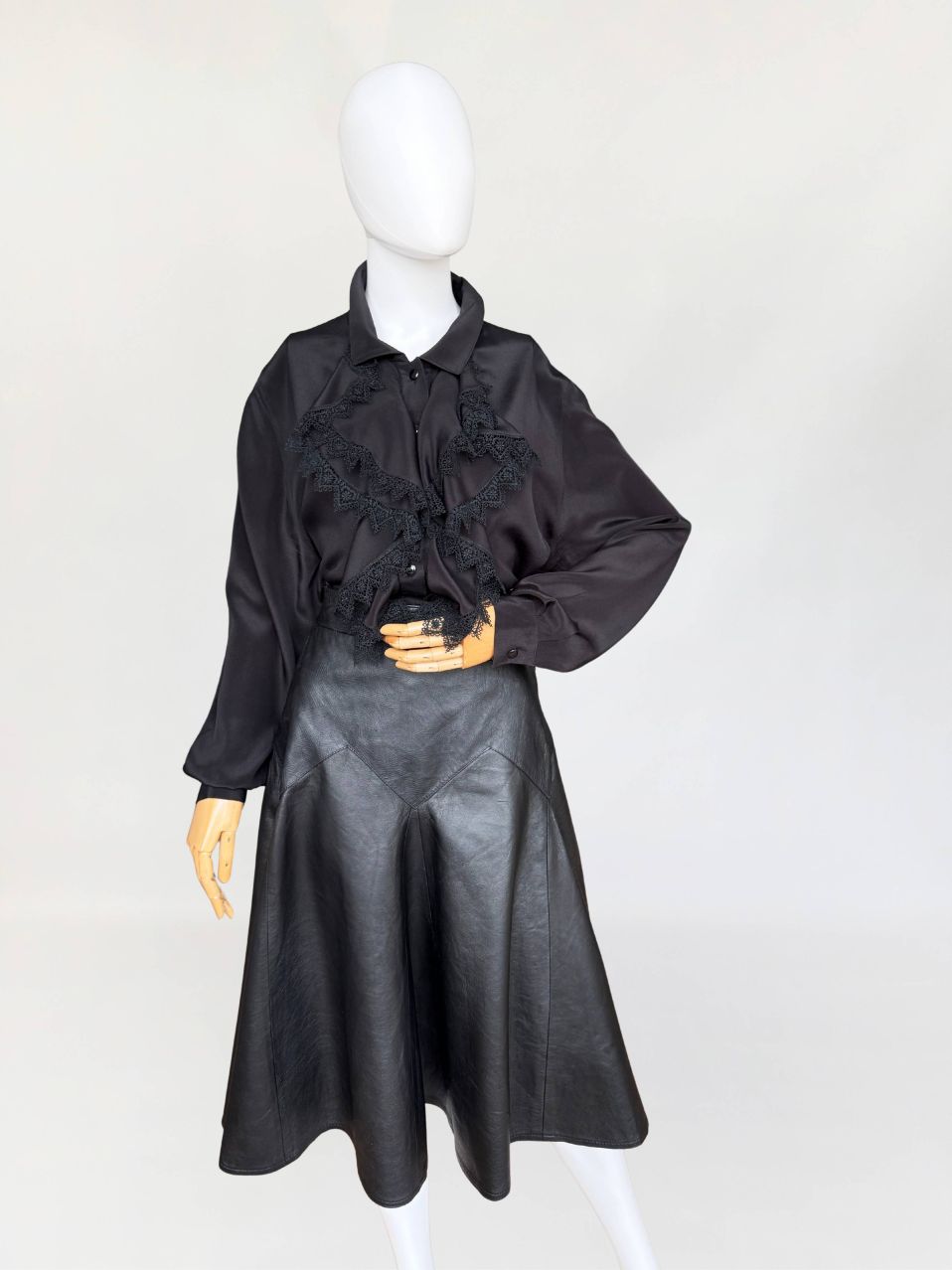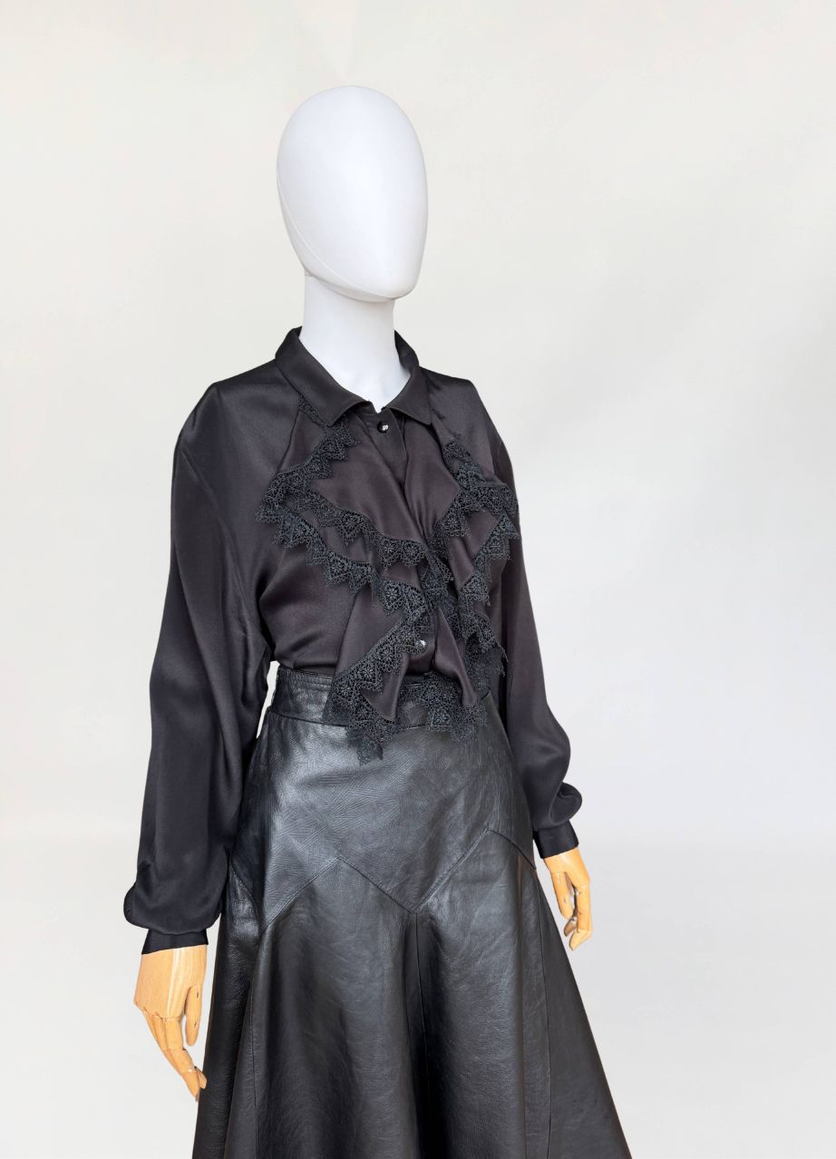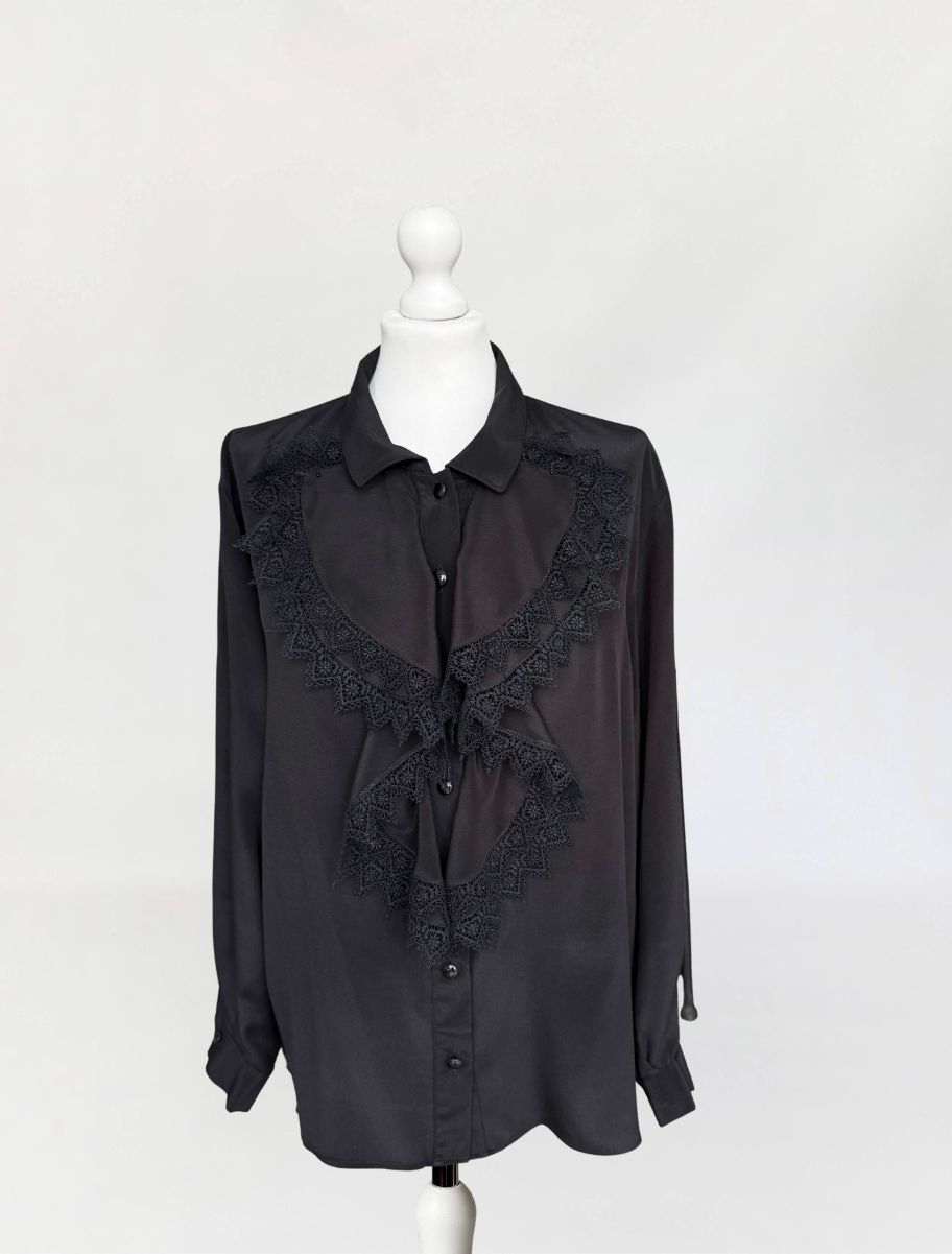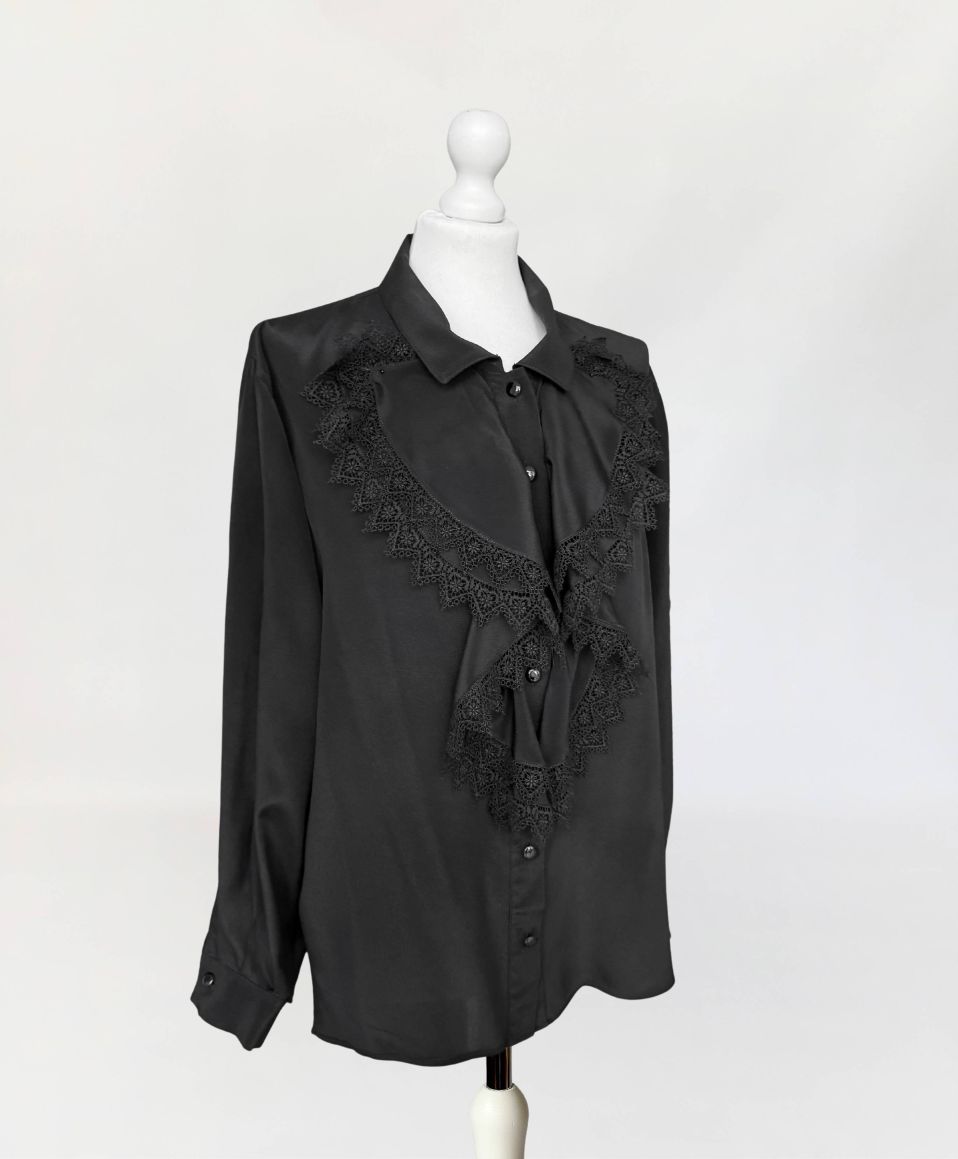 Włoska koszula vintage wykonana z czarnej szyfonowej tkaniny z jedwabiem. Klasyczny swobodny fason z długimi rękawami. Od frontu okazały żabot z koronkowym wykończeniem.