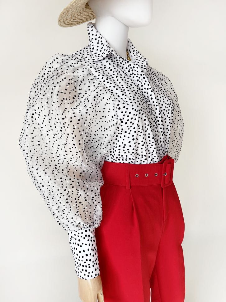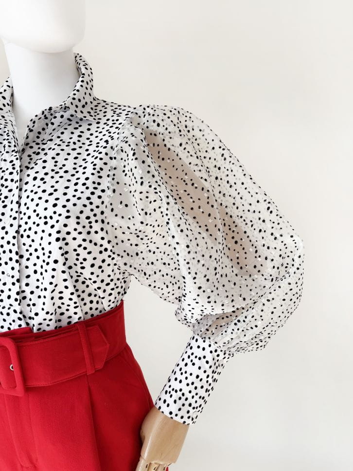 Koszulowa bluzka z balonowymi, extra-bufiastymi rękawami. Korpus rozpinany do ok 3/4 długości, wykonany z bawełnianej tkaniny. Pokryty nieregularnymi kropkami 3d z weluru. Rękawy z organzy, lekkiej ale sztywniejszej i plastycznej - doskonale utrzymującej fason w balonowej formie. Także zdobione drobnymi welurowymi kropeczkami. Zakończone długimi bawełnianymi mankietami.