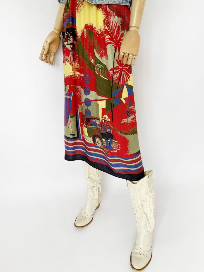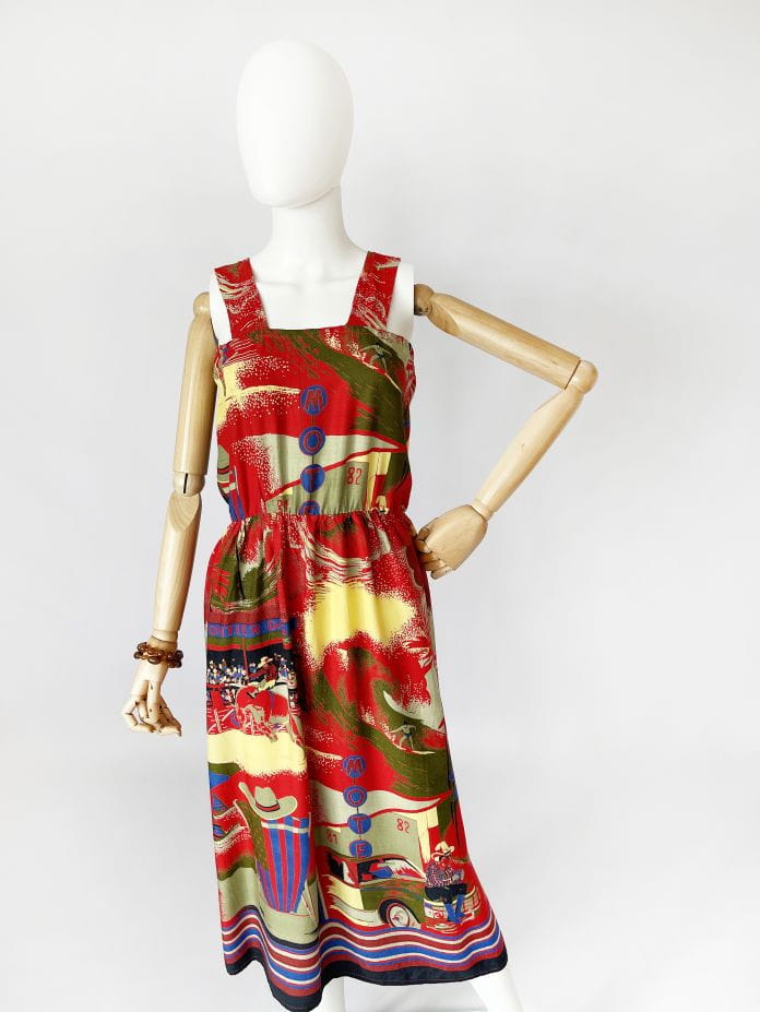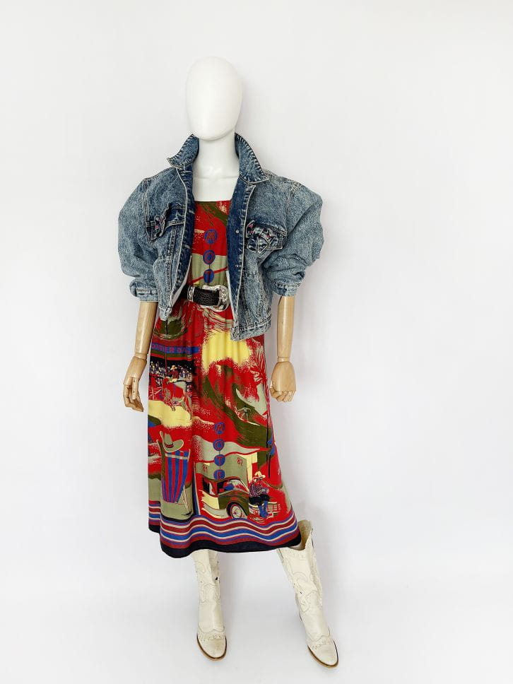 Kolorowa sukienka dla współczesnej kowbojki. Uszyta z lekkiej tkaniny o deseniu w barwne printy z motywem dzikiego zachodu: sceny z rodeo, kowbojskie kapelusze i ranczerów. Świetna i unikatowa rzecz. Góra na ramiączkach, w talii elastyczna guma. Dół swobodnie poszerzany. Wygląda zabójczo do kowbojek, lubi się także z jeansem i skórą. Pasek nie jest elementem kompletu. Model bez podszewki