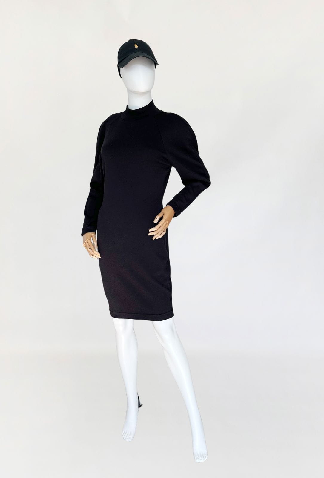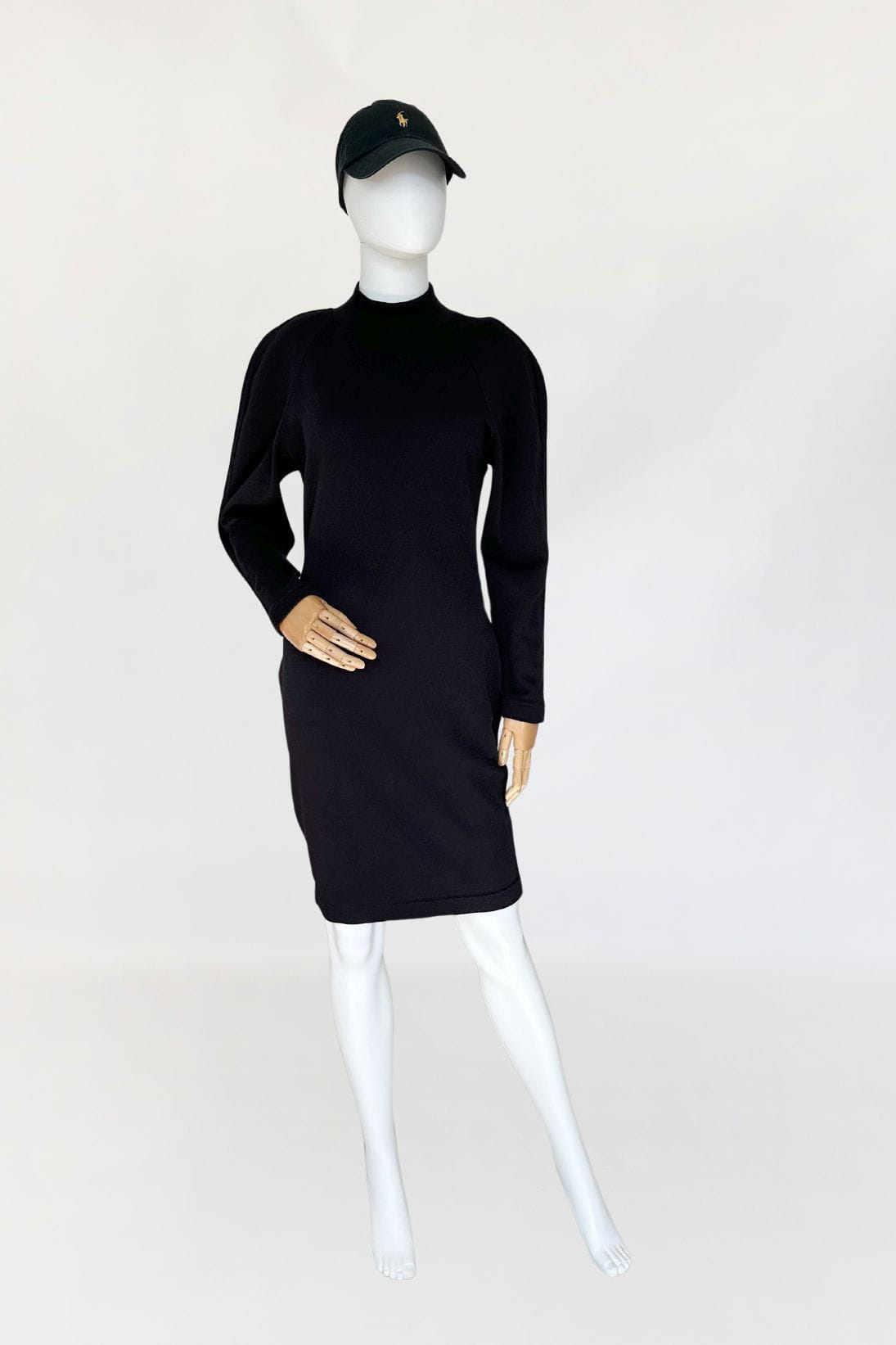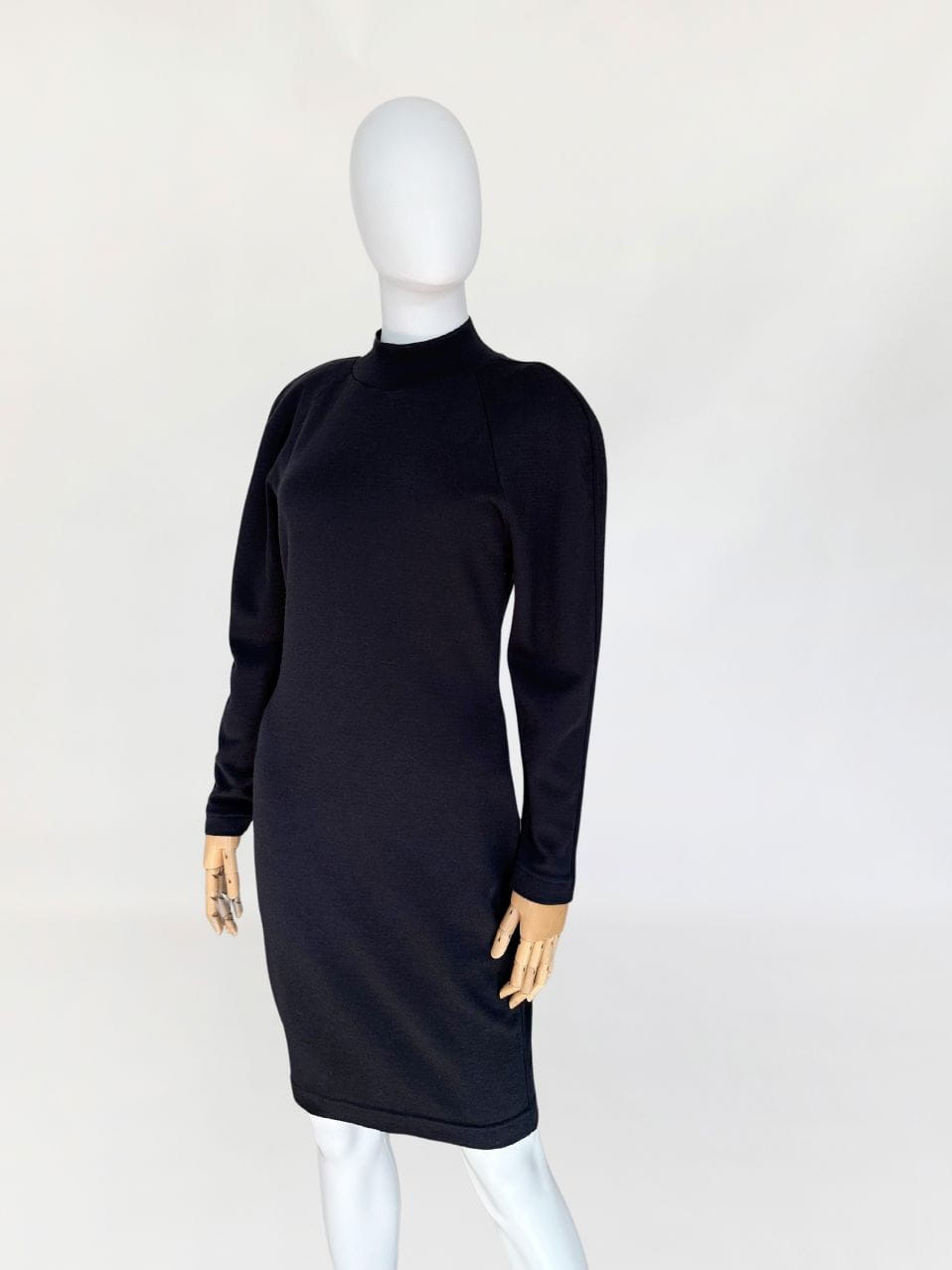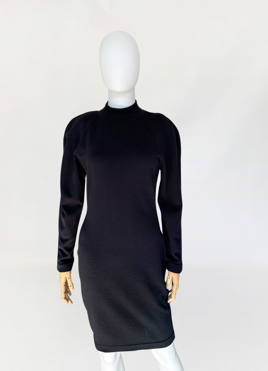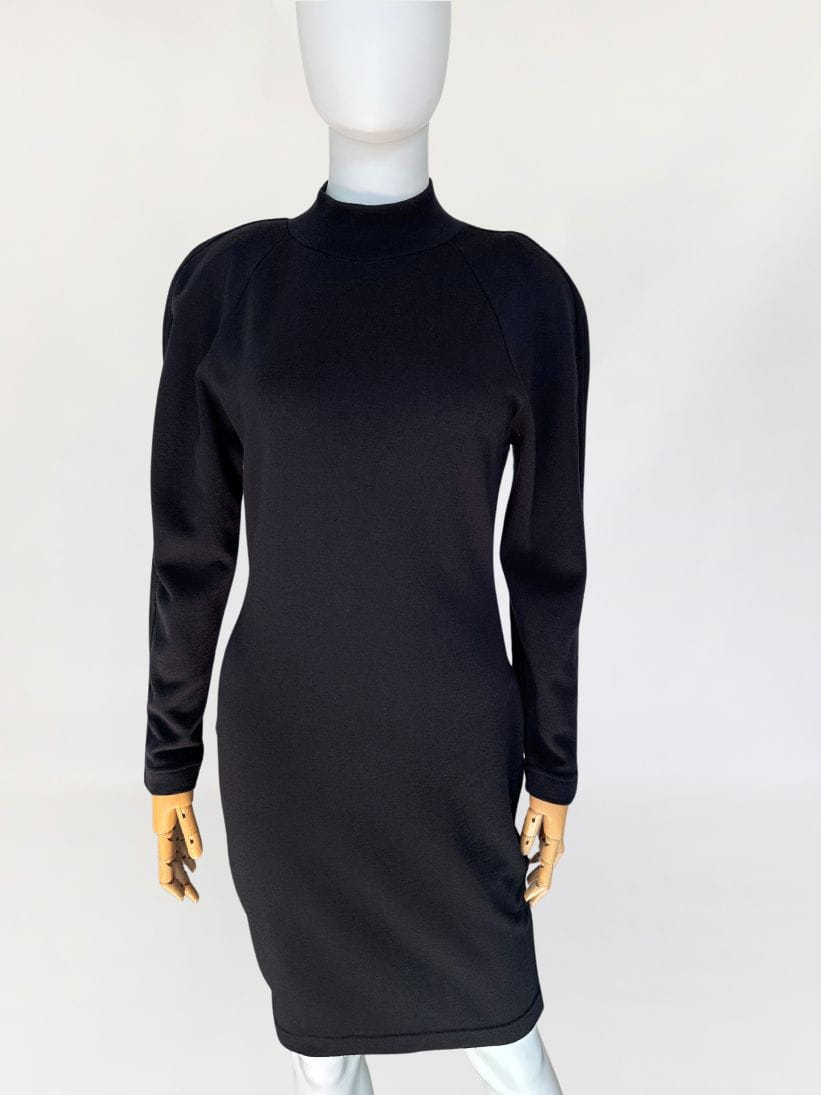 Sukienka luksusowej włoskiej marki Krizia. Wykonana z elastycznej dzianiny, mieszanki wełny i akrylu. Dopasowany, taliowany fason o długości midi u góry nieduża stójka. Raglanowe rękawy.