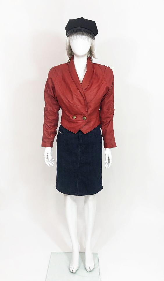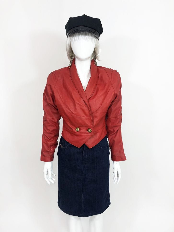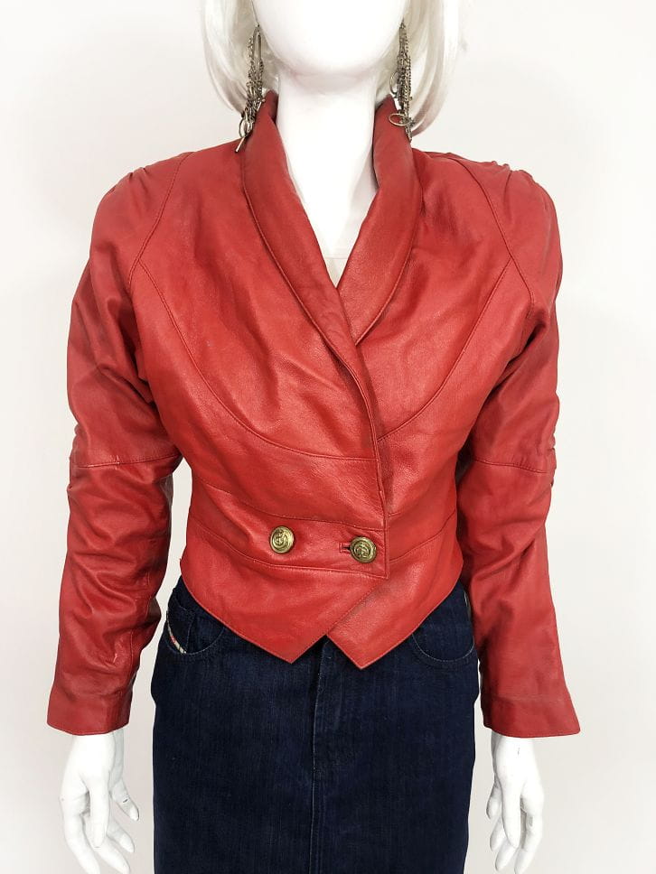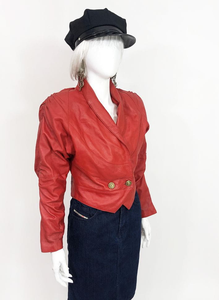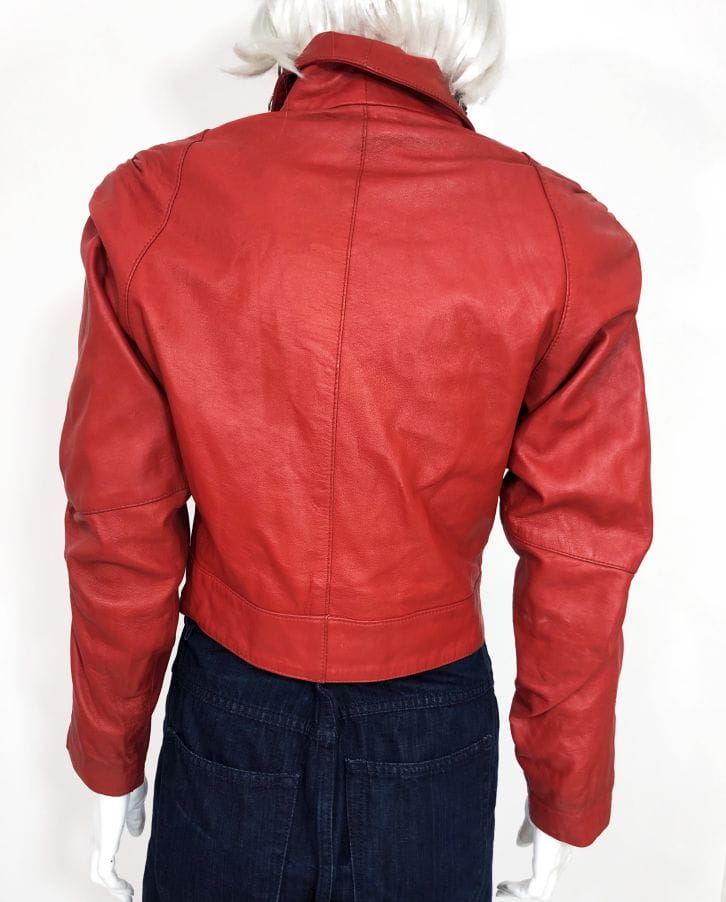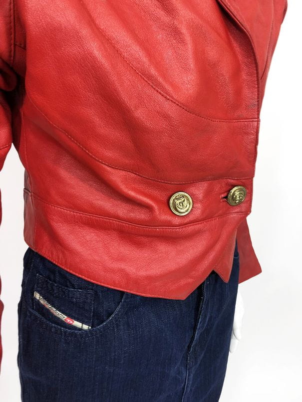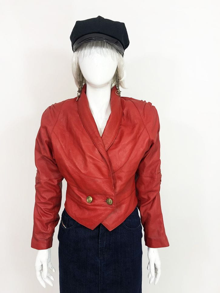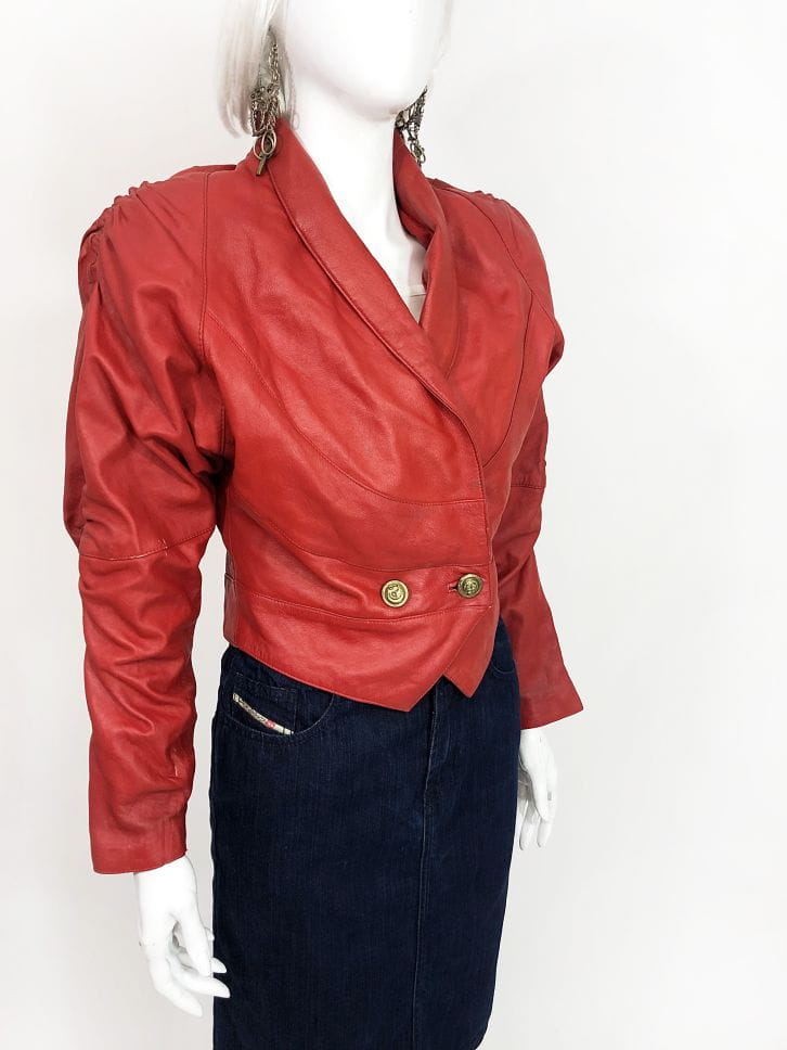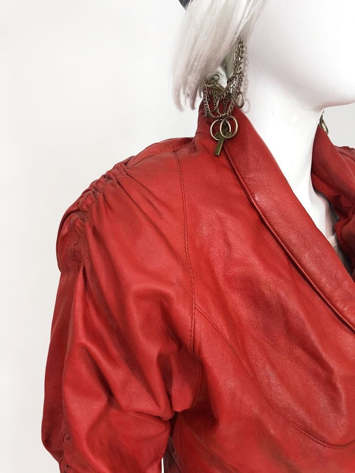 Kurtka vintage wykonana z miękkiej skóry naturalnej w krwistym czerwonym odcieniu. Krótki krój z obszerniejszą górą i dopasowanym dołem. Obniżona linia pach. Ramiona obszerniejsze, lekko wypełnione od środka. Zapinana w pasie na dwa ozdobne guziki. Długie rękawy z marszczeniami. Kurtka posiada kilka obtarć, które jednak średnio kontrastują z czerwonym kolorem skóry i nie rzucają się w oczy.