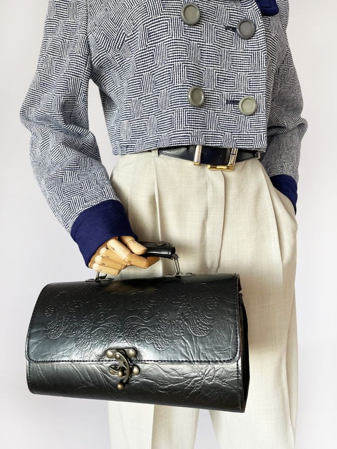Przepiękna stara torba vintage w stylu kuferka lekarskiego. Wykonana z solidnej, grubej skóry licowej w kolorze ciemne czekolady. Klapa dyskretnie zdobiona eleganckimi tłoczonymi wzorami. Wewnątrz duża komora. Zapinana na bigiel. W komplecie pasek.