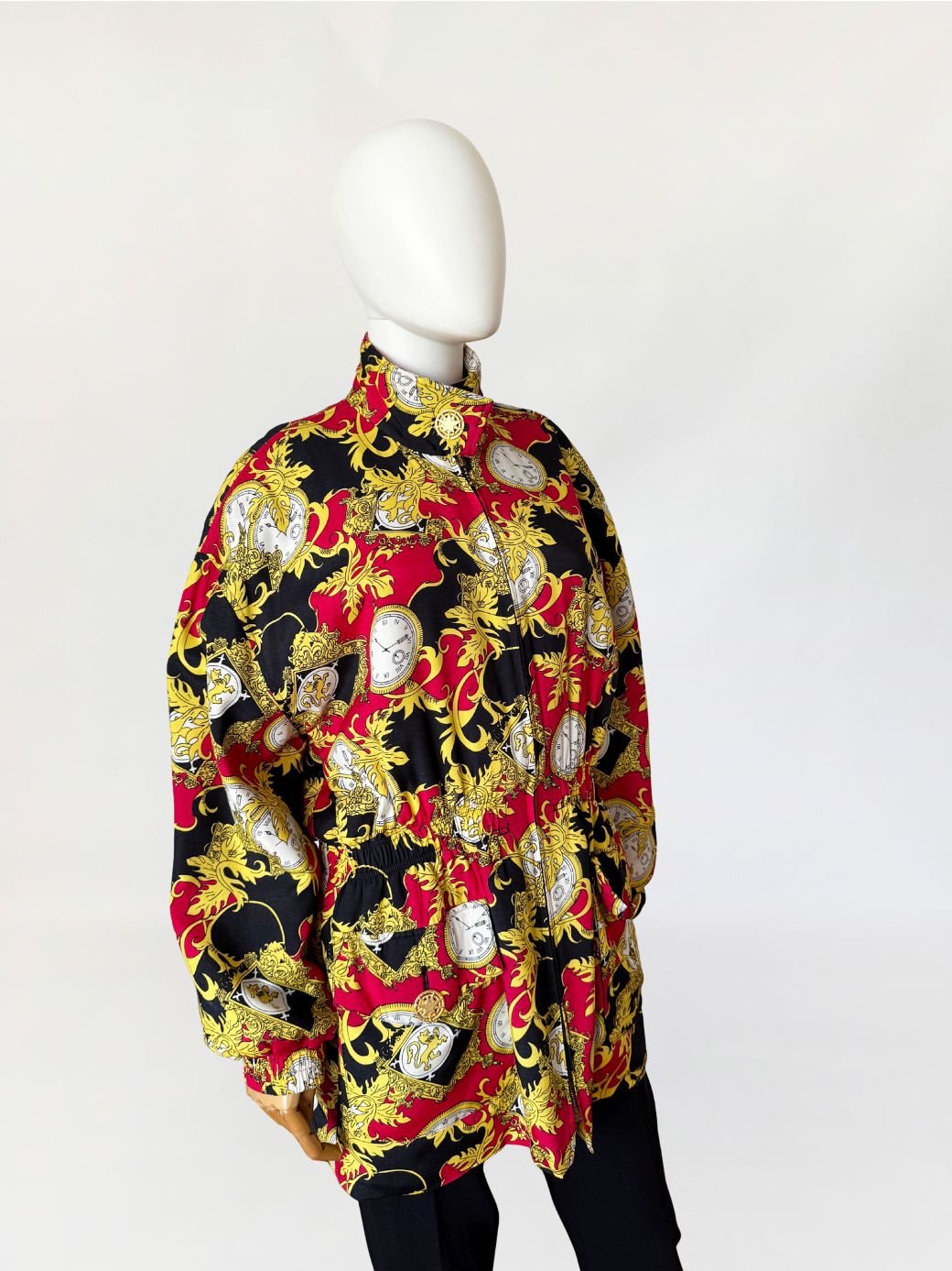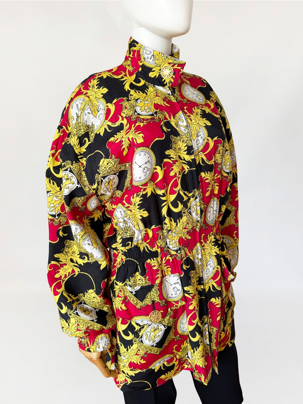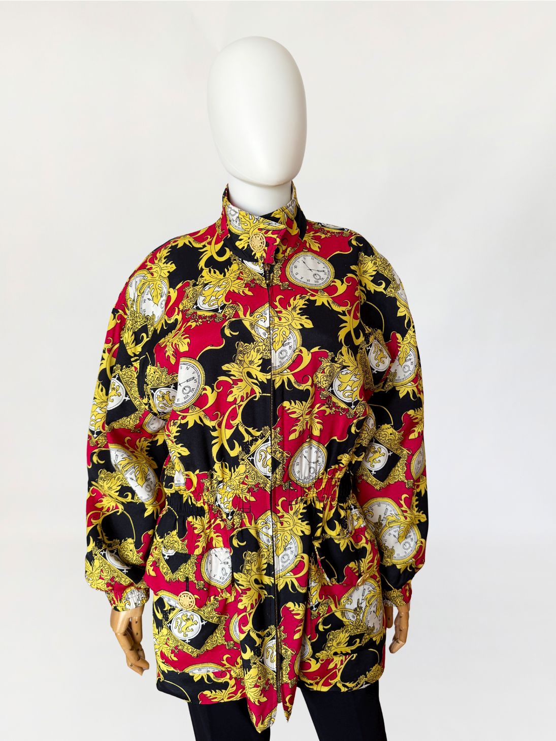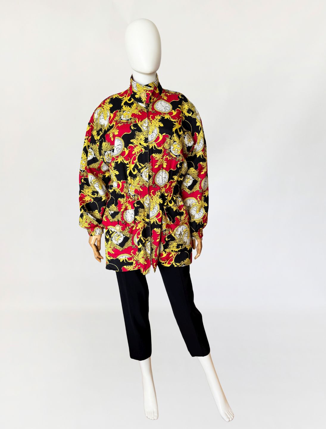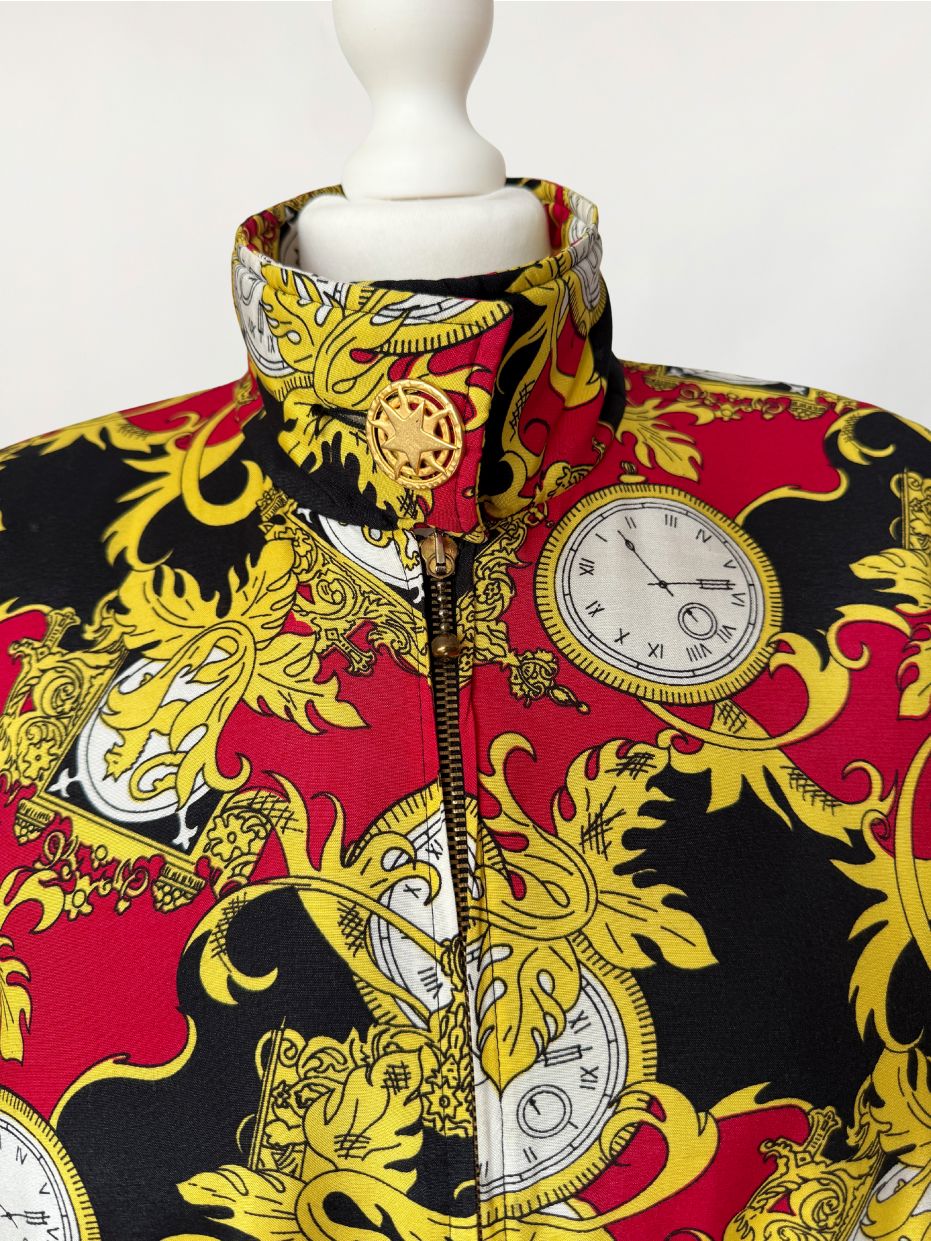 Kurtka vintage wykonana z wiskozy. Tkaninę zdobi intensywny, ornamentalny wzór w barokowym stylu: motywy złotych akantów, herbów i kieszonkowych zegarków na tle czerwieni i czerni. Góra oversize, z wysoką stójką zapinaną na ozdobny guzik ze złotą aplikacją. Długie rękawy z obniżoną linią ramion. W talii wszyty elastyczny ściągacz, który nadaje sylwetce proporcji i lekko ją modeluje. Zapięcie na suwak biegnące przez całą długość oraz dwie obszerne kieszenie z patkami. Tył gładki, w całości pokryty wzorem.