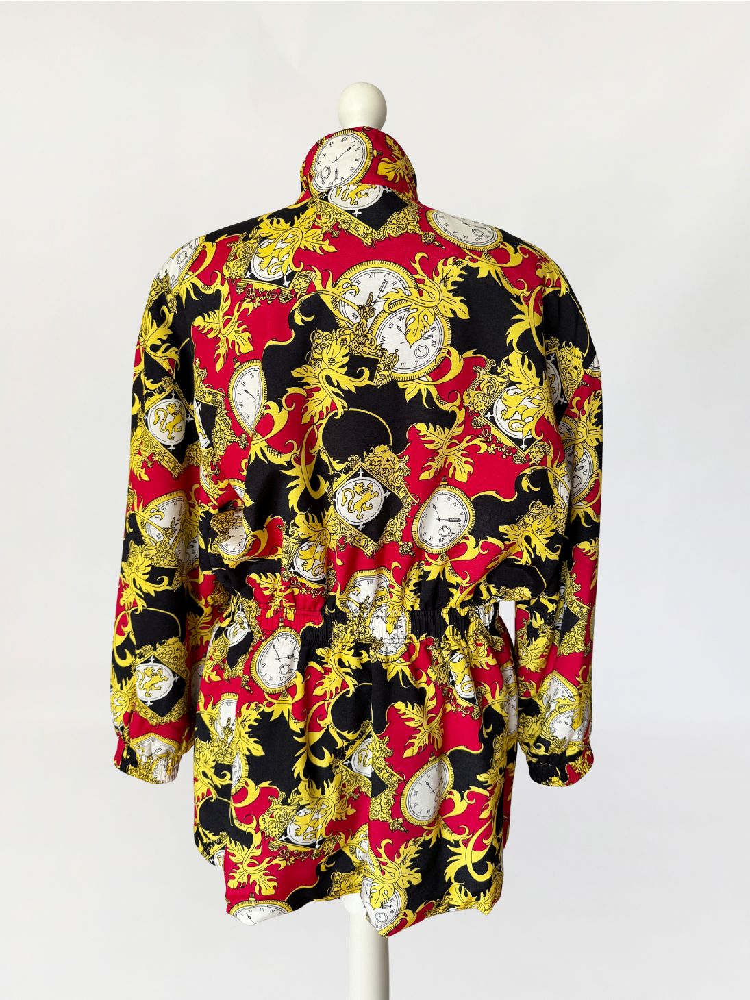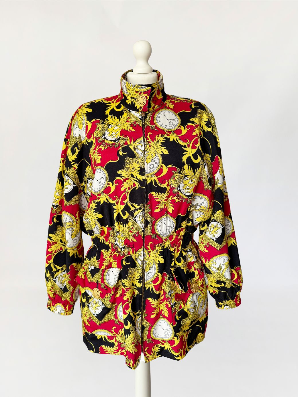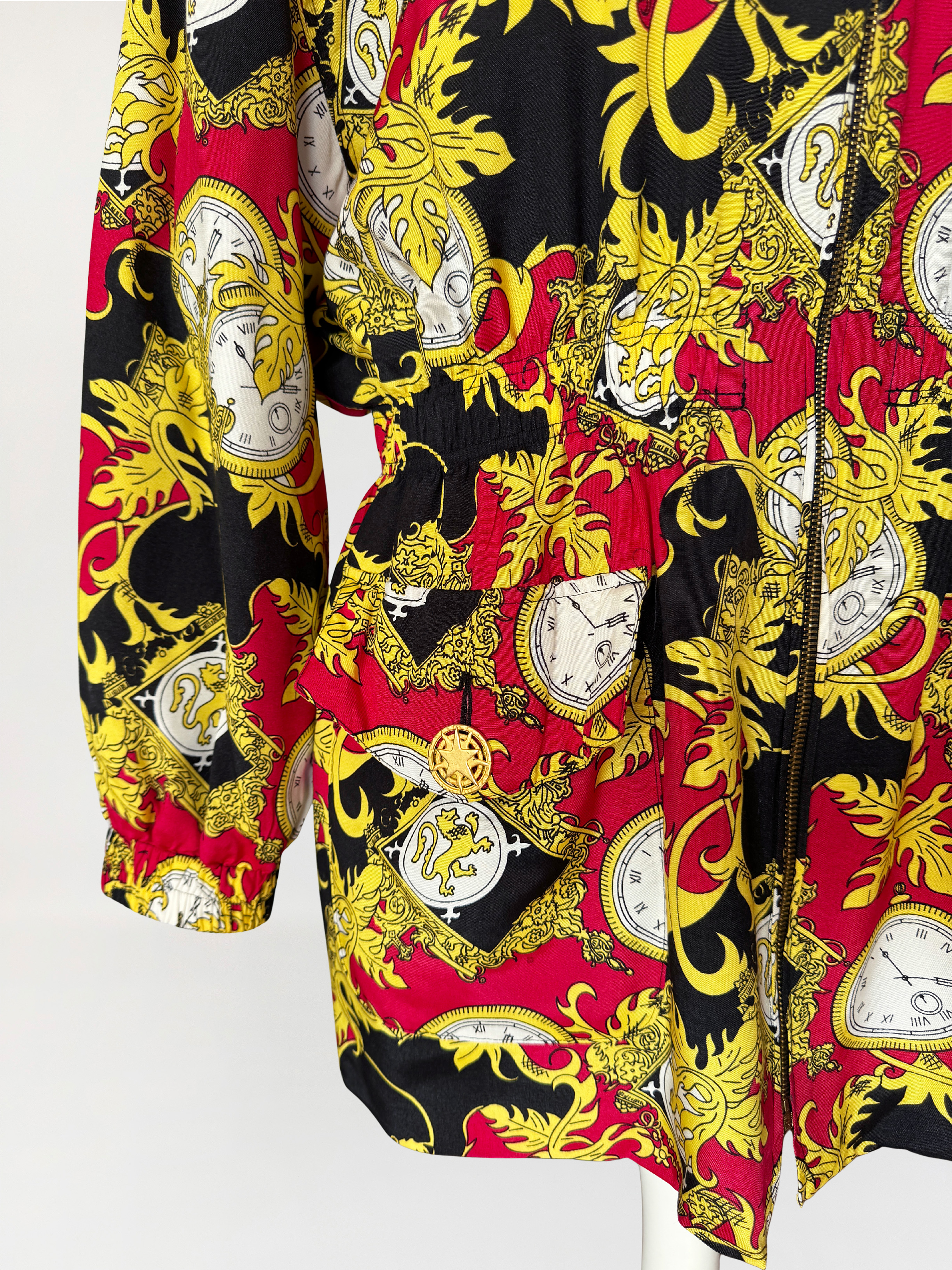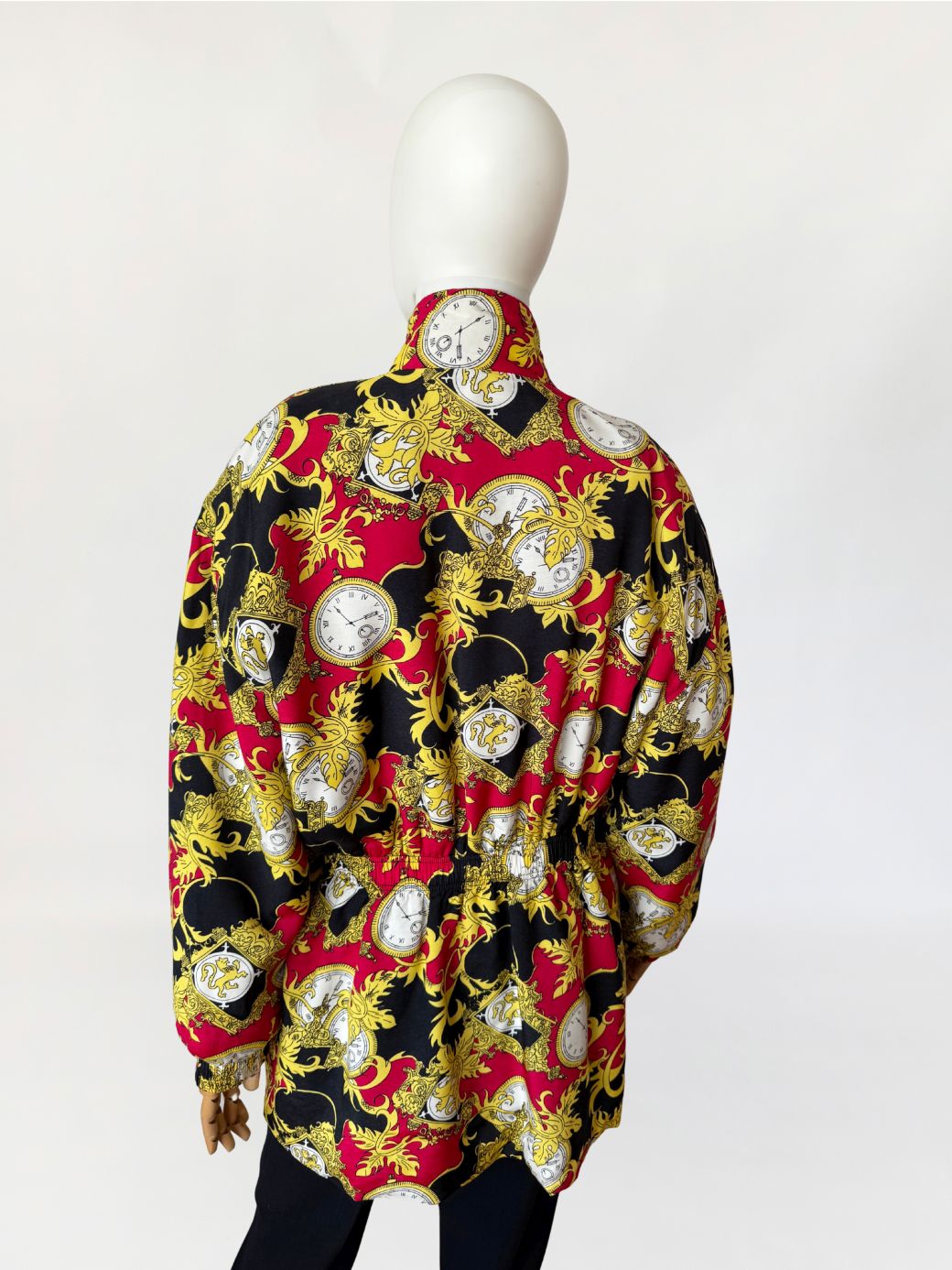 Kurtka vintage wykonana z wiskozy. Tkaninę zdobi intensywny, ornamentalny wzór w barokowym stylu: motywy złotych akantów, herbów i kieszonkowych zegarków na tle czerwieni i czerni. Góra oversize, z wysoką stójką zapinaną na ozdobny guzik ze złotą aplikacją. Długie rękawy z obniżoną linią ramion. W talii wszyty elastyczny ściągacz, który nadaje sylwetce proporcji i lekko ją modeluje. Zapięcie na suwak biegnące przez całą długość oraz dwie obszerne kieszenie z patkami. Tył gładki, w całości pokryty wzorem.
