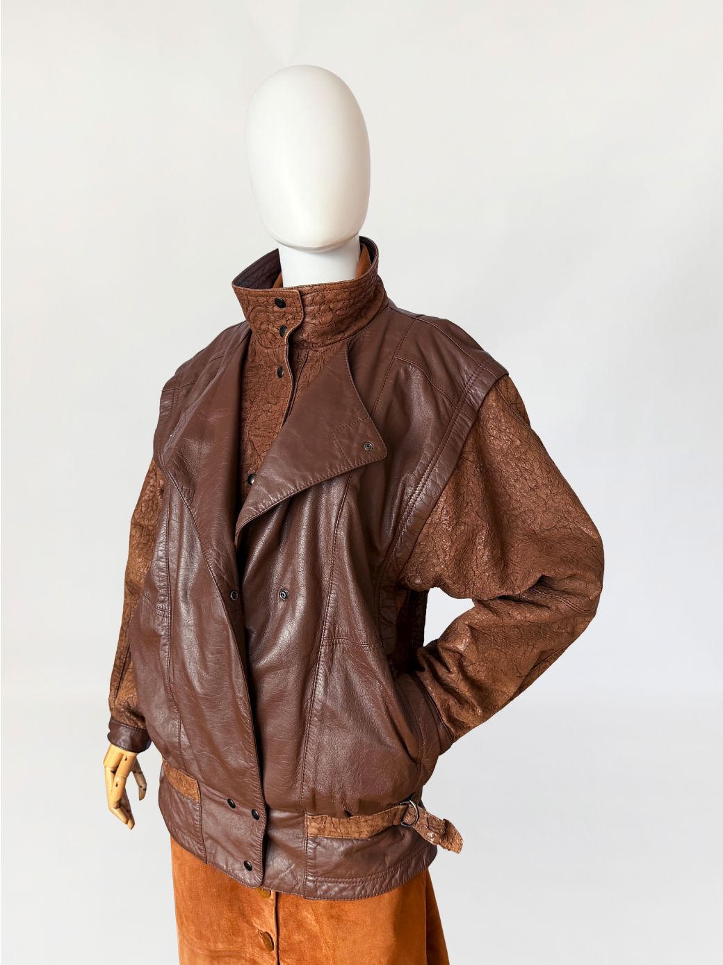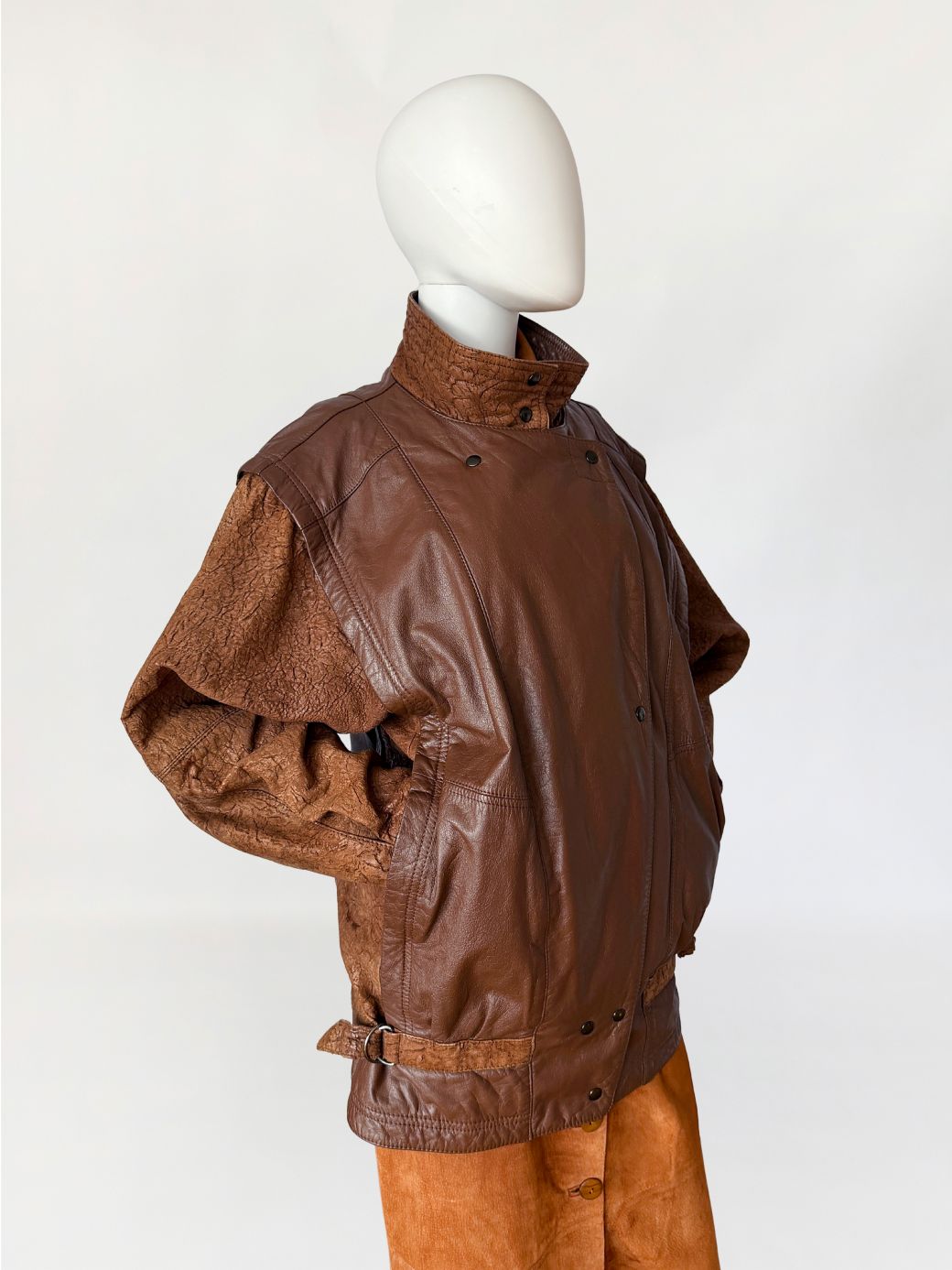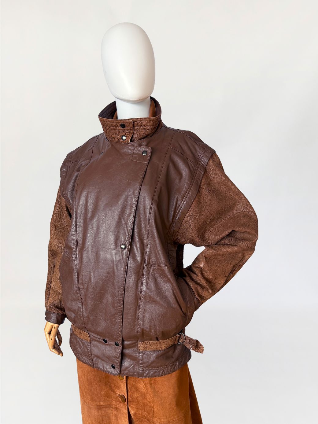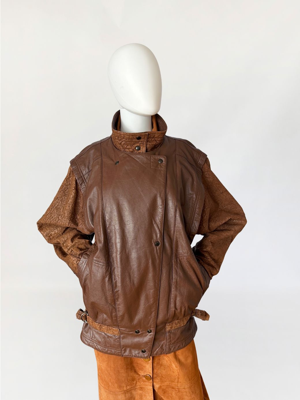 Kurtka vintage wykonana ze skóry naturalnej w brązowym kolorze. Korpus uszyty ze skóry licowej o gładkiej powierzchni, rękawy oraz wewnętrzna część wysokiej stójki z kontrastowej skóry o fabrycznie spękanej, nieregularnej fakturze. Fason o swobodnej, lekko oversize’owej linii, z obniżoną linią ramion i szerokimi rękawami. Po bokach wsuwane kieszenie. Ramiona podkreślone konstrukcyjnie, z przeszyciami modelującymi przód. Zapięcie na metalowe napy, z dodatkową patką przy kołnierzu. Stójka zapinana pod szyję na napy. Dół wykończony paskiem z regulacją obwodu po bokach, zapinanym na metalowe klamry typu d-ring. Całość wykończona podwójnymi przeszyciami w tonacji skóry.