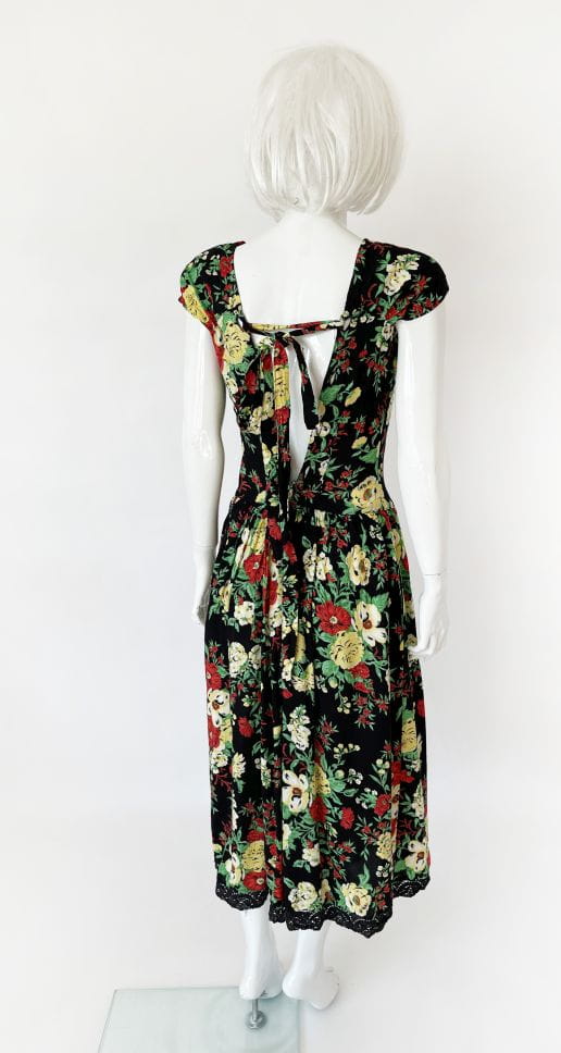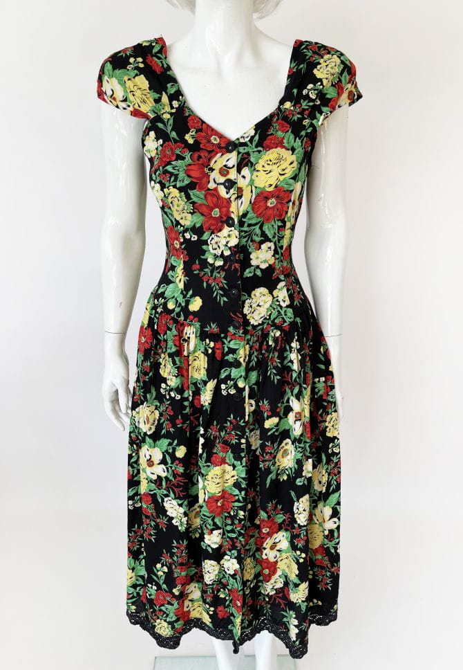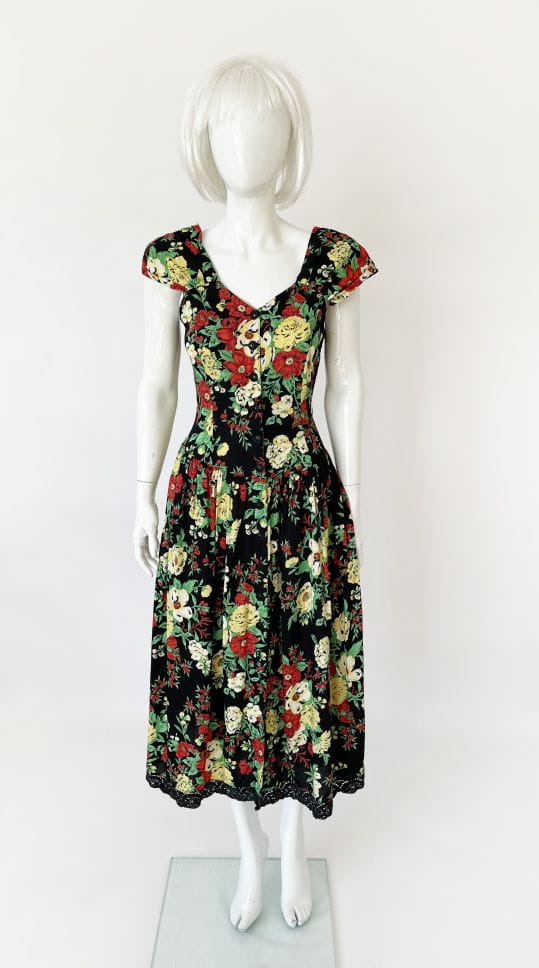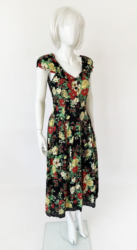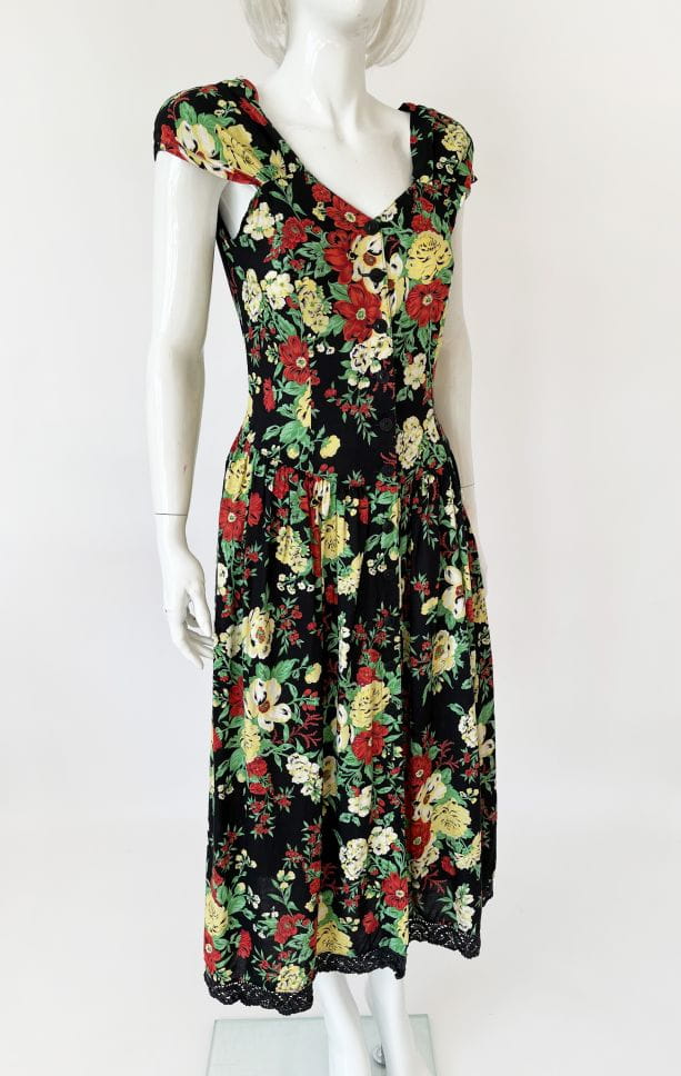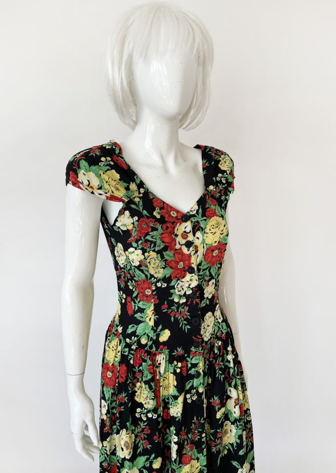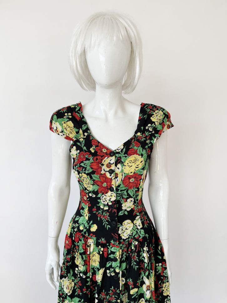 Długa sukienka vintage o deseniu w kwiatowe wzory. Rozpinany model. Góra z krótkimi rękawami, w ramionach niewielkie poduszki. Rozłożysty dół z wpuszczanymi kieszeniami. Model bez podszewki.