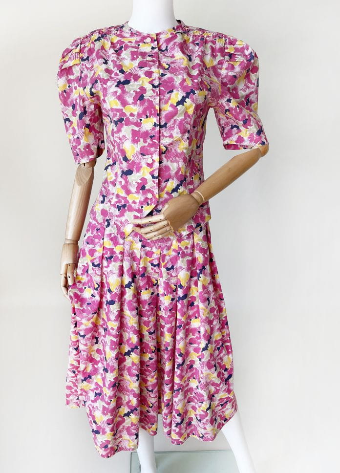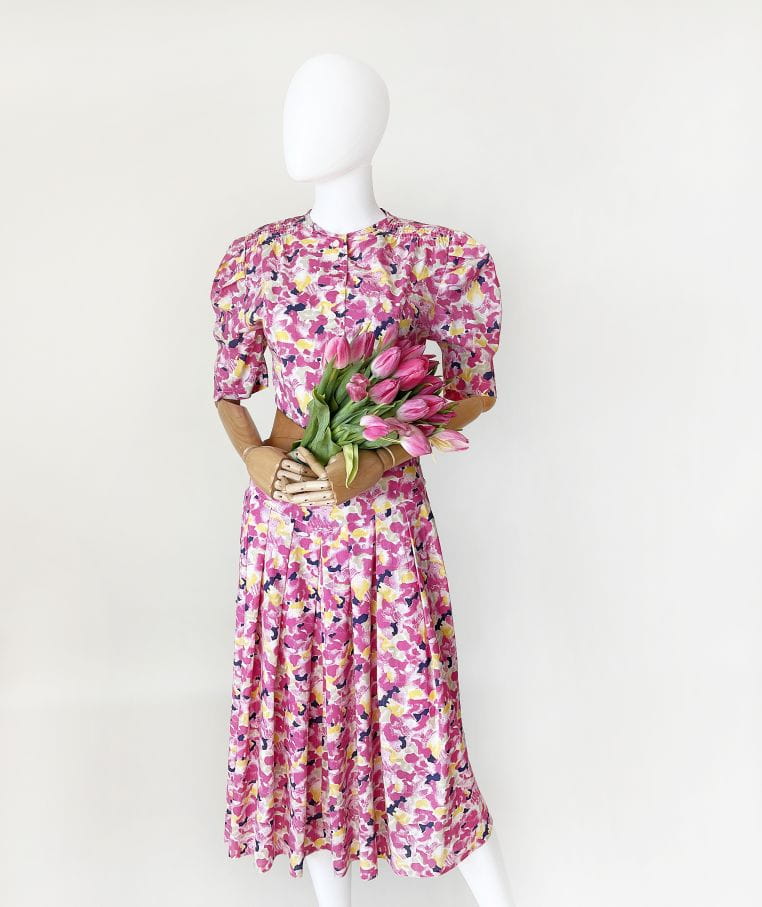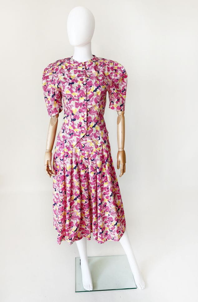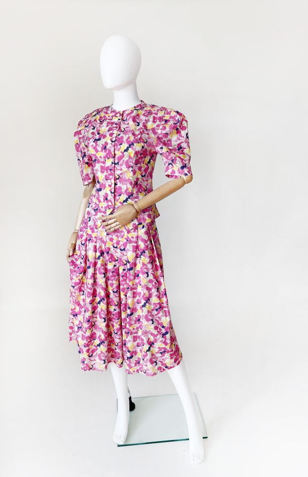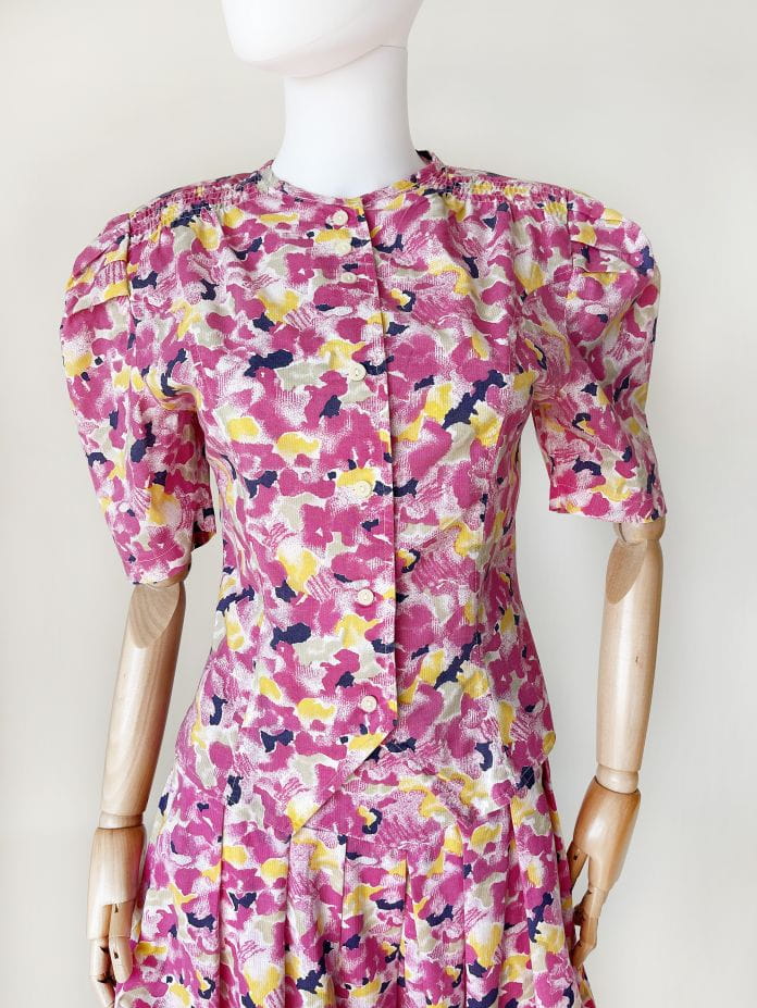 Kolorowy set vintage z lat 80-tych. Wykonany z bawełnianej tkaniny o deseniu w kwiatowe wzory. Rozpinana bluzka z krótkimi rękawami, w ramionach drapowana, od wewnątrz poduszki. Lekko taliowany fason. Spódnica z wyższym stanem i trójkątnym karczkiem. Rozkloszowany fason z kontrafałdami. Bez podszewki.