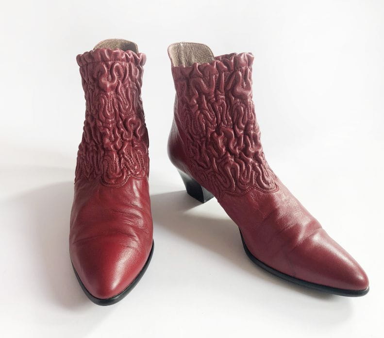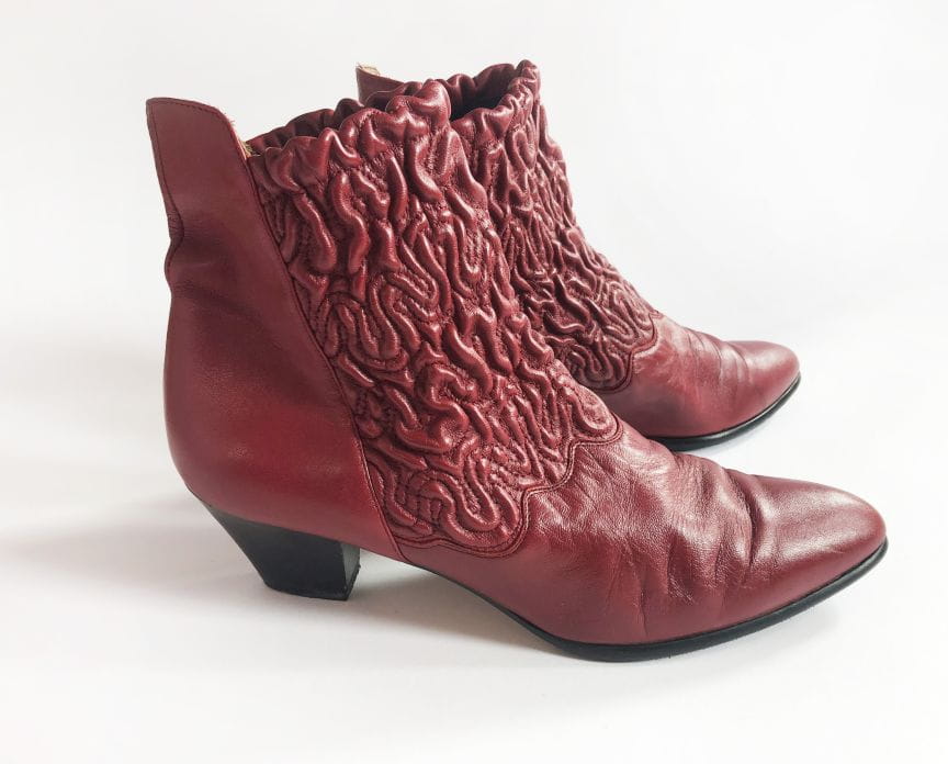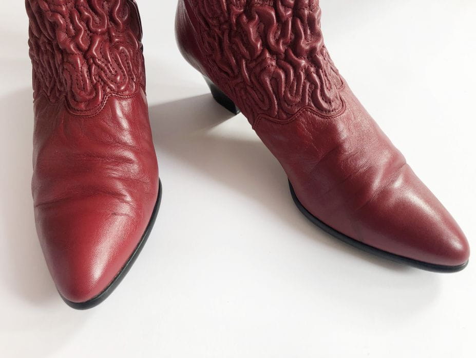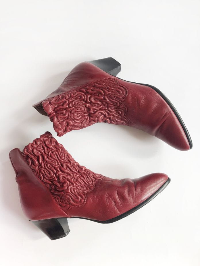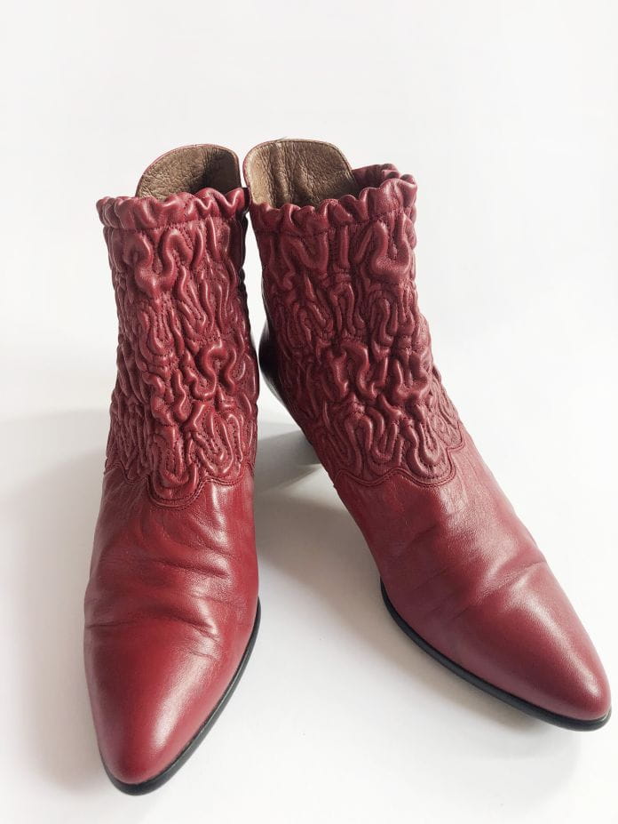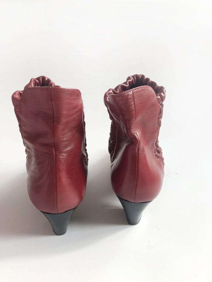Włoskie botki wykonane z miękkiej skóry naturalnej w ciemno-czerwonym kolorze. Stabilny niski obcas. Noski typu migdałki. Cholewka z marszczeniami.
