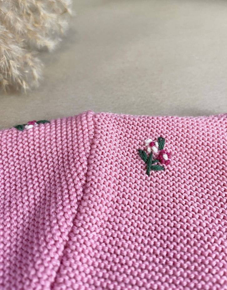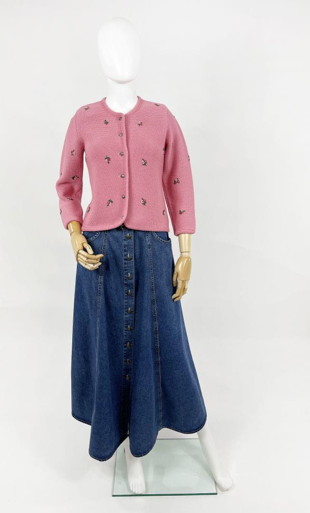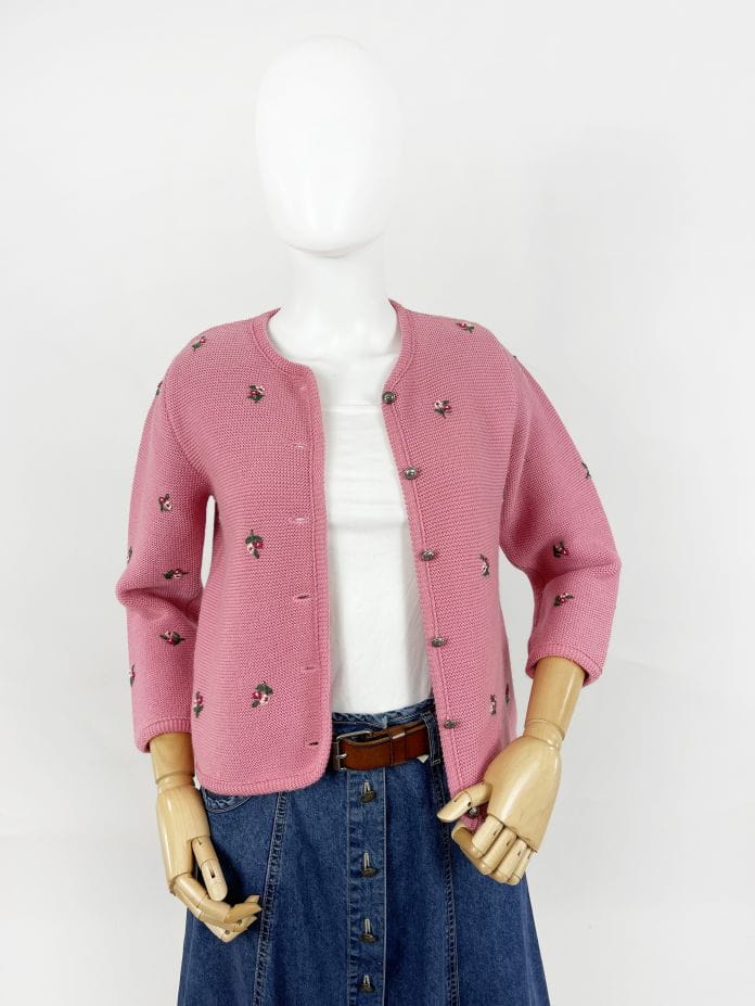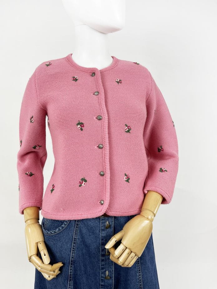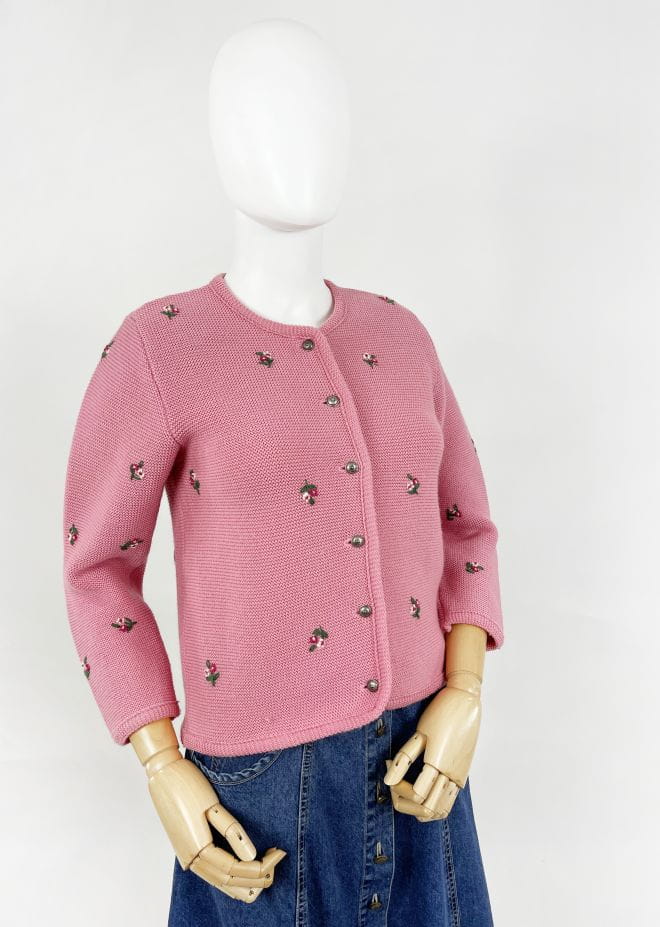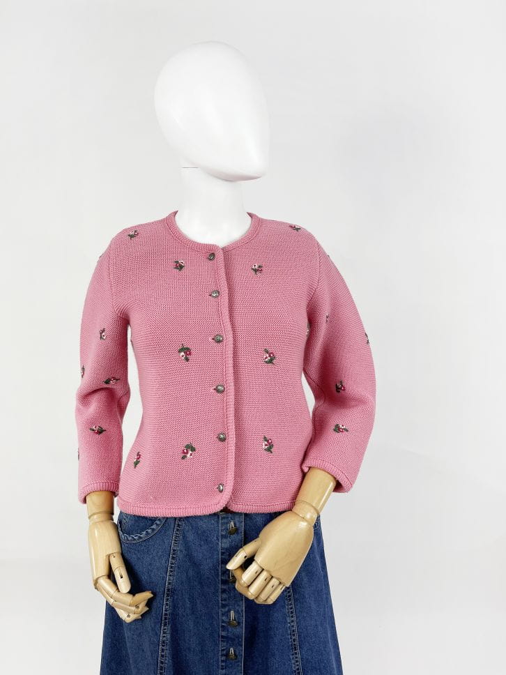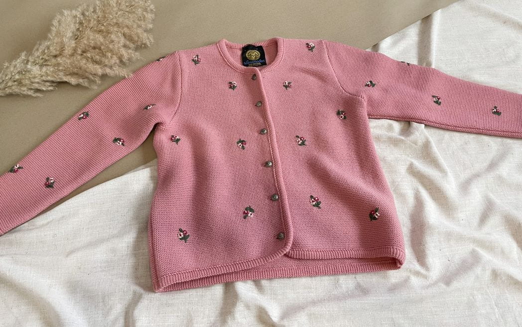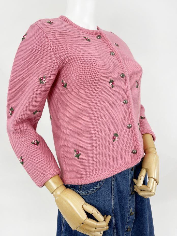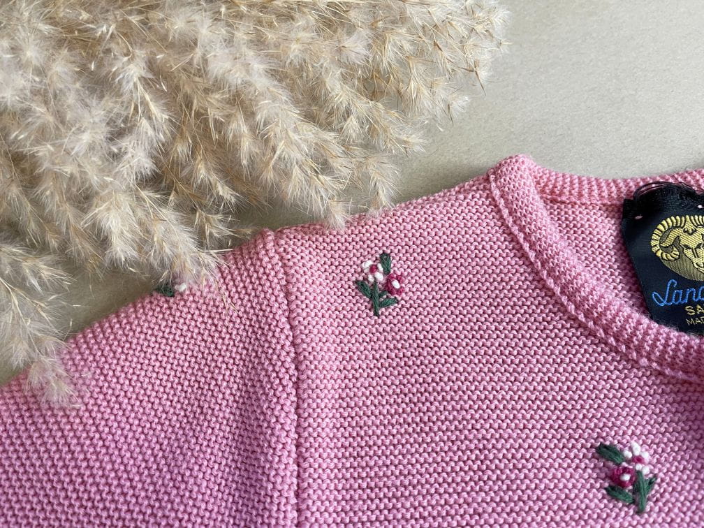 Uroczy austriacki sweter marki Lanamoden. Wykonany z miękkiej, sprężystej wełny dziewiczej. Model w kolorze różowym, na całości dzianiny wyszywane drobne kwiatowe hafty, które dodają mu lekkości i dziewczęcego uroku. Krótki fason z okrągłym dekoltem, rękawy 7/8. Zapinany na drobne metalowe guziki, zapasowy w komplecie.