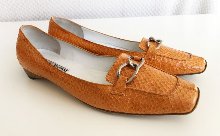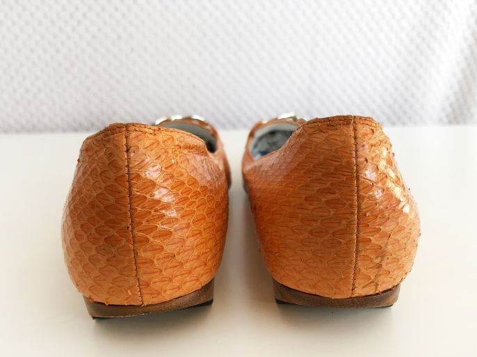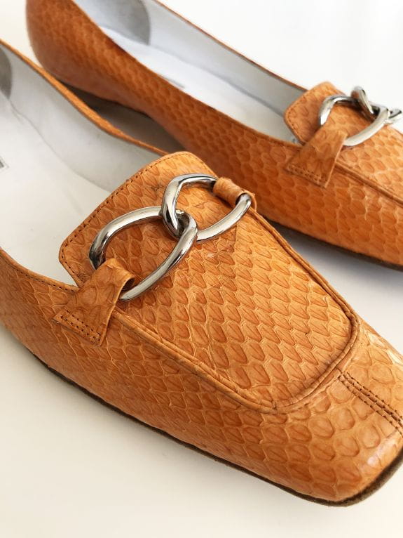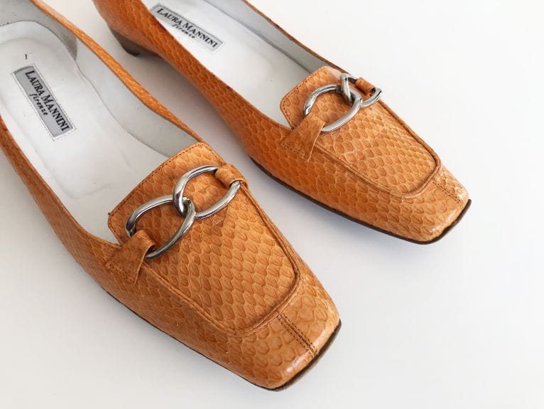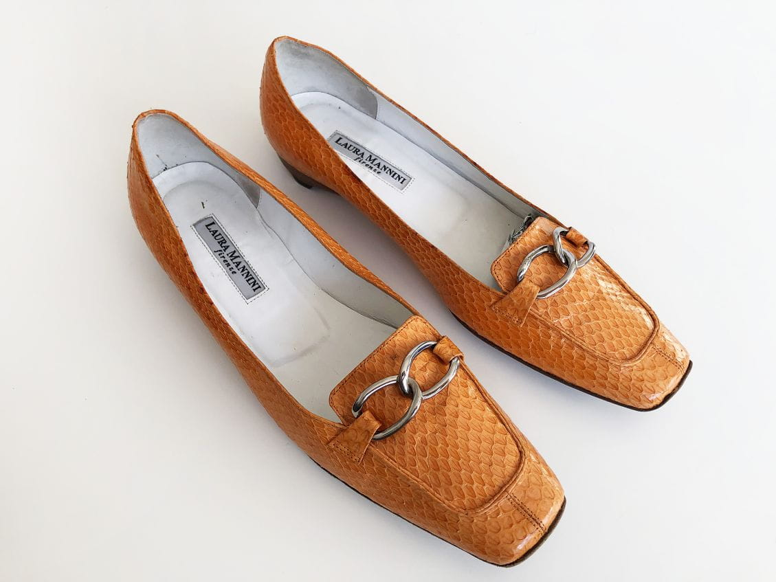 Mokasyny od Laura Mannini wykonane ze skóry naturalnej w kolorze pomarańczowym. Kwadratowe noski, z przodu srebrne klamry. Model w stylu Gucci
