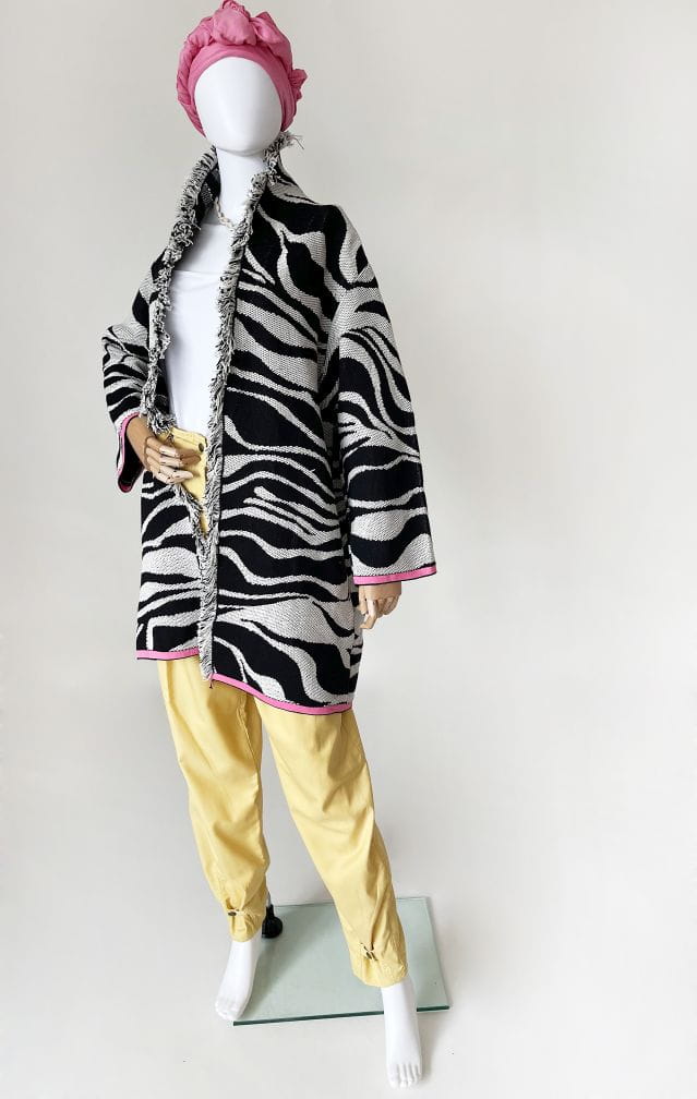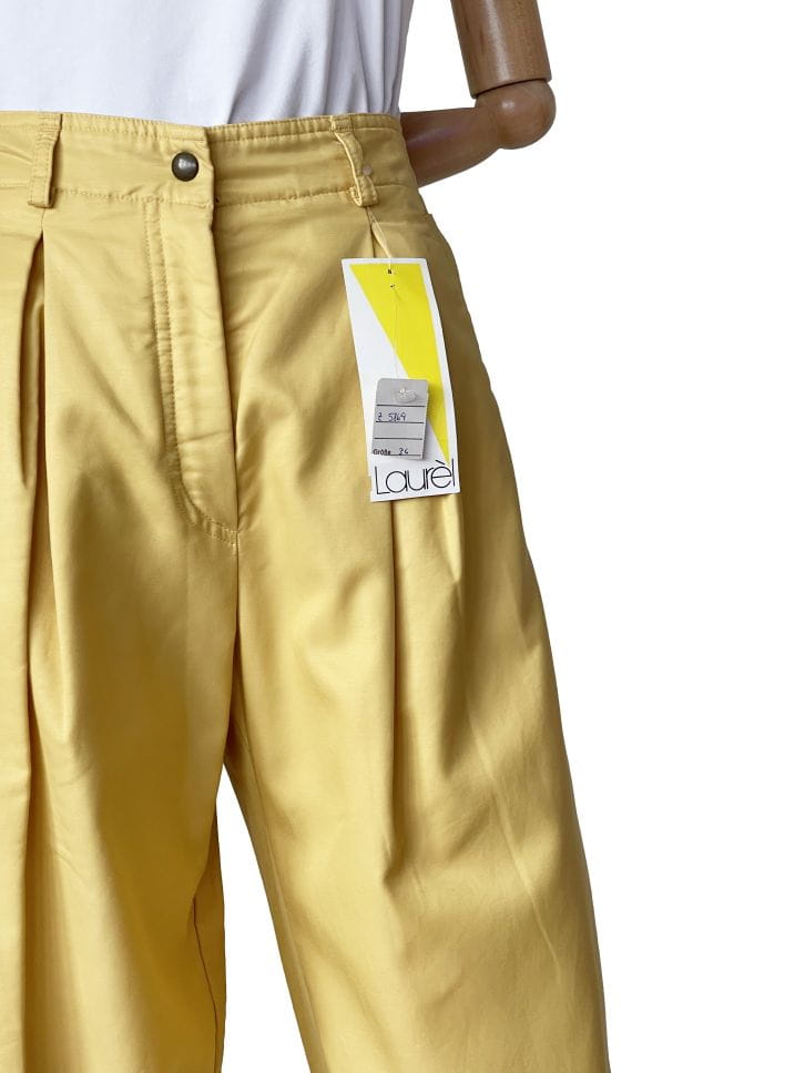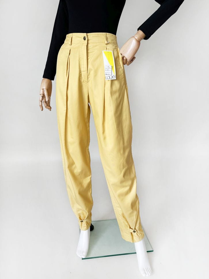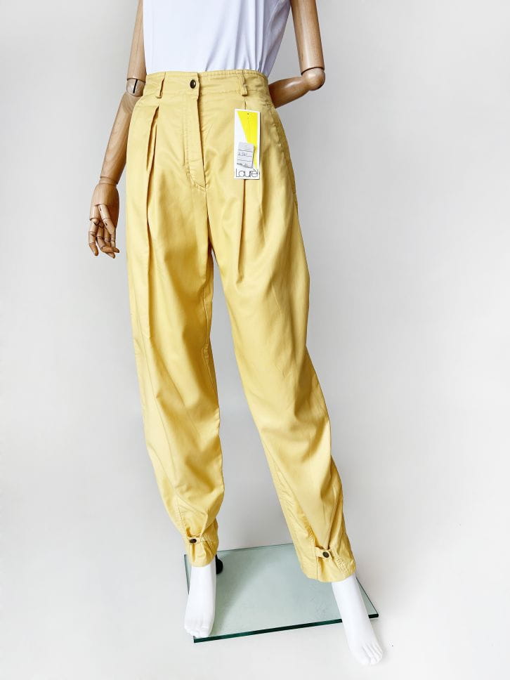Autentyczny egzemplarz vintage z lat 80-tych projektu marki Laurel (tej od Escady). Zachowany z papierową metką, nigdy nie używany. Casual'owe spodnie typu slouchy wykonane z bawełnianej taniny w słonecznym żółtym odcieniu. Nogawki z zaszewkami, szersze w biodrach, zwężają się do dołu. Na końcach nogawek przepinane na napy. U góry po bokach wsuwane kieszenie.