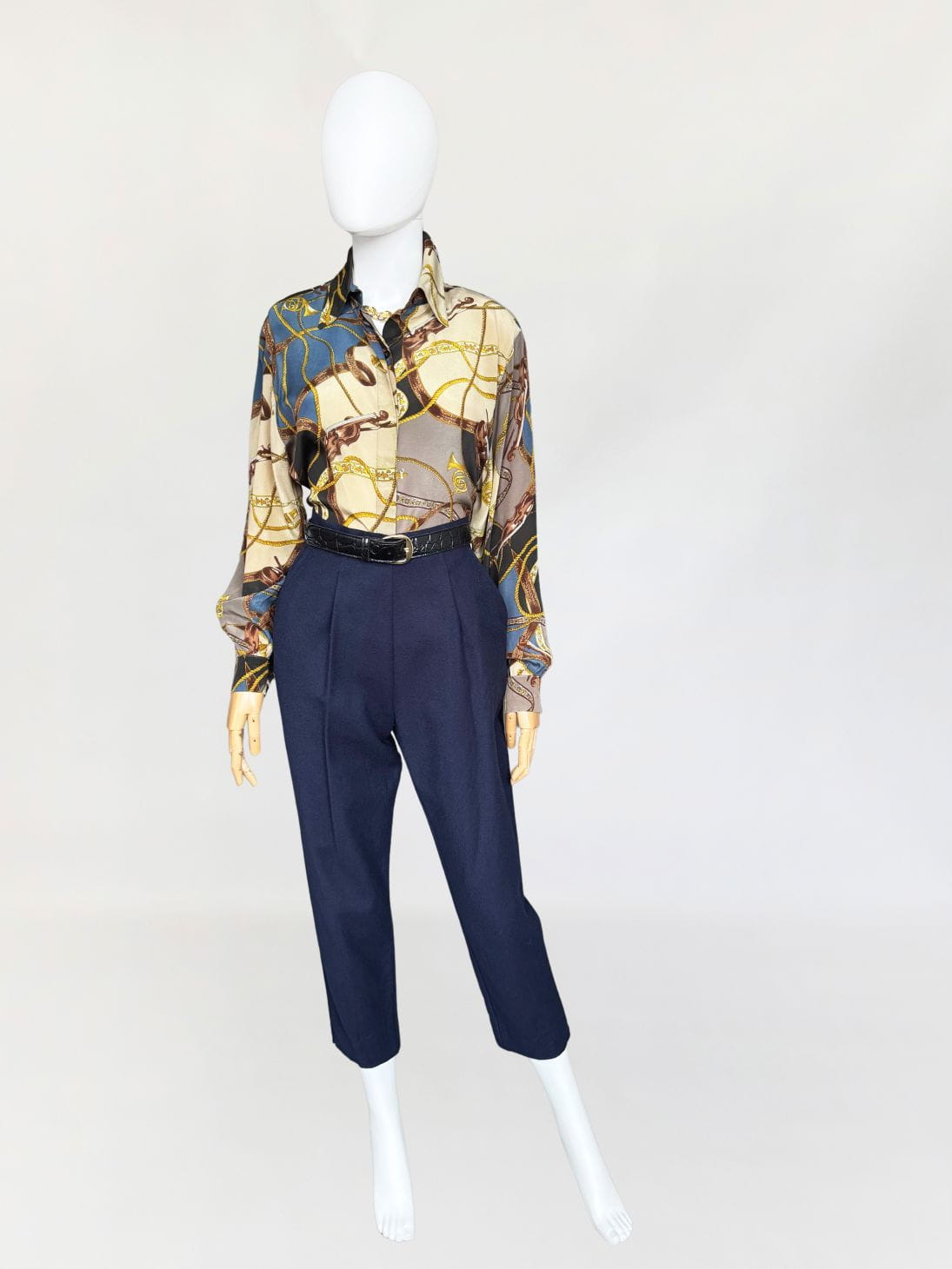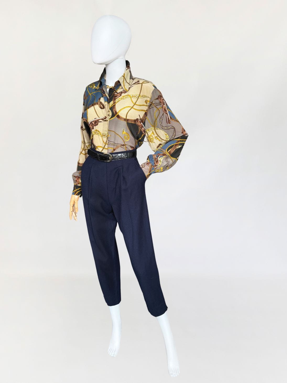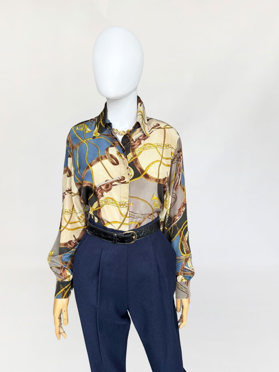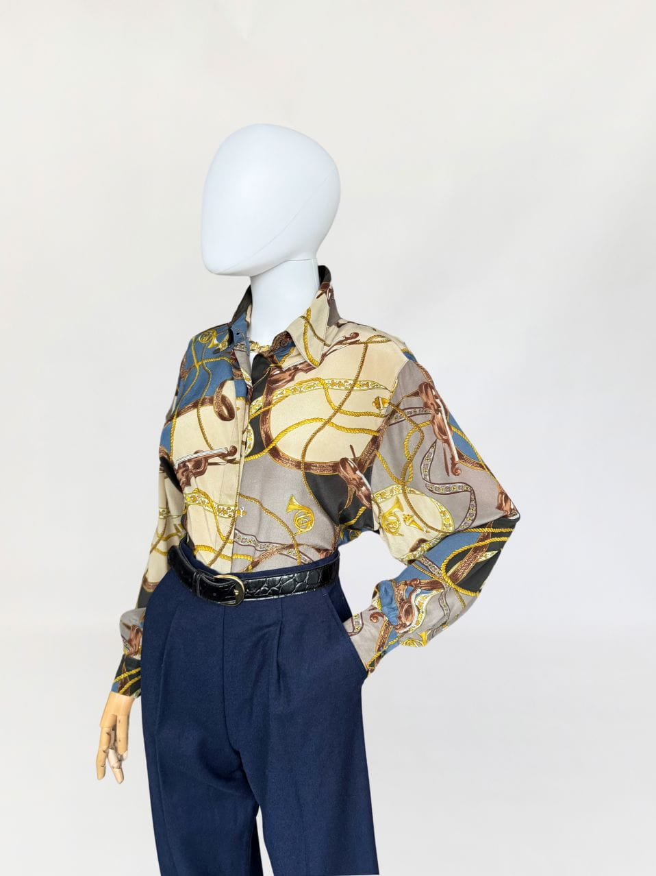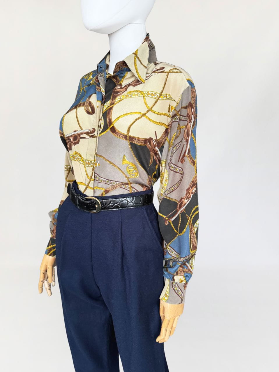 Koszula vintage z lat 80-tych marki Laurel z grupy Escada. Wykonana z jedwabnego szyfonu w muzyczne motywy, mamy tu skrzypce, drobne nutki, puzony a także charakterystyczne dla dekady wzory: łańcuchy i chwosty. Klasyczny fason z dlugimi rękawami.