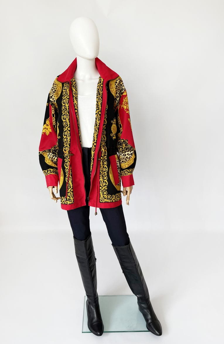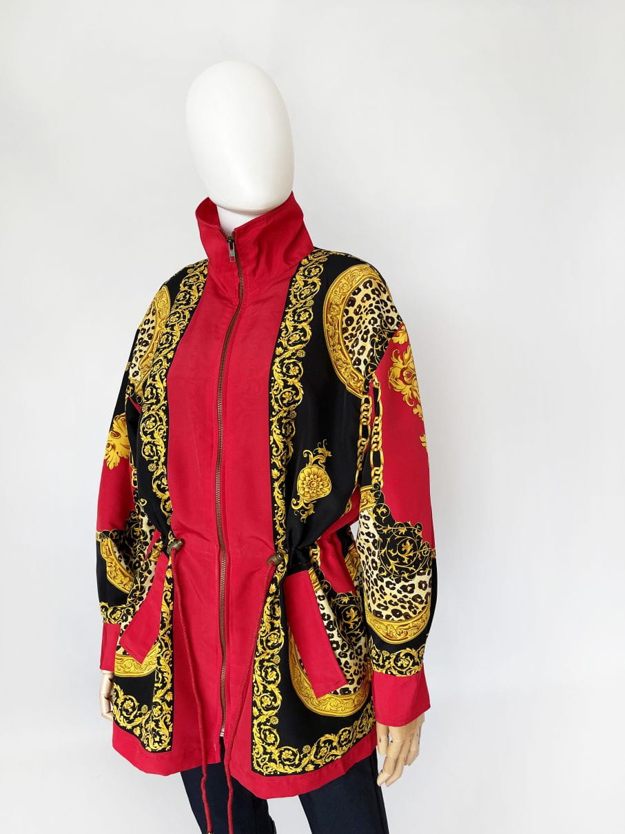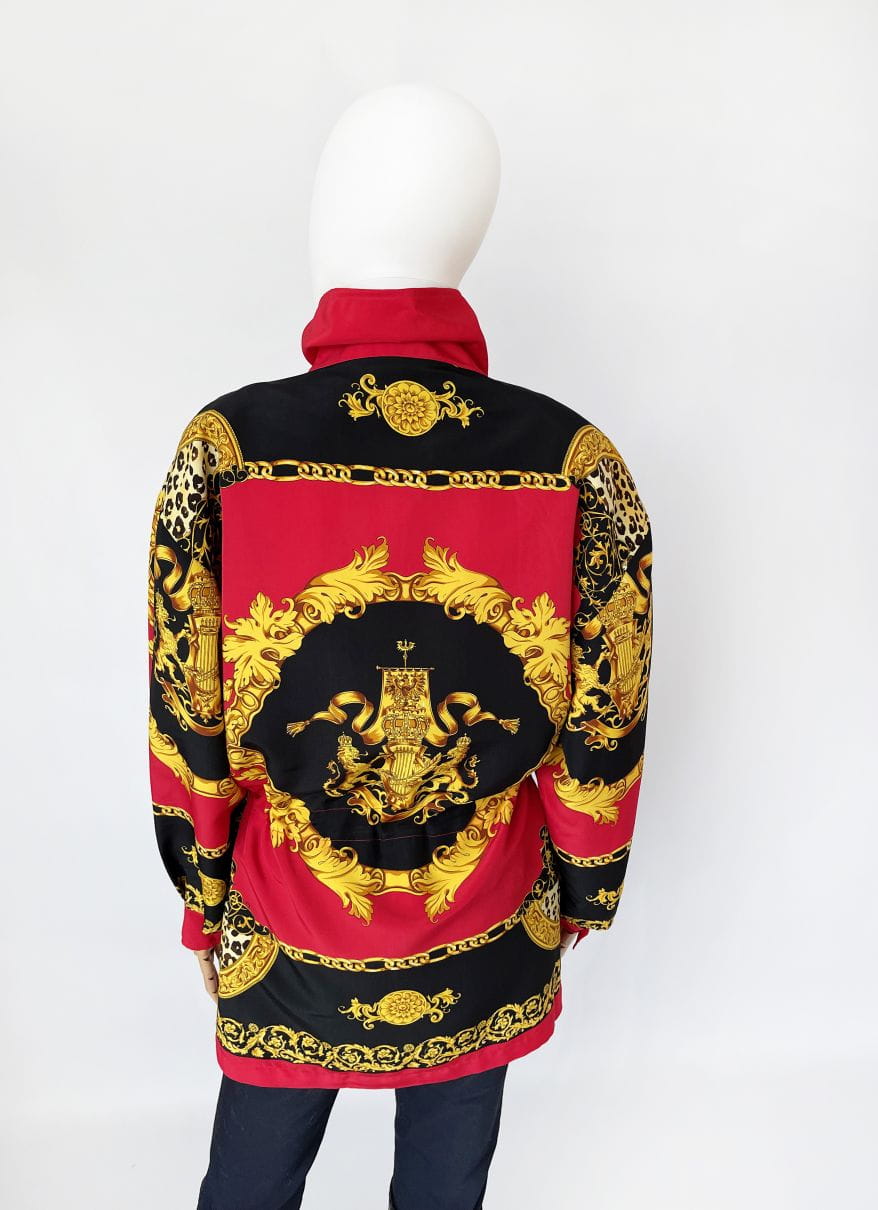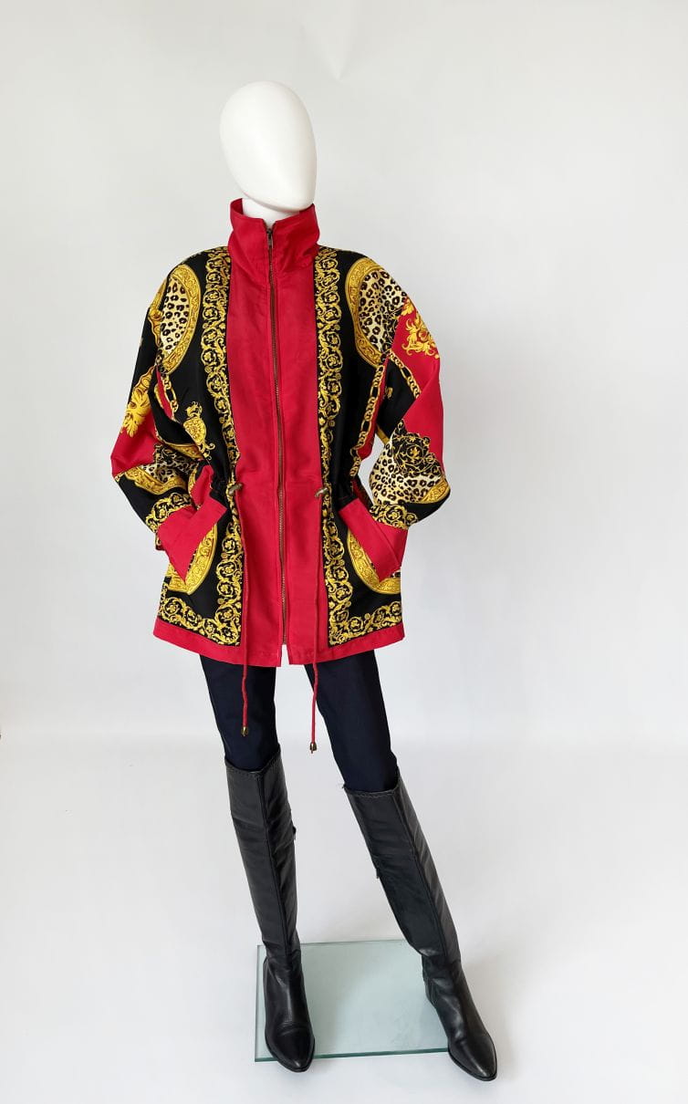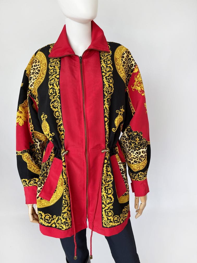 Włoska kurtka vintage wykonana z lekkiej syntetycznej tkaniny o deseniu inspirowanym wzornictwem Versace. Prosty fason z wysoką stójką. Talia regulowana ściągaczem z troczkami. Po bokach wsuwane kieszenie. Kurtka nie ma ocieplenia.