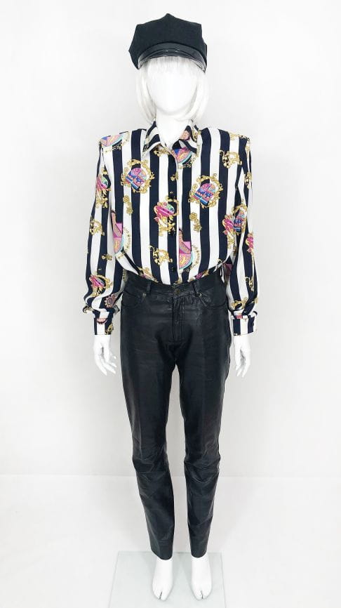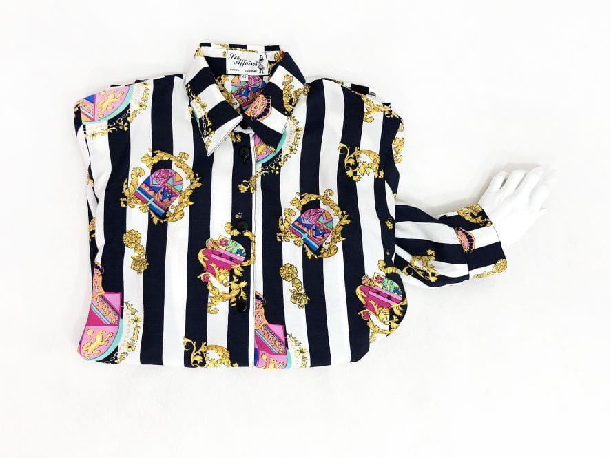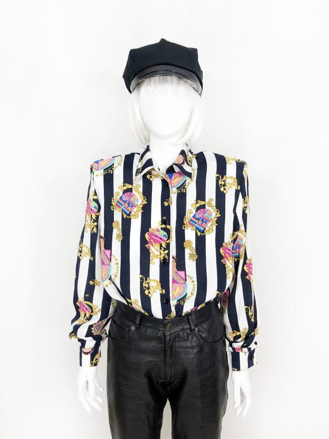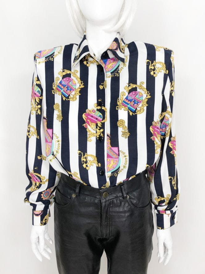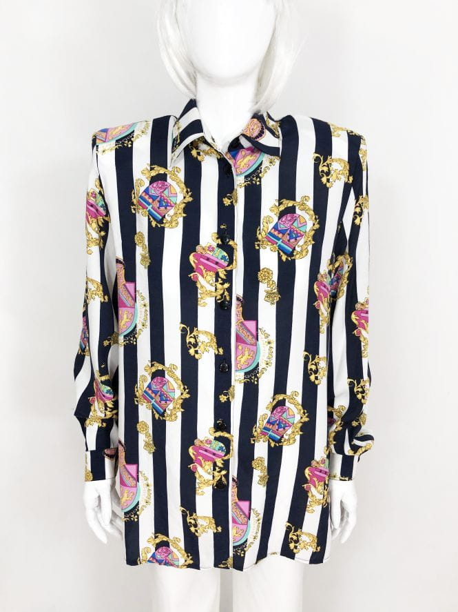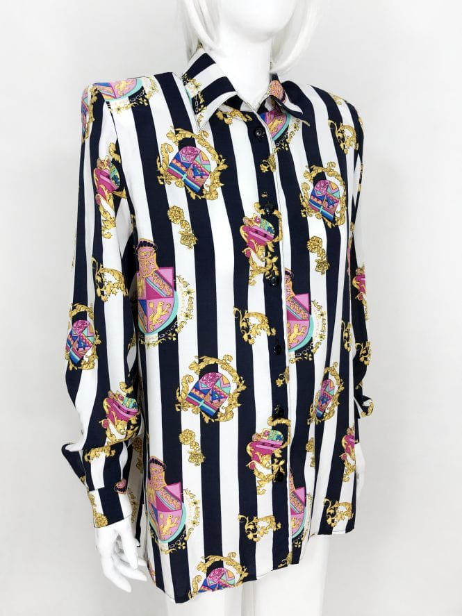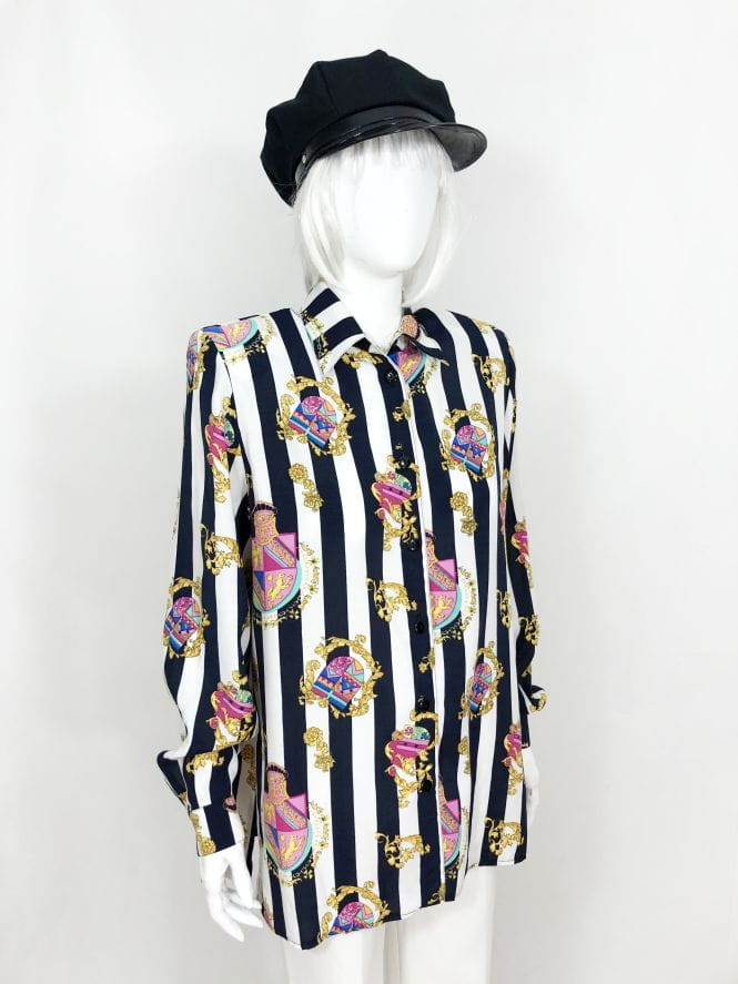 Unikatowa koszula vintage z lat 90-tych. Luźny model w pasy z printami w stylu Versace. W ramionach poduchy. Rozpinana. U dołu po bokach rozcięcia.