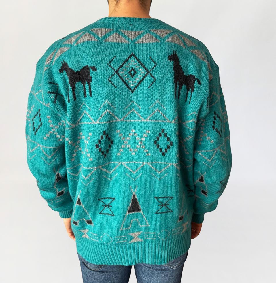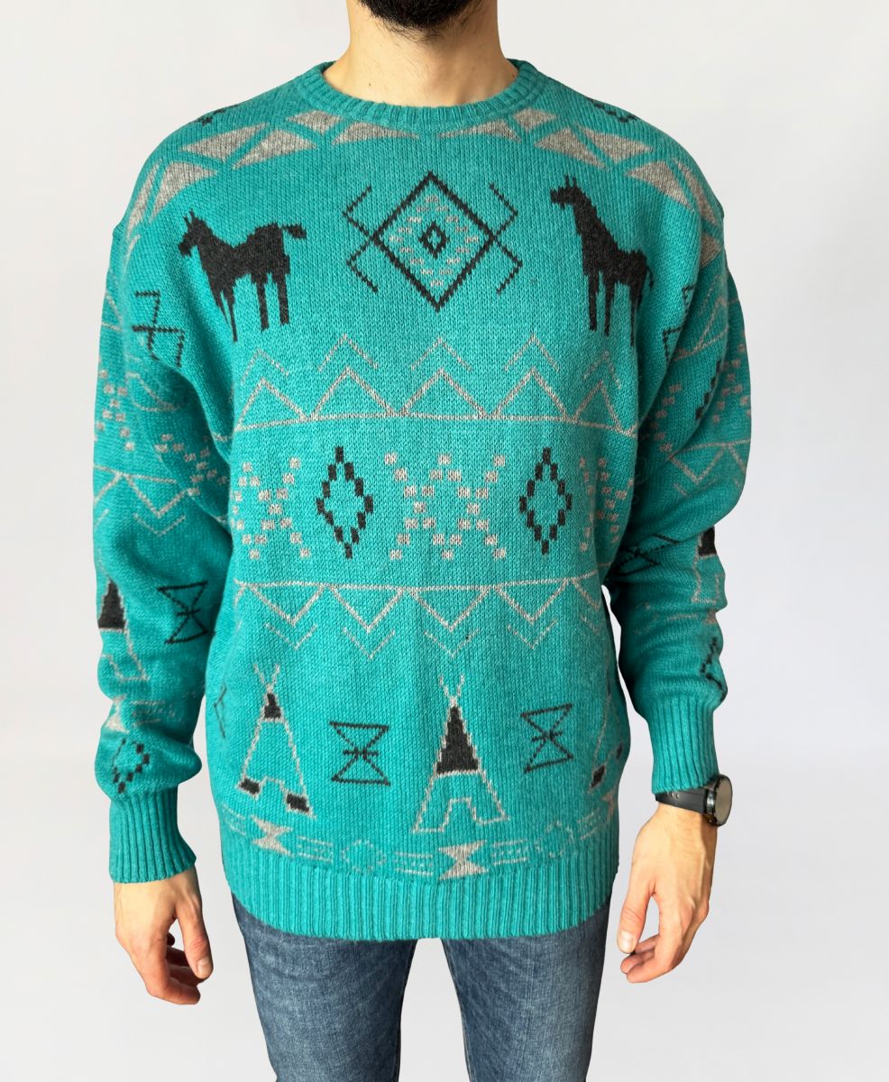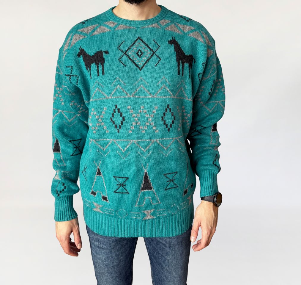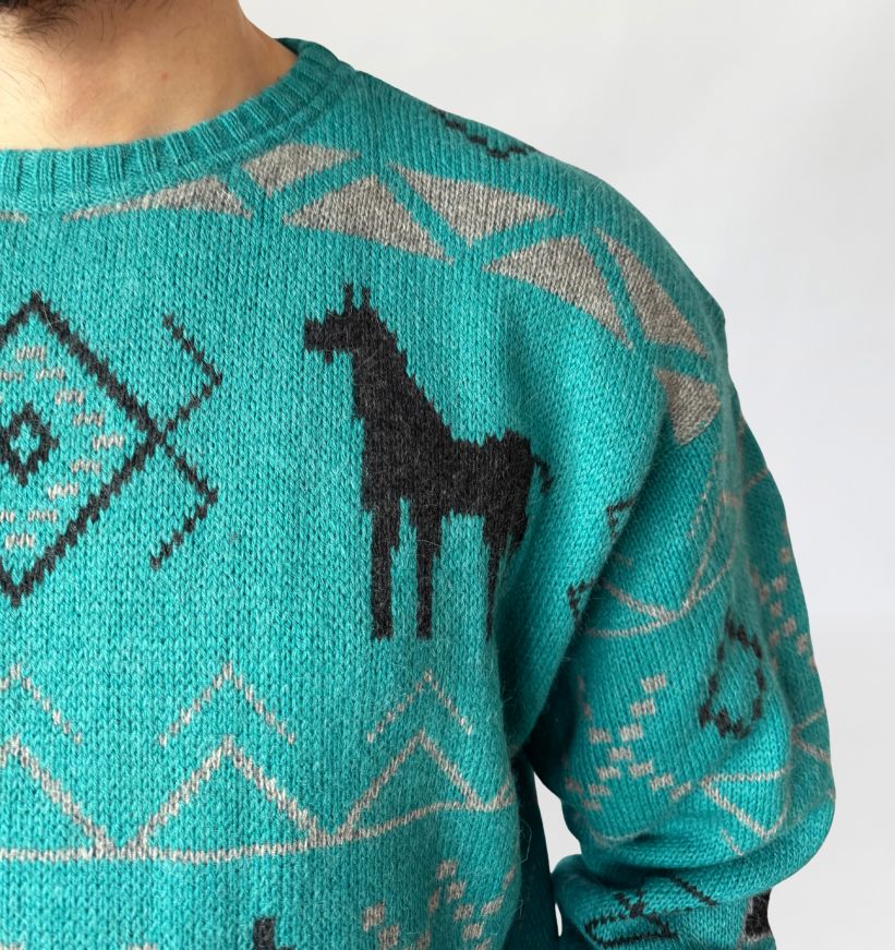 Sweter vintage luksusowej włoskiej marki Les Copains. Model utrzymany w estetyce inspirowanej motywami etnicznymi Ameryki Północnej. Wykonany z dzianiny wełnianej (naszym zdaniem alpaki), o średniej grubości, miękkiej i sprężystej, dobrze trzymającej formę, a jednocześnie komfortowej w noszeniu. Model o klasycznym, prostym kroju z lekko obniżoną linią ramion. Dekolt okrągły, wykończony ściągaczem, podobnie jak mankiety rękawów i dolna krawędź. Całość zdobi geometryczny wzór w kontrastowych kolorach, z charakterystycznymi motywami zwierzęcymi (sylwetki lam/alpak) oraz symbolami inspirowanymi estetyką western i Navajo. Dominujący kolor to turkus, przełamany odcieniami szarości i czerni. Model unisex