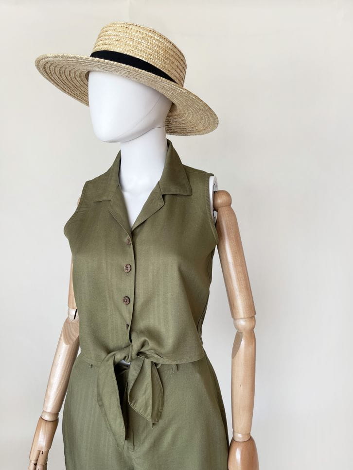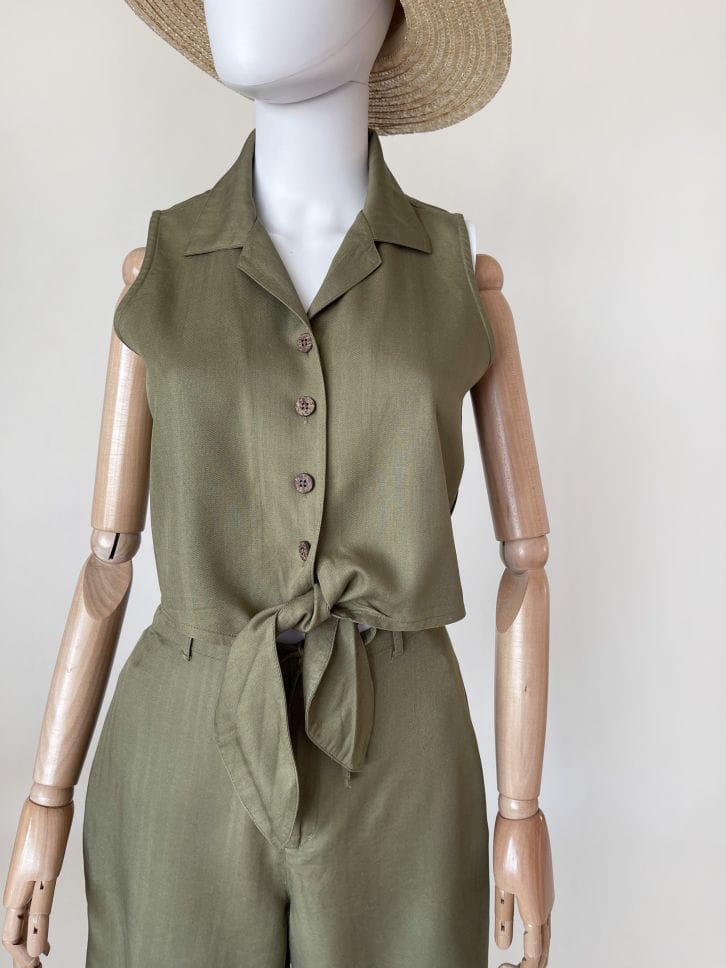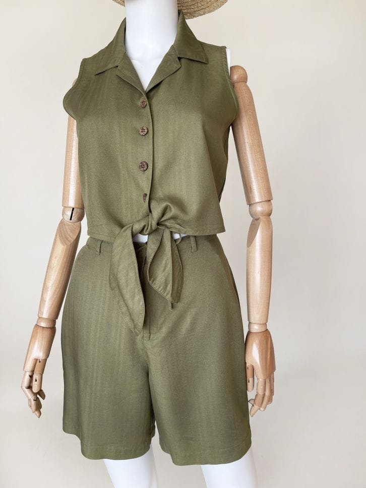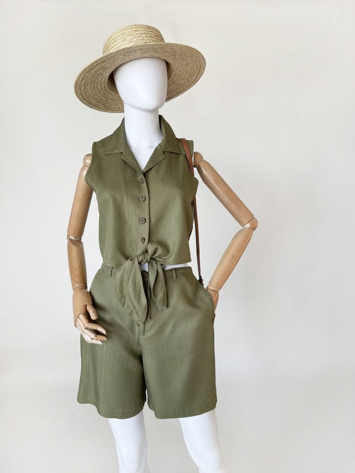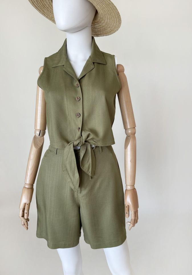 Set vintage wykonany z lekkiego rayonu w kolorze khaki. Doskonały na lato, niezastąpiony podczas wakacyjnych wyjazdów. Góra to koszulowa bluzka bez rękawów. Rozpinany fason z wiązaniem u dołu w pasie. Szorty o lekko podwyższonym stanie ze swobodnymi nogawkami. W pasie z tyłu elastyczna wstawka. Mają kieszenie.