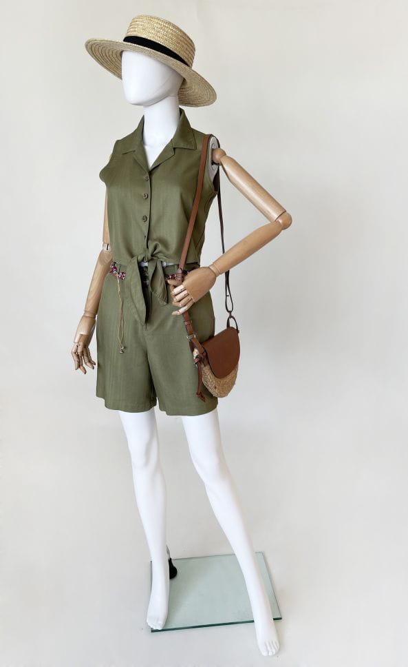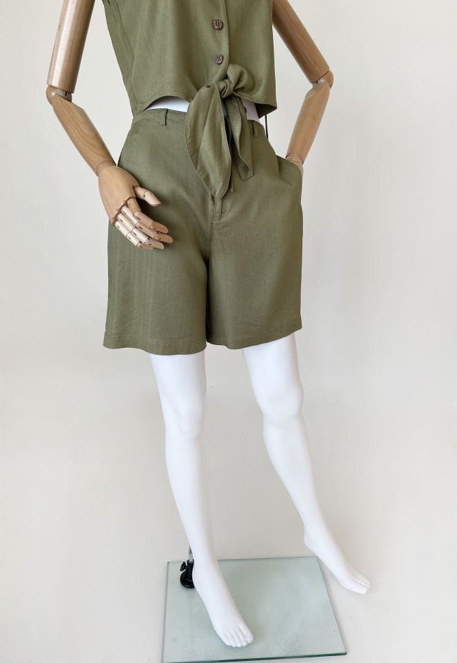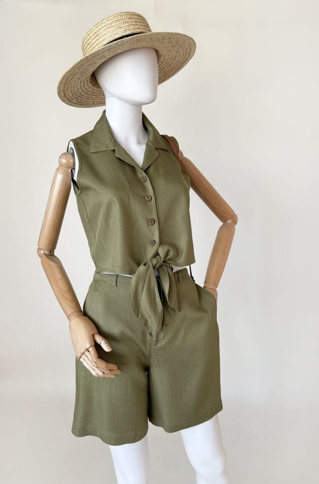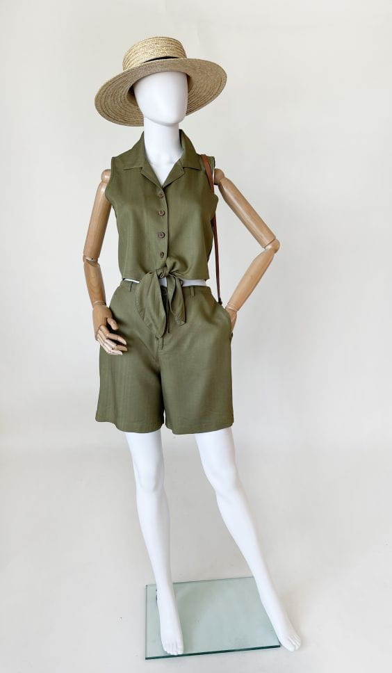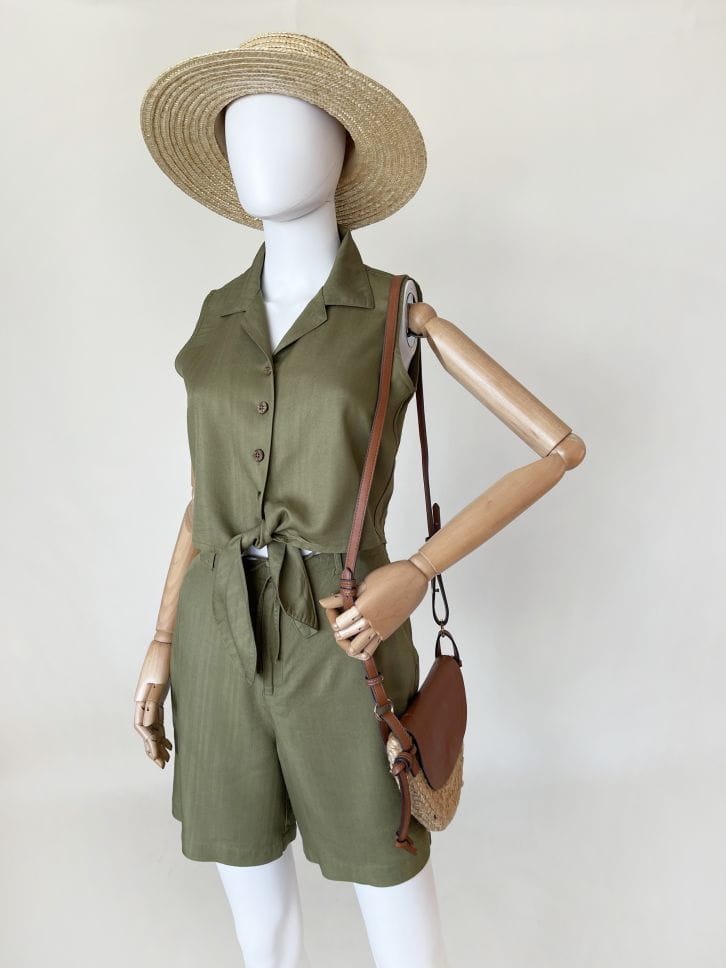 Set vintage wykonany z lekkiego rayonu w kolorze khaki. Doskonały na lato, niezastąpiony podczas wakacyjnych wyjazdów. Góra to koszulowa bluzka bez rękawów. Rozpinany fason z wiązaniem u dołu w pasie. Szorty o lekko podwyższonym stanie ze swobodnymi nogawkami. W pasie z tyłu elastyczna wstawka. Mają kieszenie.
