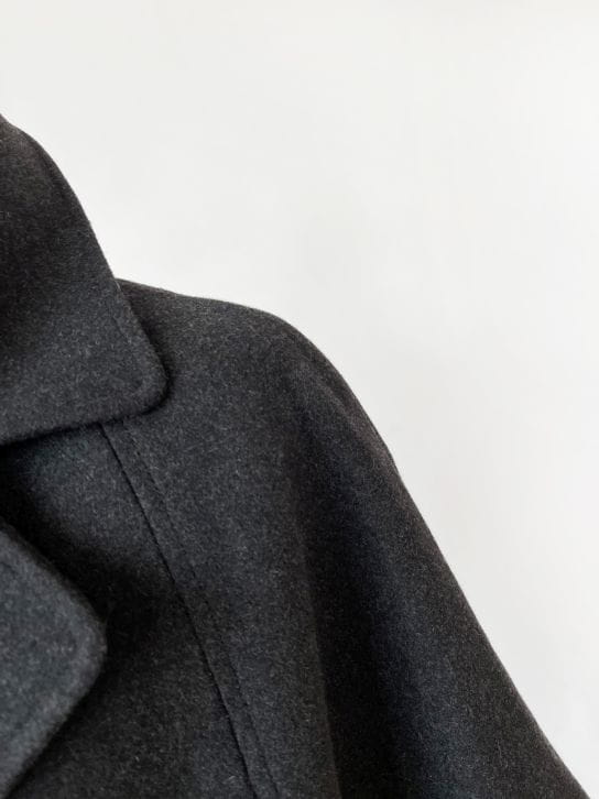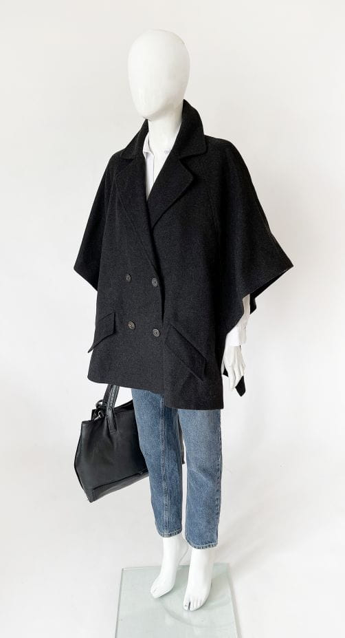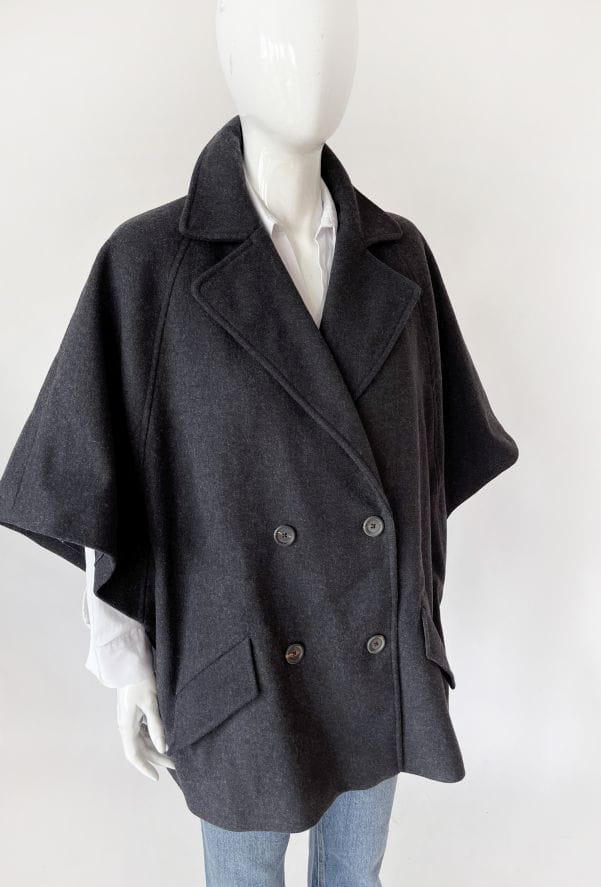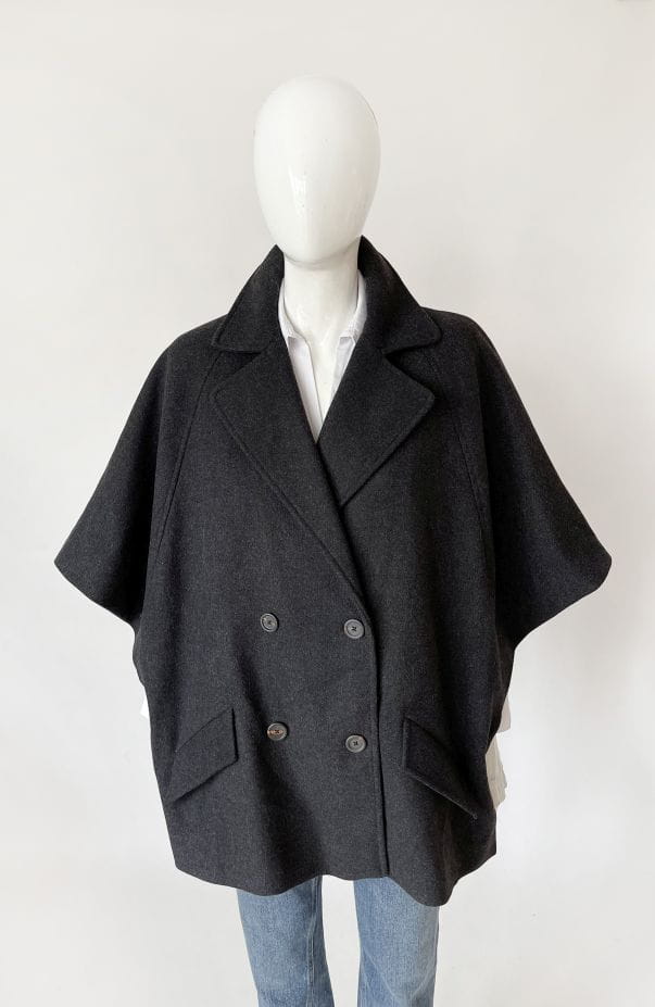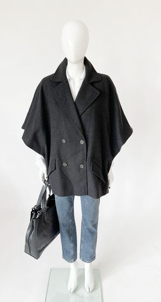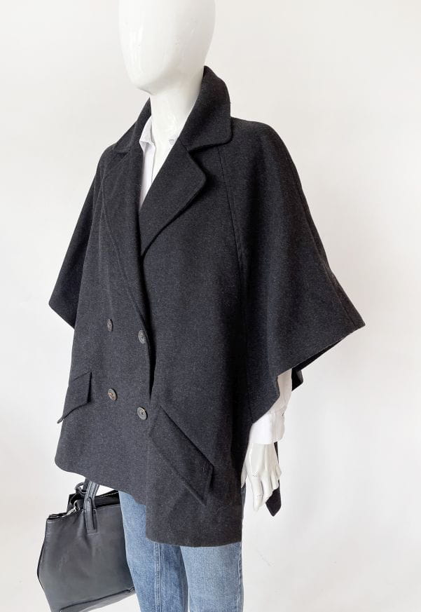 Grafitowy płaszcz/peleryna renomowanej marki Liebeskind. Klasa! Oversizowy fason z dużym kołnierzem. Dwurzędowe zapięcie, po bokach kieszenie (jeszcze zaszyte od nowości).