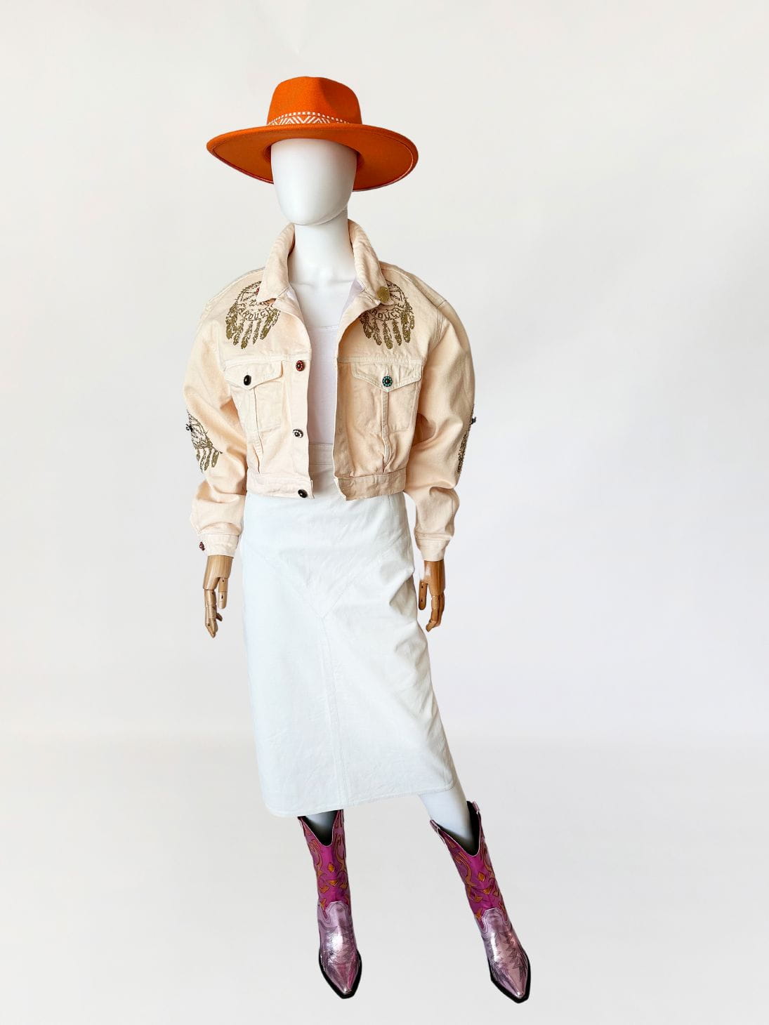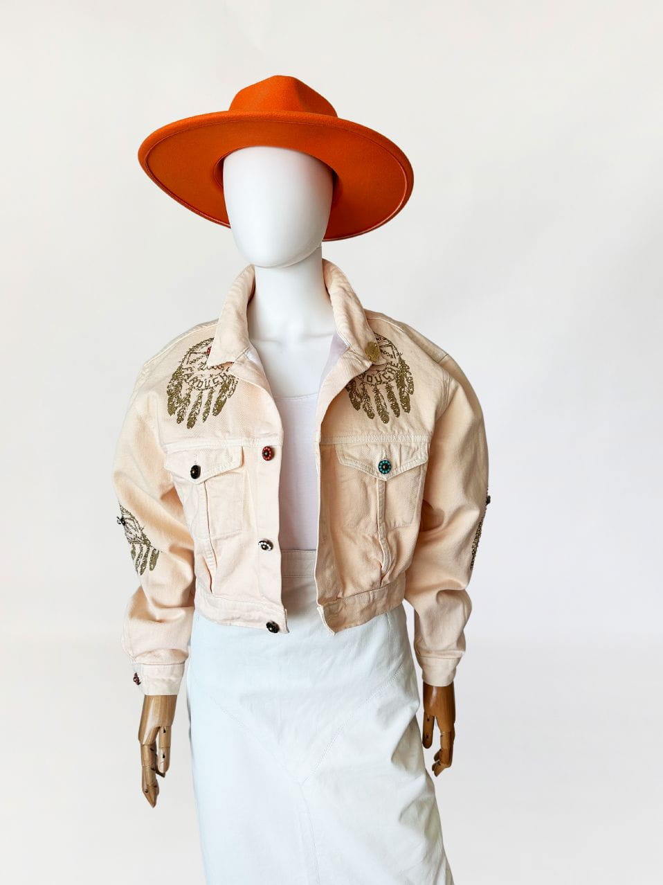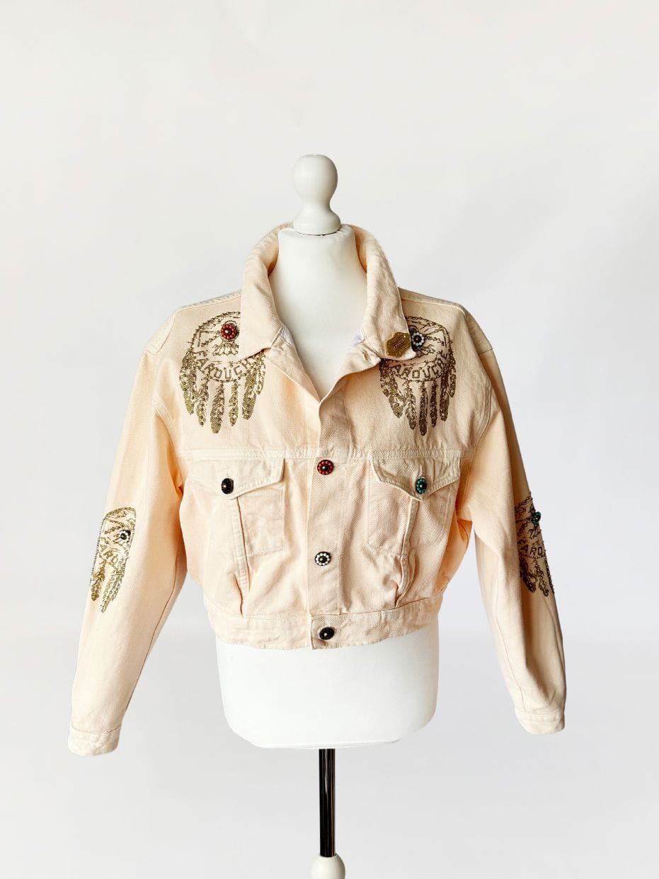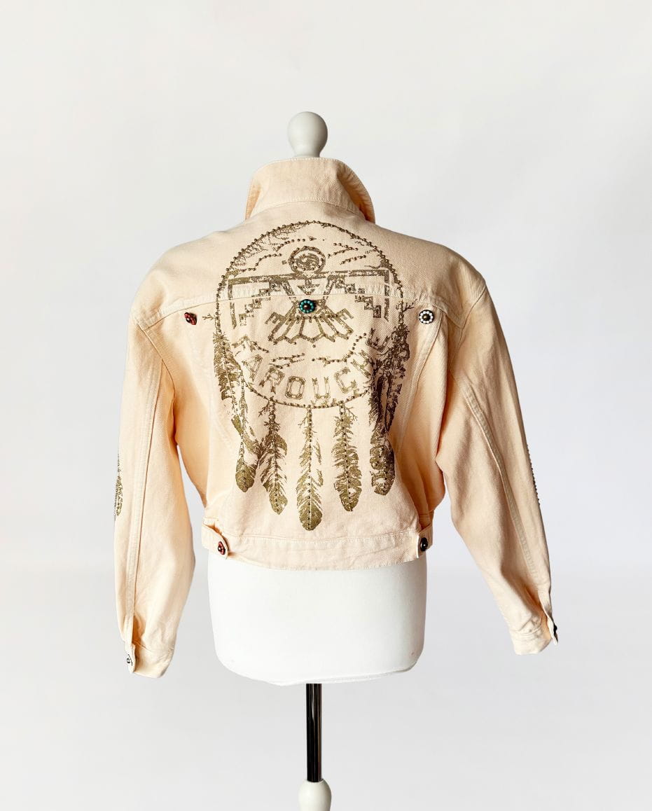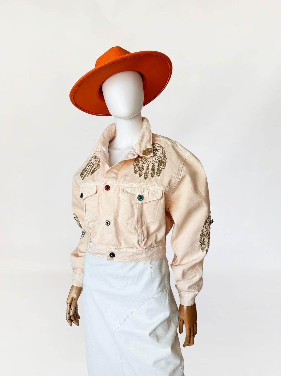 Kurtka vintage z pastelowego denimu. Model kultowej marki Lily Farouche. Krótki fason z długimi rękawami. Pachy lekko obniżone, luźne, krój zwężany do dołu. Na całości kurtki liczne zdobienia w festiwalowych klimatach boho: nadrukowane złote łapacze snów wysadzane złotymi nitami, liczne guziki w kształcie kwiatów z różnokolorowymi wypełnieniami. Na kołnierzu duża złota blaszka z nazwą marki. Na plecach duże logo.