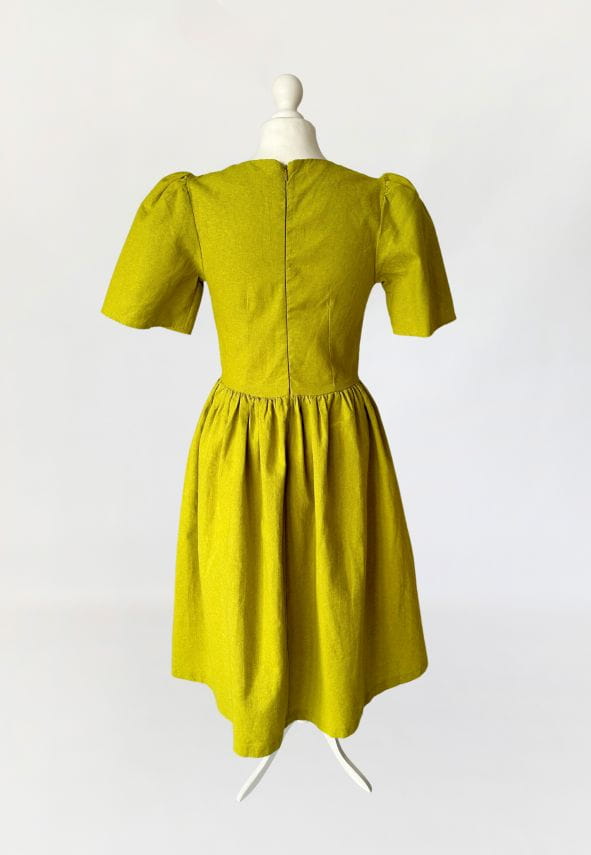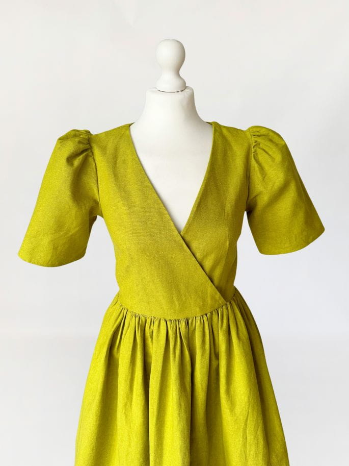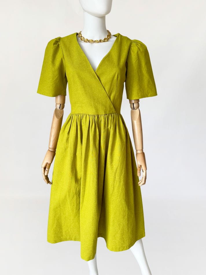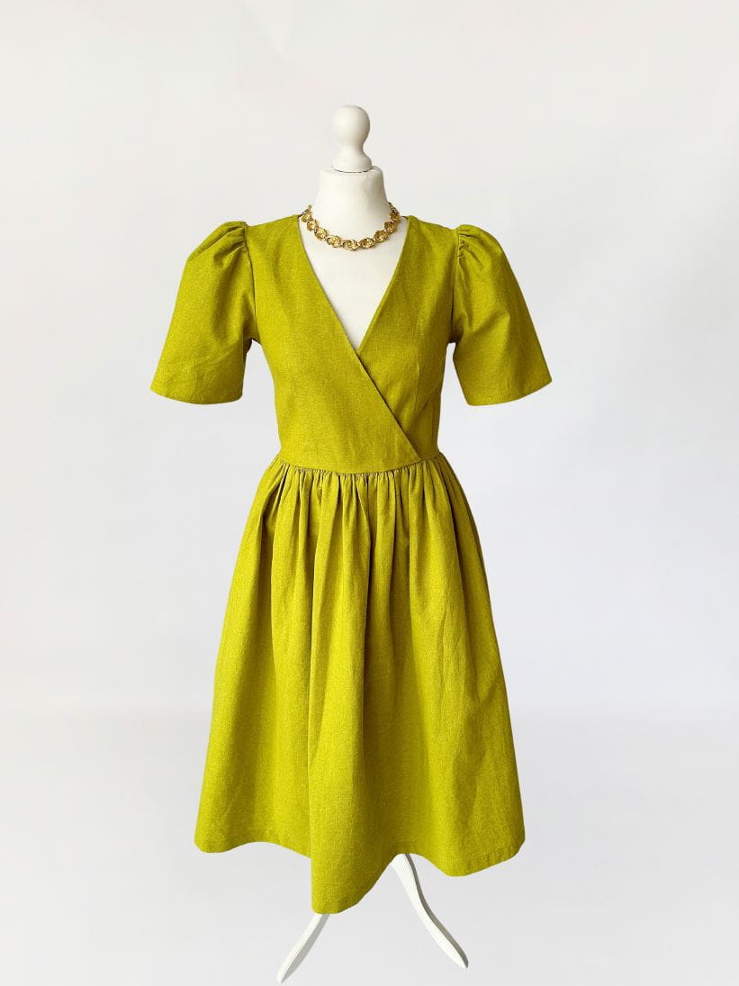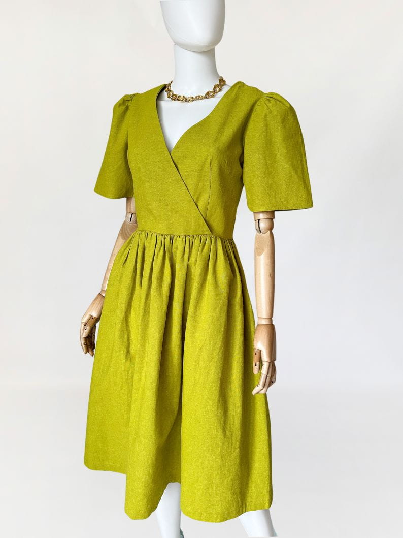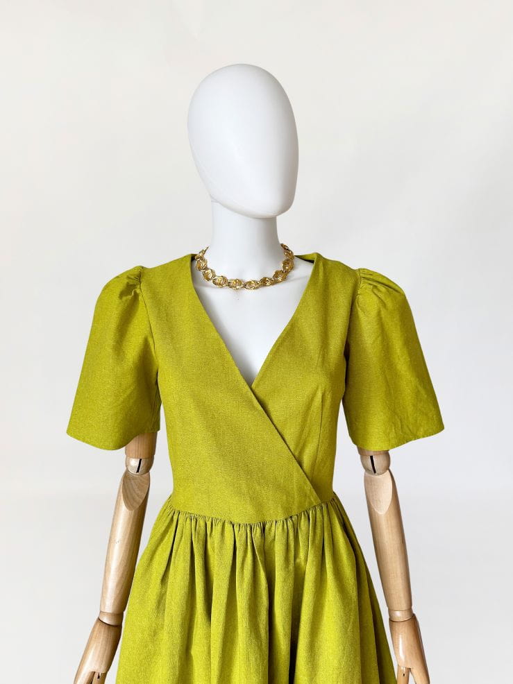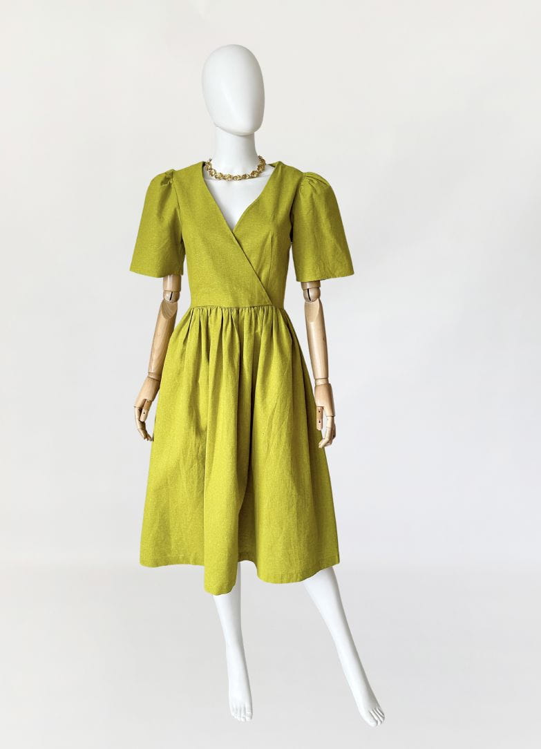 Córka Pani Wiosny! Sukienka amerykańskiej marki Lisa Says Gah wykonana z płóciennej, lniano- bawełnianej tkaniny w kolorze limonkowym. Ponadczasowy fason, z którym każda sylwetka prezentuje się dobrze. Kopertowa góra z krótkimi bufiastymi rękawami, w pasie odcinana, drapowana. Spódnica o rozkloszowanym fasonie. Tkanina jest zarazem sztywniejsza i przewiewna, doskonała na wiosnę i lato. Na plus zasługuje także fakt, że po wyprasowaniu żelazkiem bardzo ładnie się trzyma i jest dość odporna na zagięcia, co bywa zbawienne podczas podróży :)