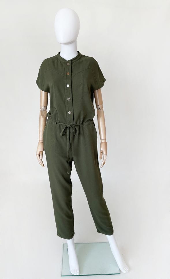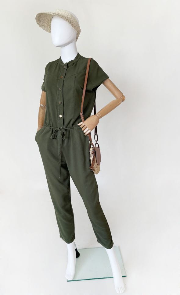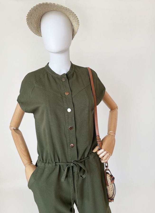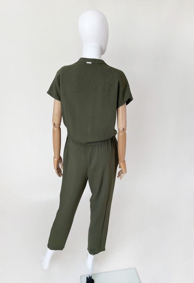 Kombinezon topowej włoskiej marki Liu Jo. Uszyty z wiskozowej tkaniny w kolorze militarnej zieleni. Góra rozpinana, z krótkimi rękawami. Pas regulowany ściągaczem. Długie swobodne nogawki, lekko zwężane do dołu. Na wysokości bioder wsuwane kieszenie.
