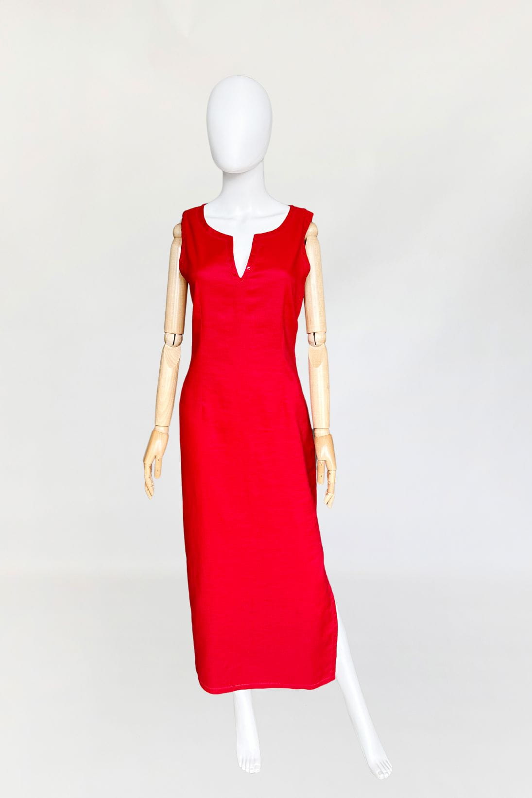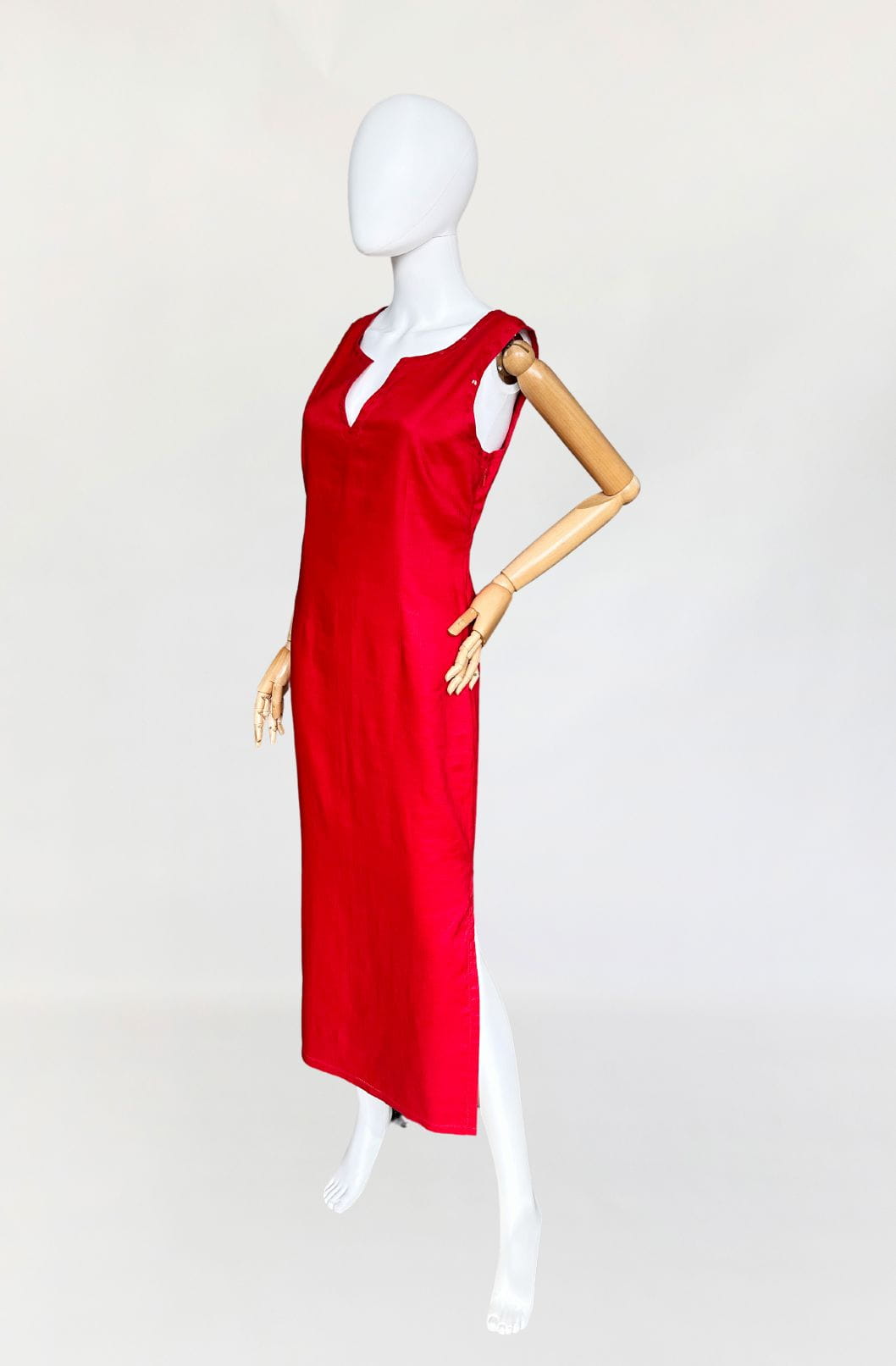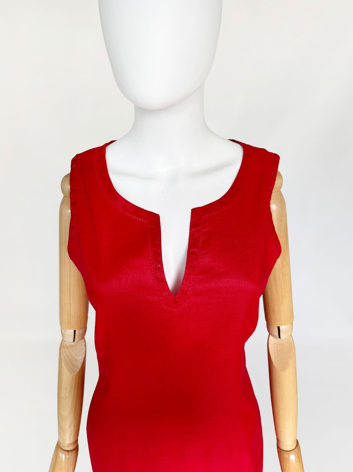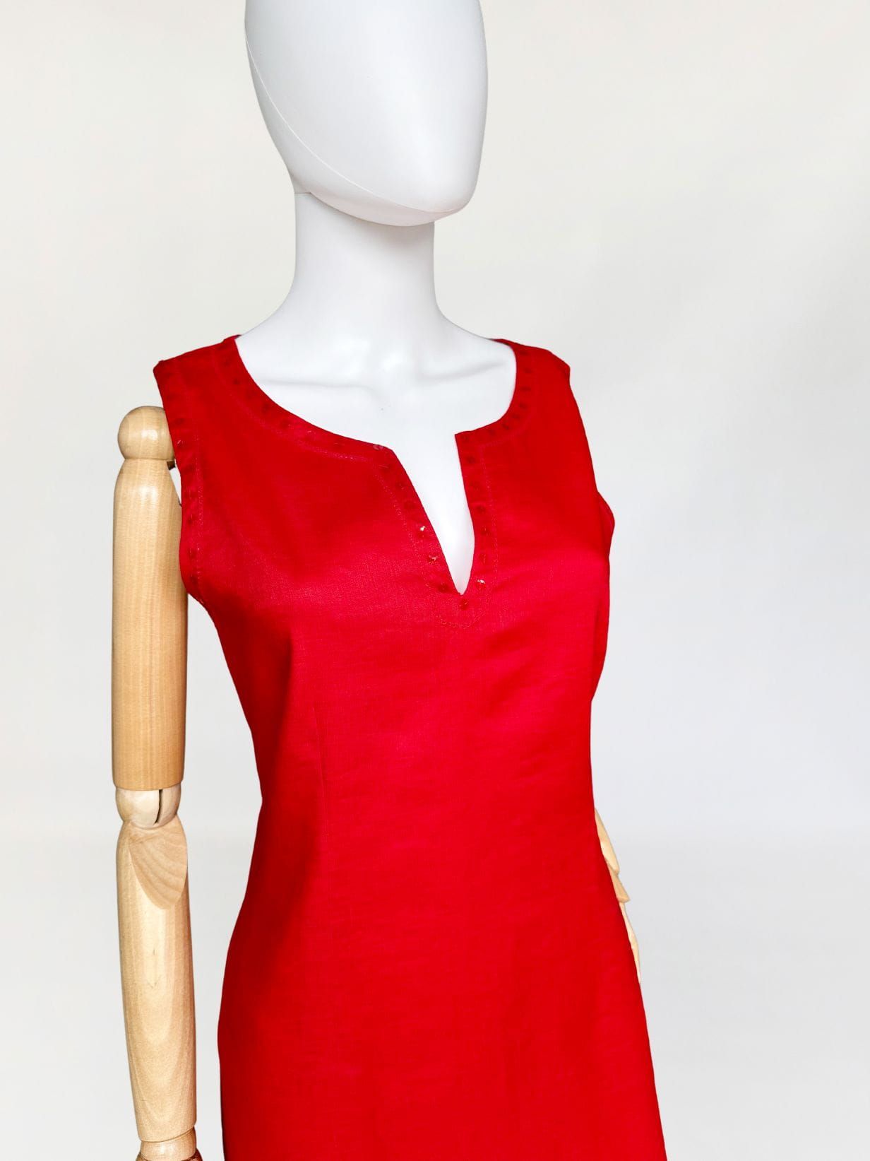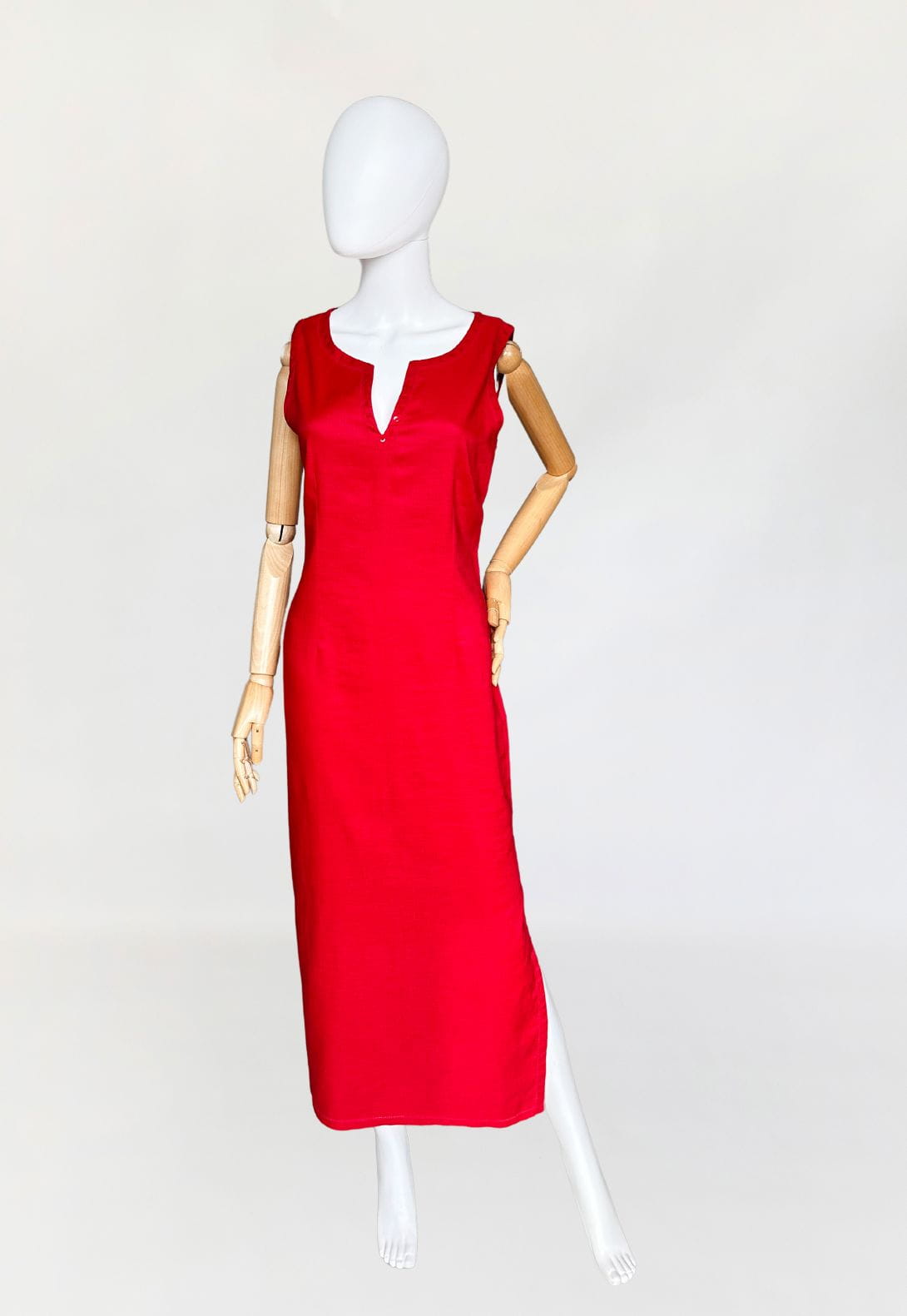 Lniana piękność w krwistoczerwonym kolorze. Sukienka o prostym fasonie i długości maxi. Kobiecy, zmysłowy model - bardziej na specjalne okazje niż jako casual. Doskonałej jakości, lekka lniana tkanina, wspaniała głębia koloru. U dołu wysoki rozporek. Przy dekolcie nienachalne przezroczyste cekiny. Model bez podszewki.