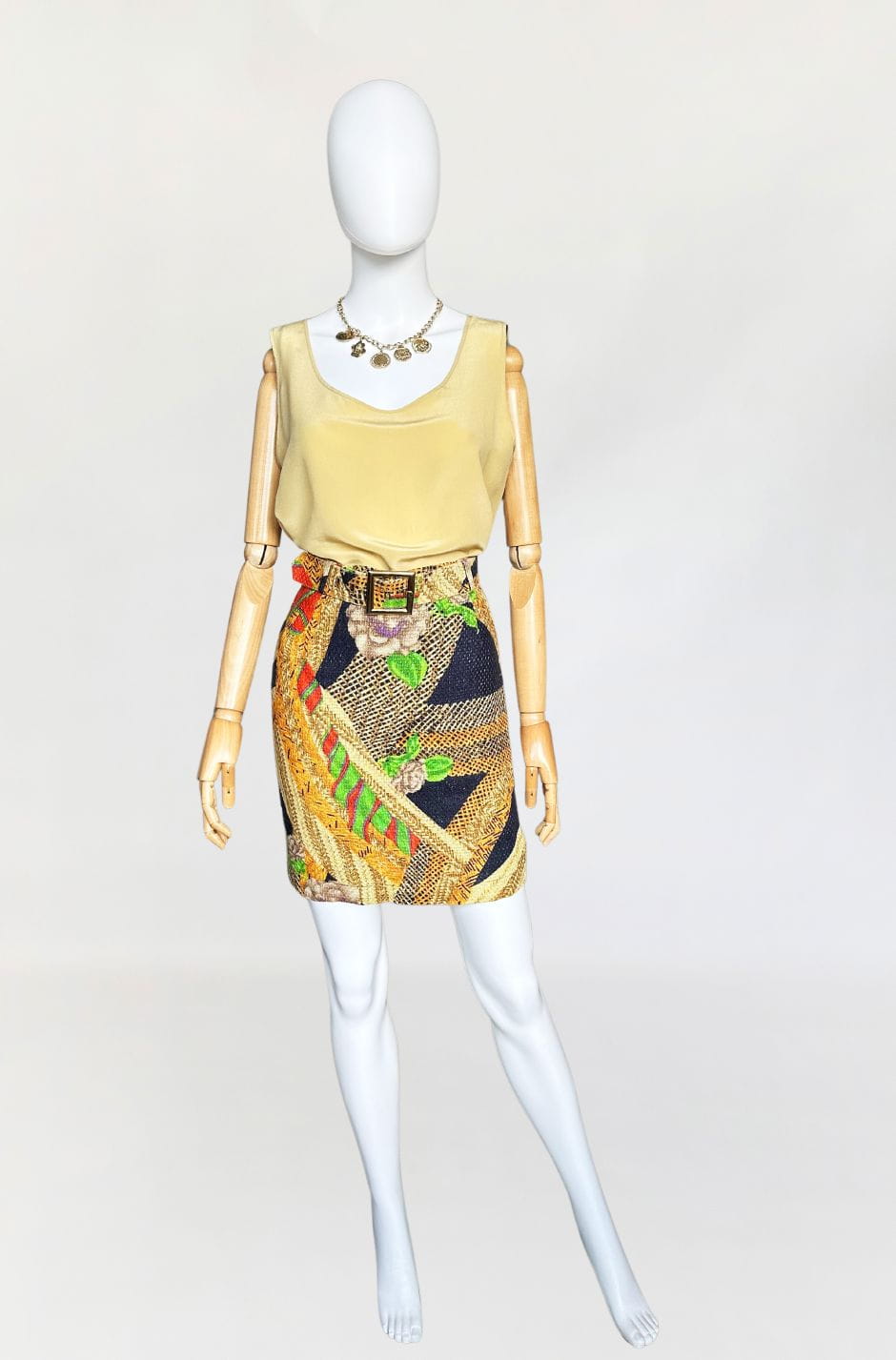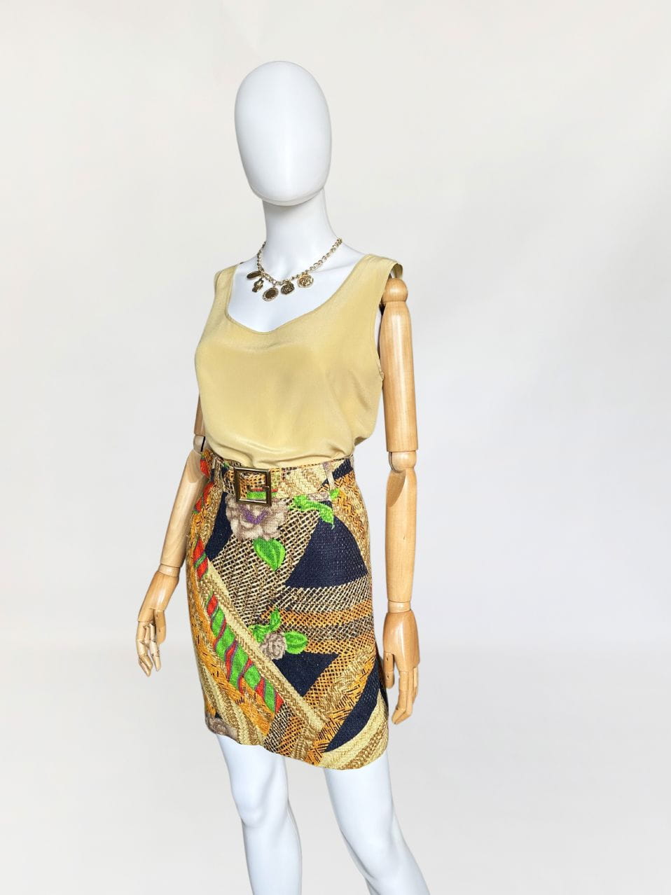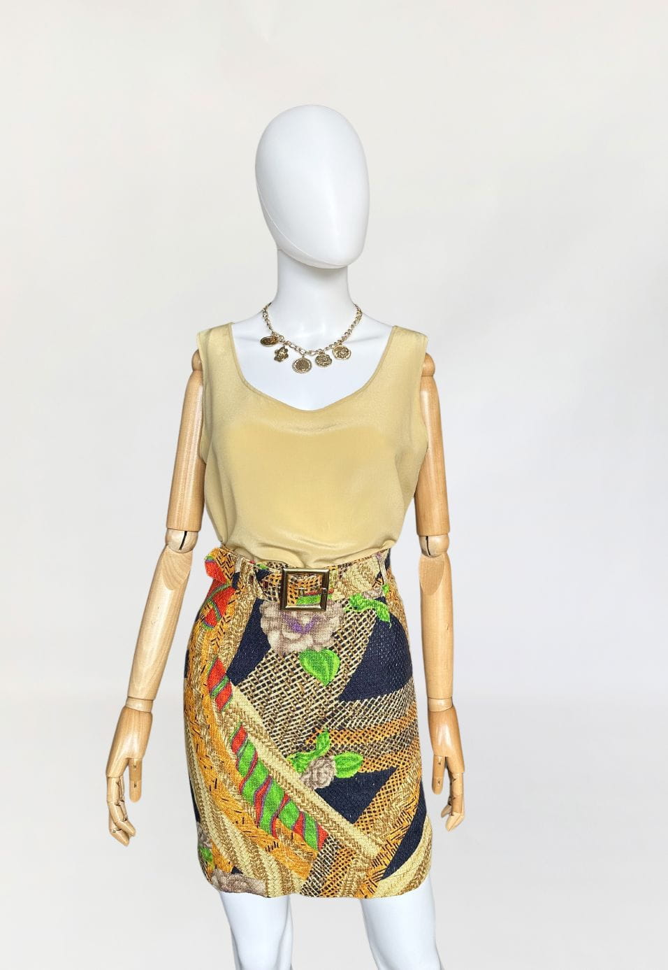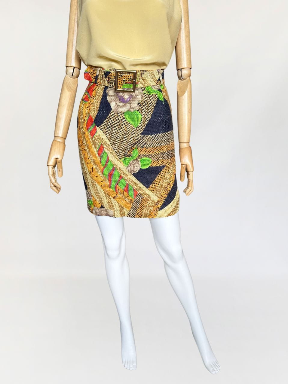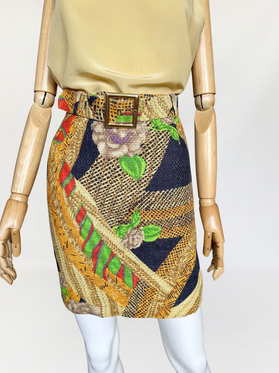 Włoska spódnica vintage o ołówkowym fasonie i długości mini. Wykonana z lnianej tkaniny w barwne wzory. W komplecie pasek z dużą złotą klamrą, oblekany tkaniną.
