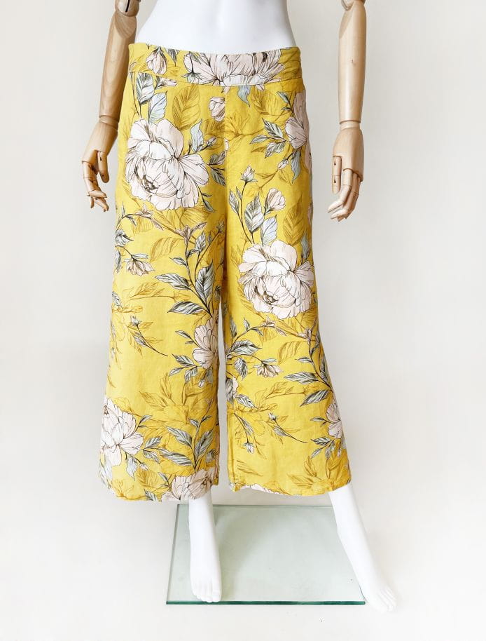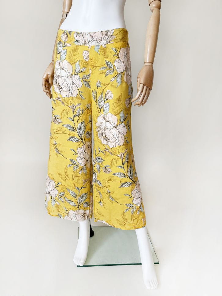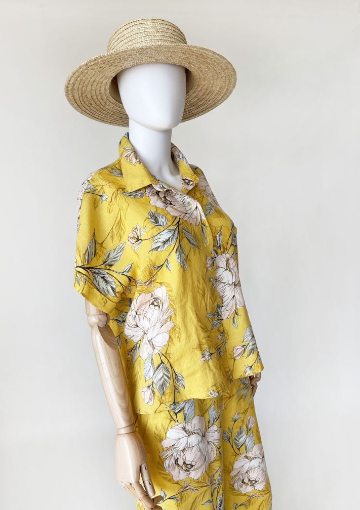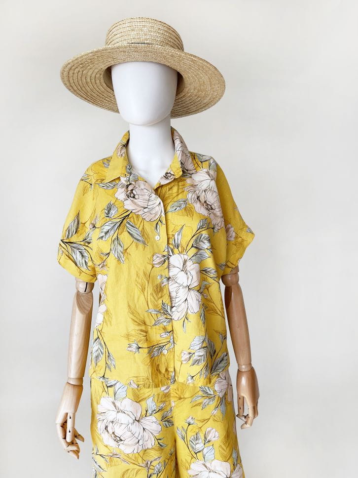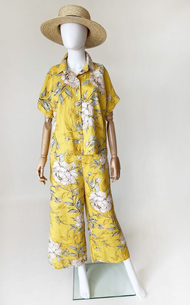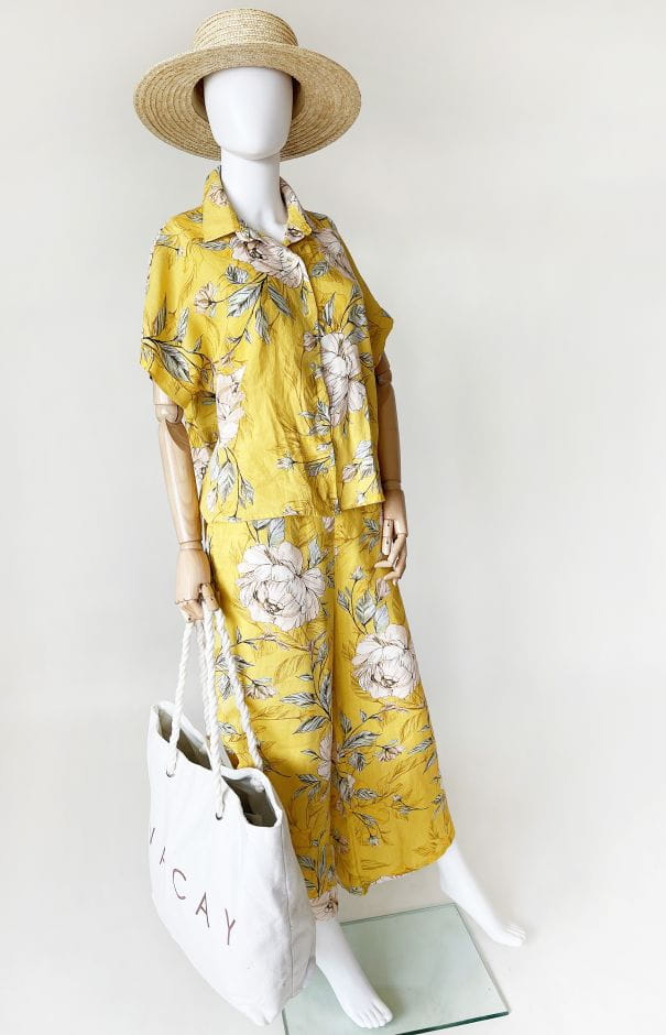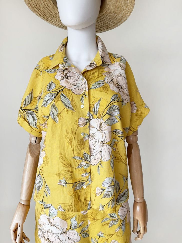 Letni komplet od amerykańskiej marki premium Nicole Miller. Marka powstała na początku lat 80-tych i szybko zdobyła uznanie zarówno wśród klientek, jak i krytyków mody. Jej kolekcje były prezentowane na prestiżowych pokazach mody, m.in na New York Fashion Week, szybko podbiła także serca zagranicznych odbiorców. Nicole Miller słynie z innowacyjnych i śmiałych projektów, które łączą ponadczasową klasykę z nowoczesnym stylem. Komplet został wykonany w całości z przewiewnej lnianej tkaniny w słonecznym żółtym kolorze w kwiatowe wzory. Składa się z oversize'owej koszuli z krótkimi rękawami, oraz spodni z szerokimi nogawkami. Tył pasa na gumie. Od frontu wsuwane kieszenie. Komplet będzie doskonały na wakacyjne wyjazdy, len to nieoceniona tkanina podczas upałów, a kwiatowe printy wprowadzą Cię w urlopowy radosny nastrój!