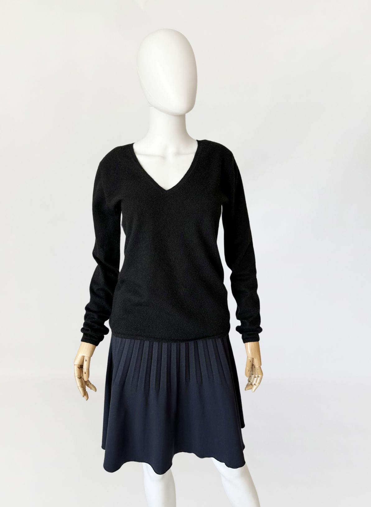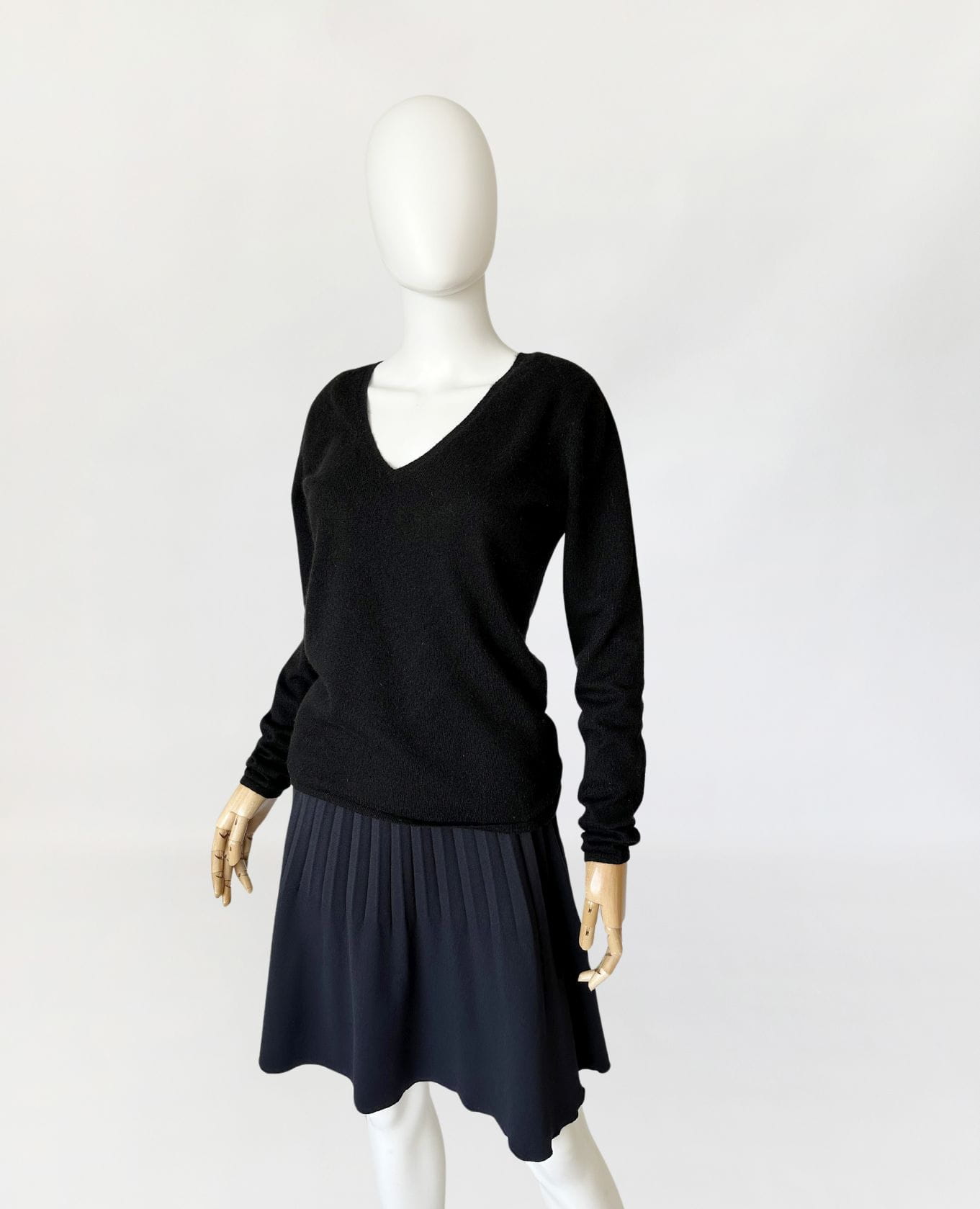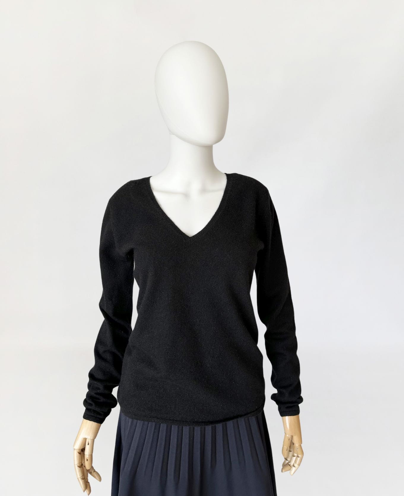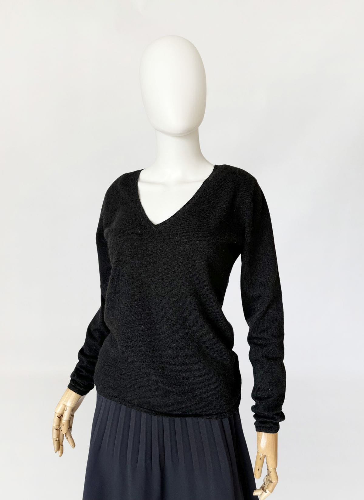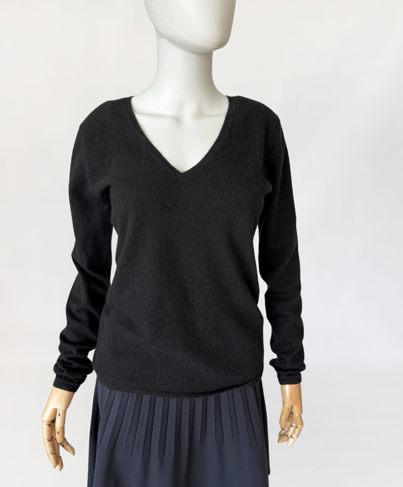 Minimalistyczny czarny sweter luksusowej niemieckiej marki Lodenfrey. Wykonany w całości z miękkiego kaszmiru. Klasyczny fason z dekoltem V-line. Ceny kaszmirowych swetrów marki przyprawiają o zawrót głowy i oscylują w przedziale cenowym 300 do 1000 euro. Sweter jest jak nowy.