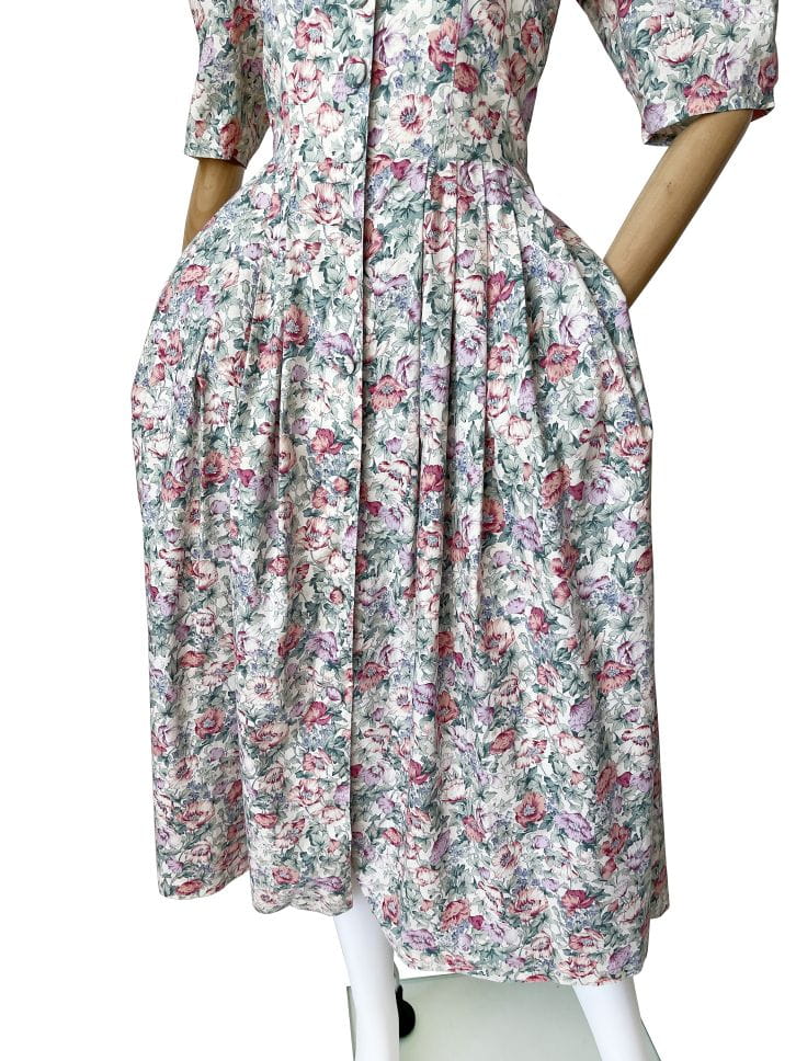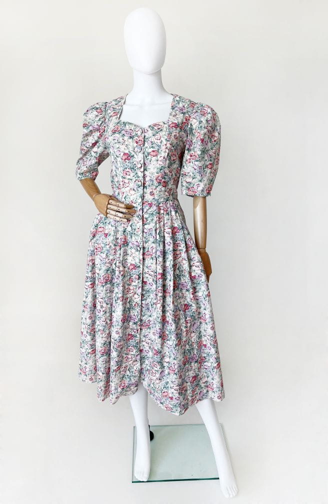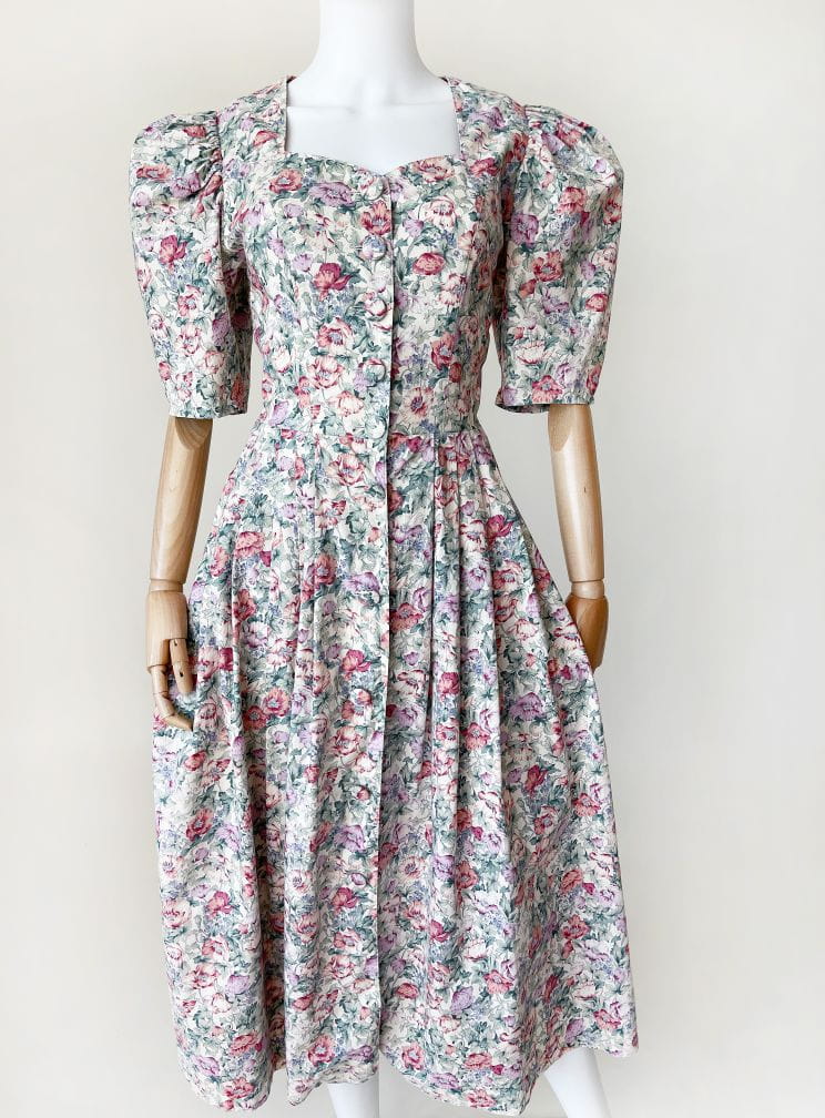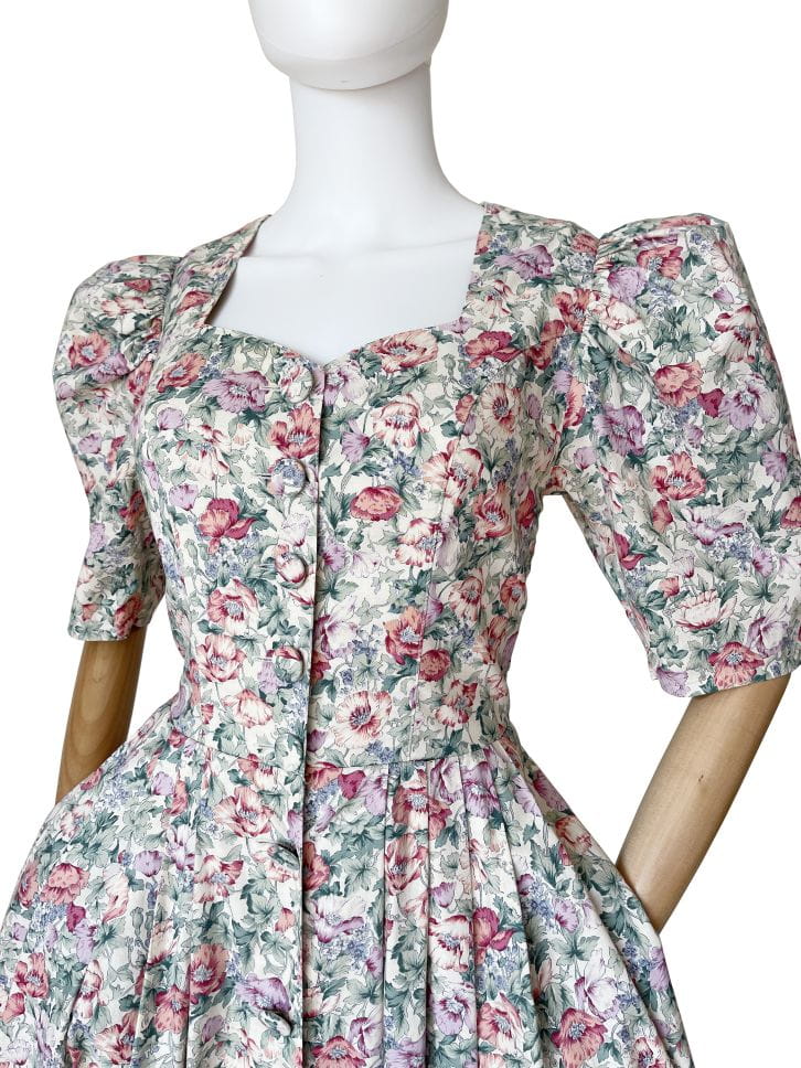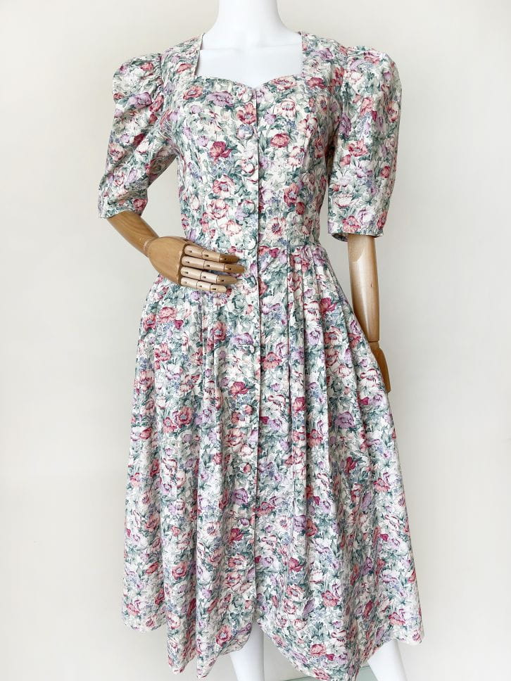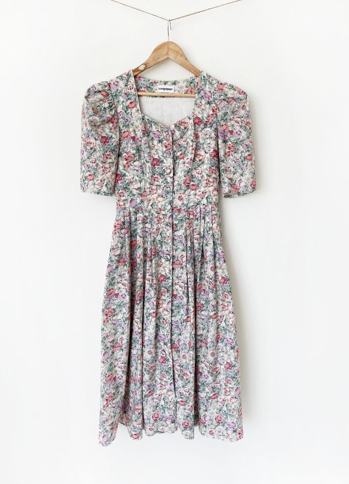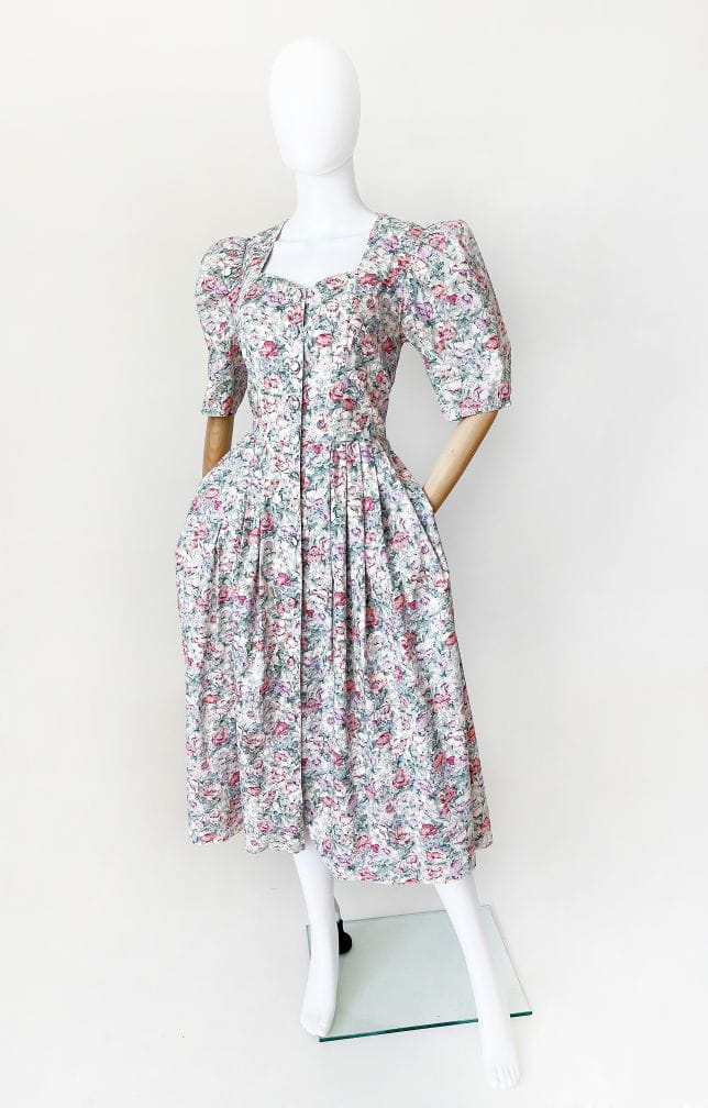 Sukienka vintage marki Lodenfrey. Model w stylu cottagecore, wykonana z bawełnianej tkaniny o deseniu w delikatny kwiatowy wzór. Gorsetowa góra zapinana na duże oblekane guziki. Krótkie rękawy bufiaste w ramionach. W pasie zaszewki. Dół rozłożysty, mocno rozkloszowany. W bocznych szwach wsuwane kieszenie.