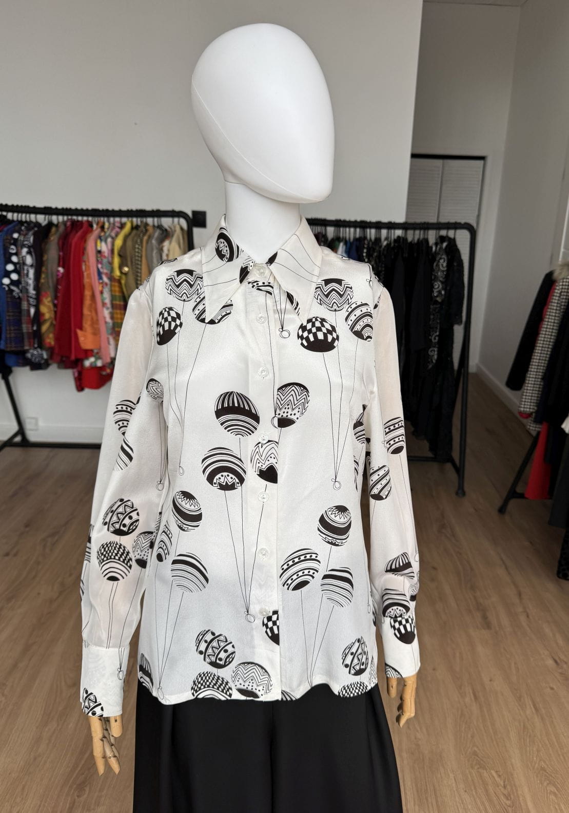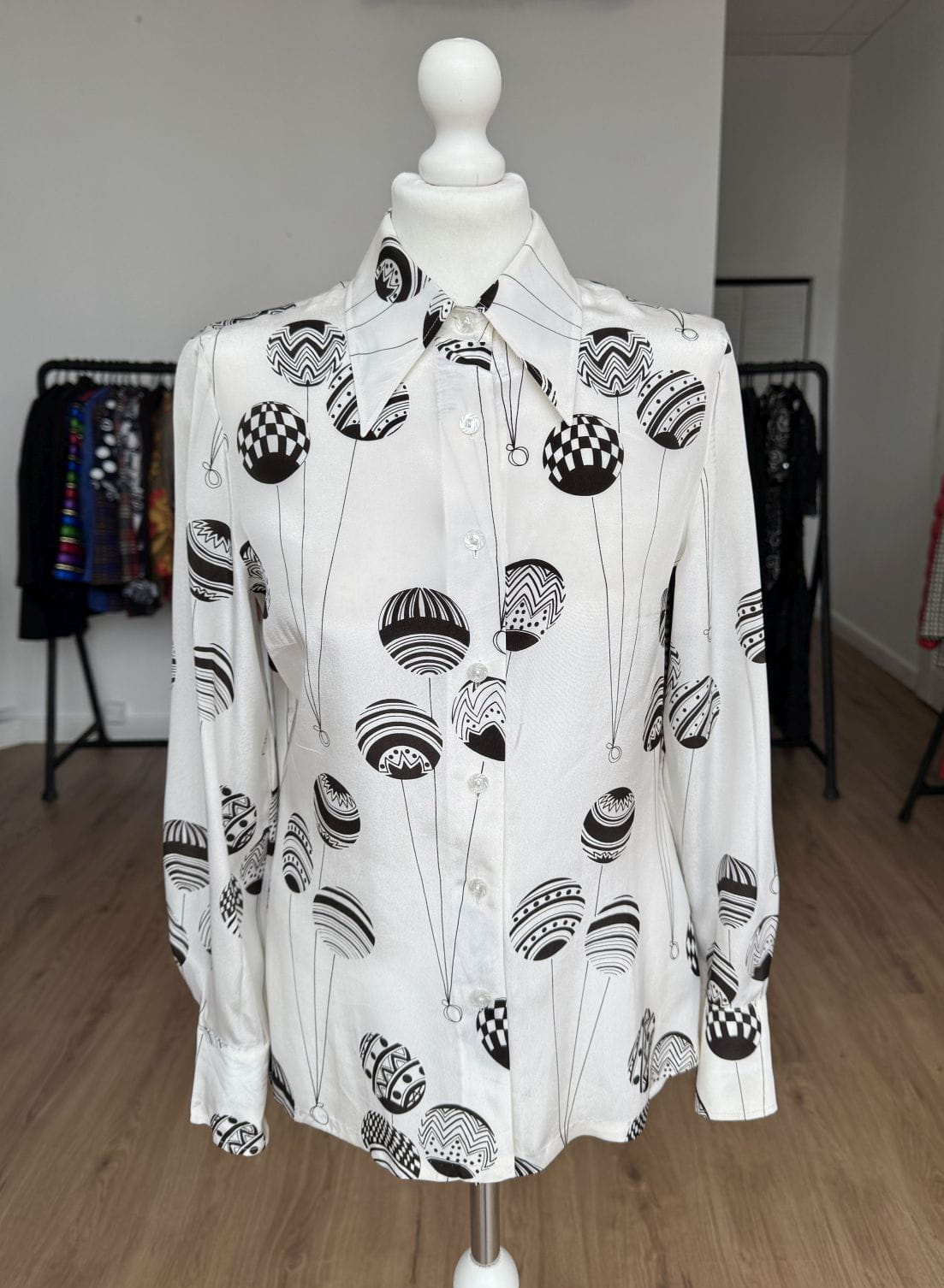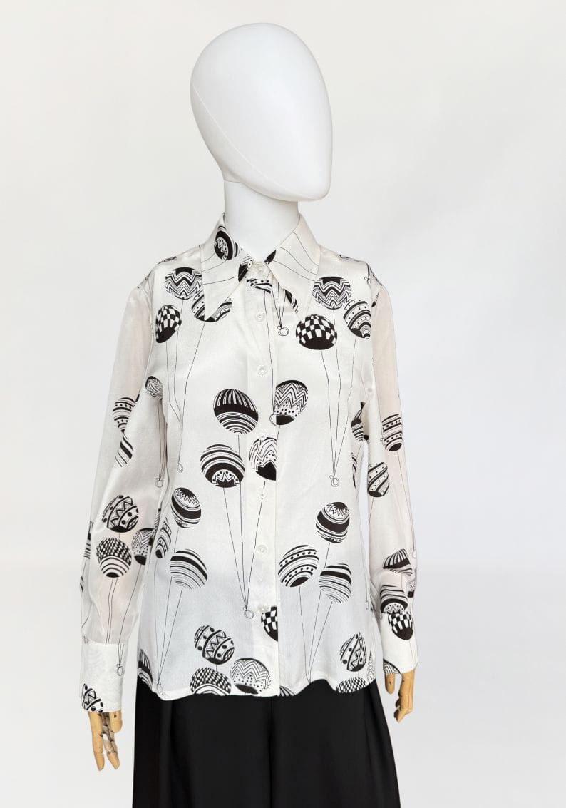 Koszula vintage z lat 70-tych kultowej marki Louis Feraud. Wykonana z lekkiej tkaniny, mieszanki acetatu i jedwabiu w kolorze ecru w duże kontrastowe brązowe wzory. Lekko taliowany z długimi rękawami, u góry spiczasty kołnierz.
