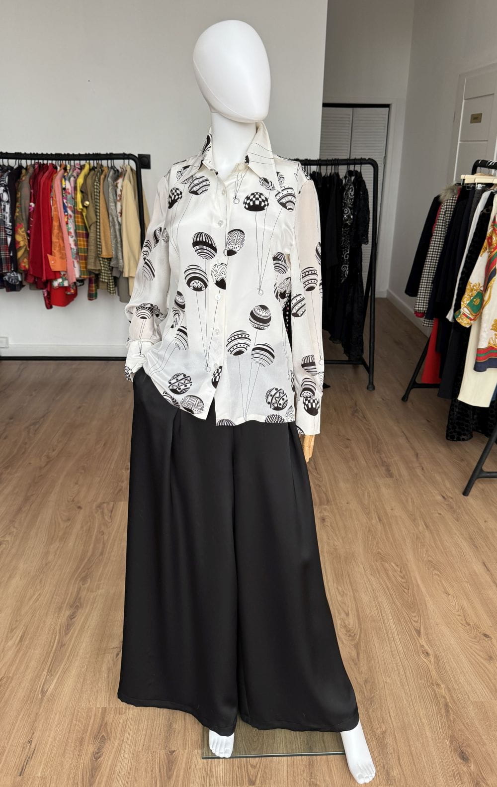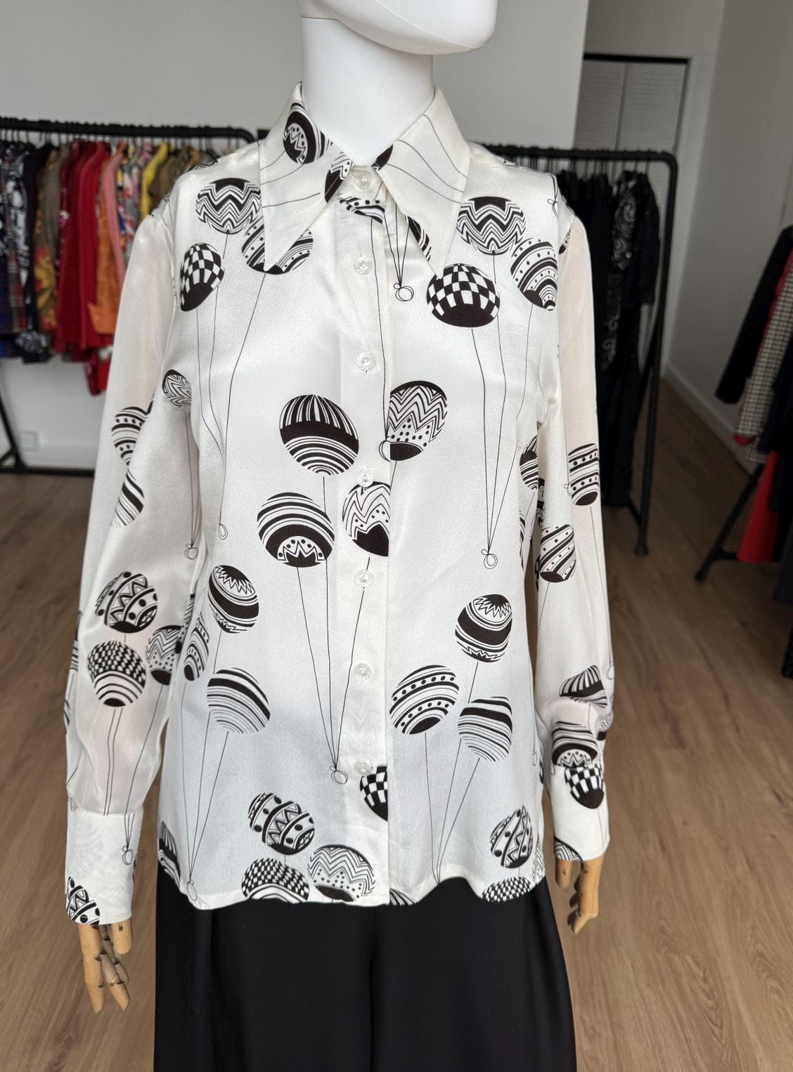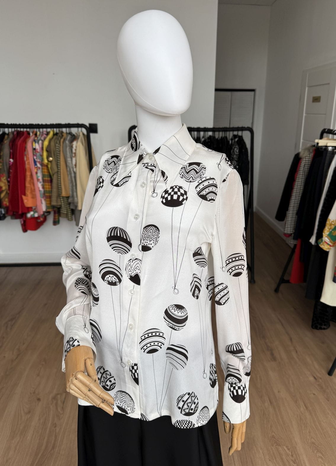 Koszula vintage z lat 70-tych kultowej marki Louis Feraud. Wykonana z lekkiej tkaniny, mieszanki acetatu i jedwabiu w kolorze ecru w duże kontrastowe brązowe wzory. Lekko taliowany z długimi rękawami, u góry spiczasty kołnierz.