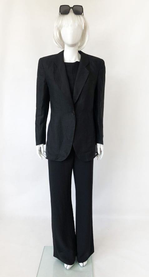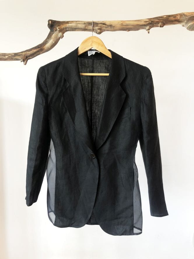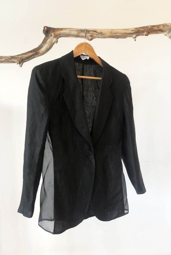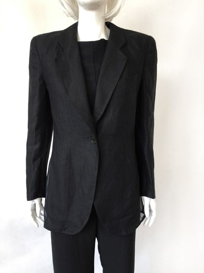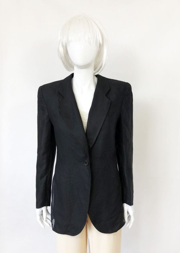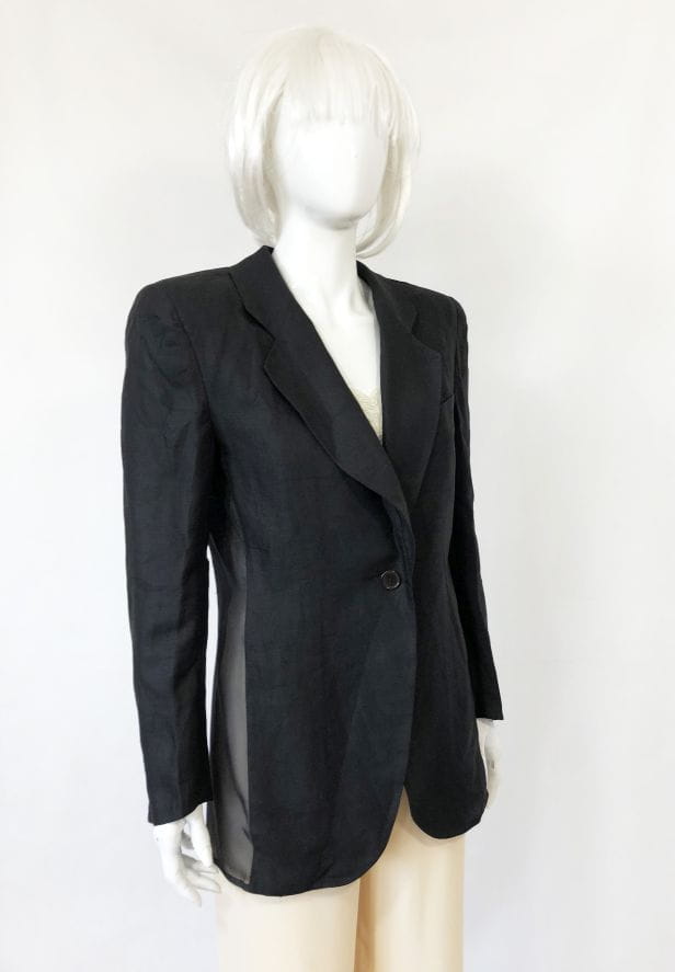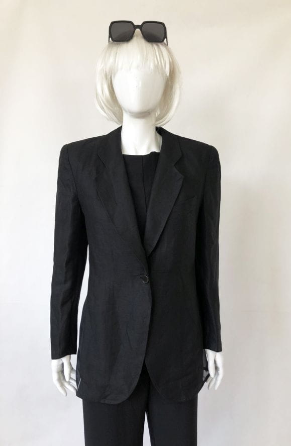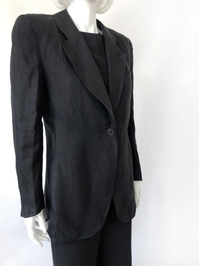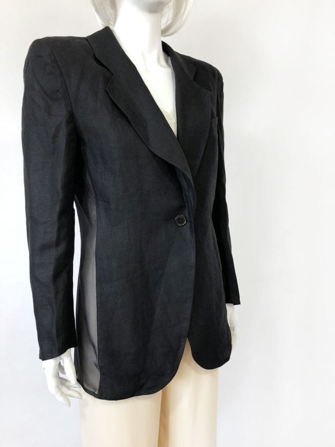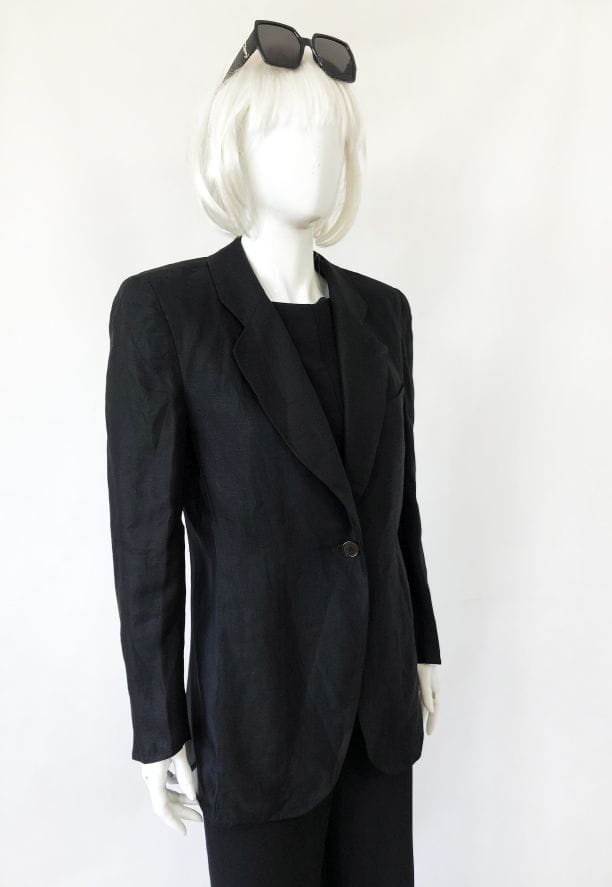 Czarna marynarka vintage od Luciano Soprani. Wykonana z czarnej lnianej tkaniny, po bokach wstawki z jedwabiu. Lekko taliowany model, w ramionach poduszki. Doskonale skrojona. Oryginalna, posiada metki wewnętrzne. Model vintage.