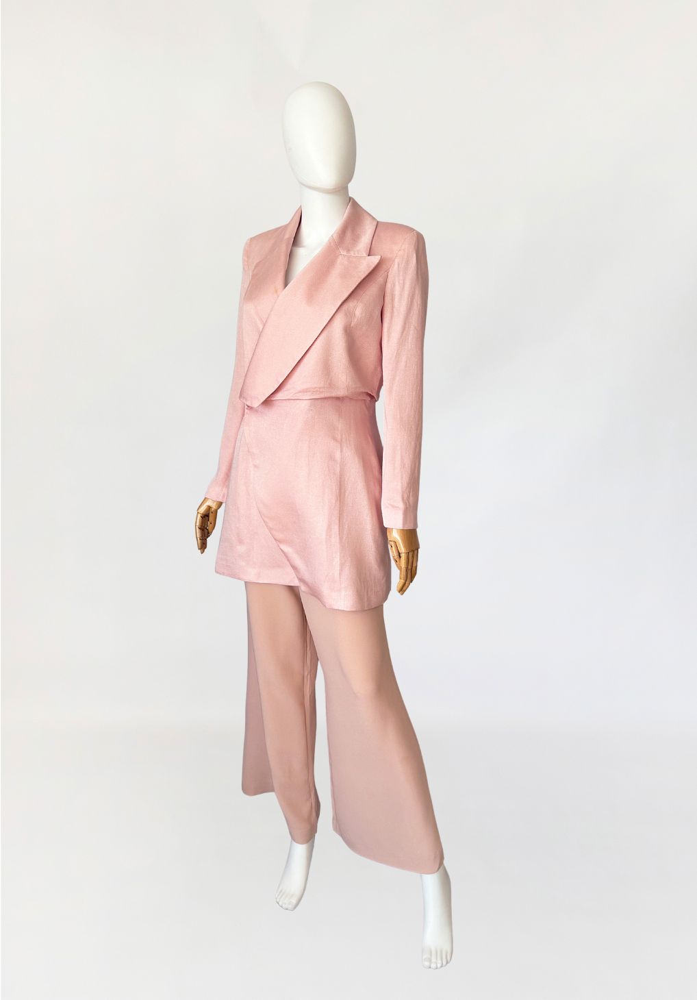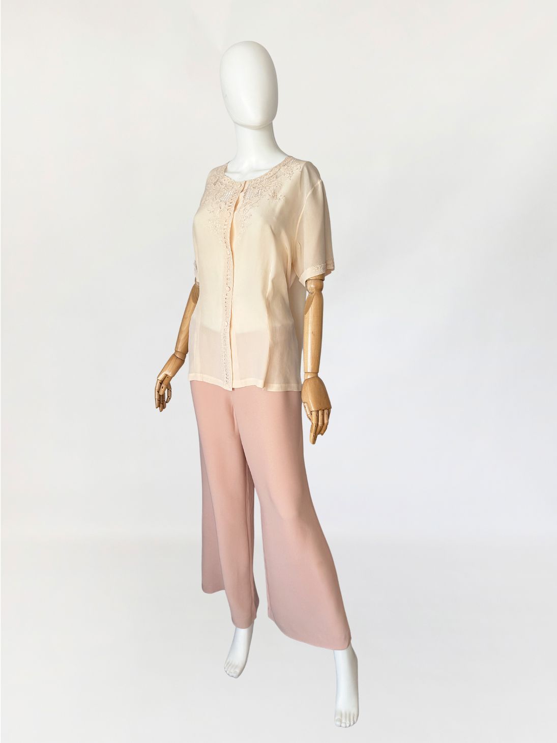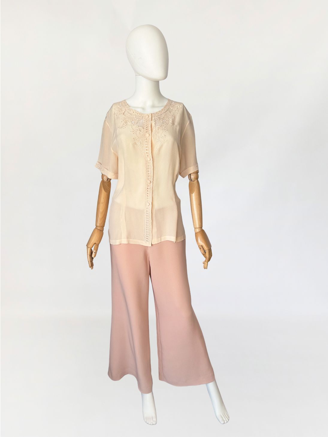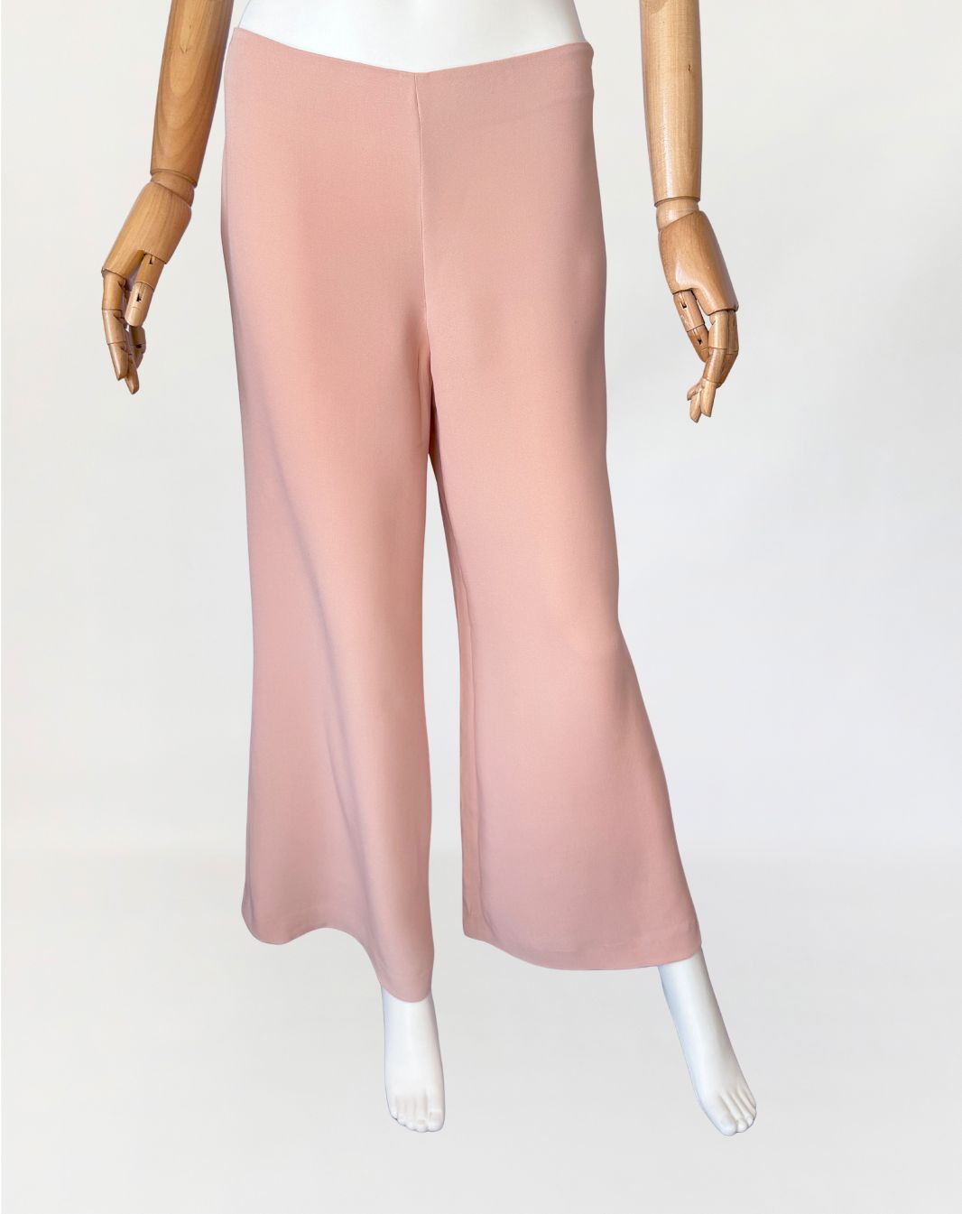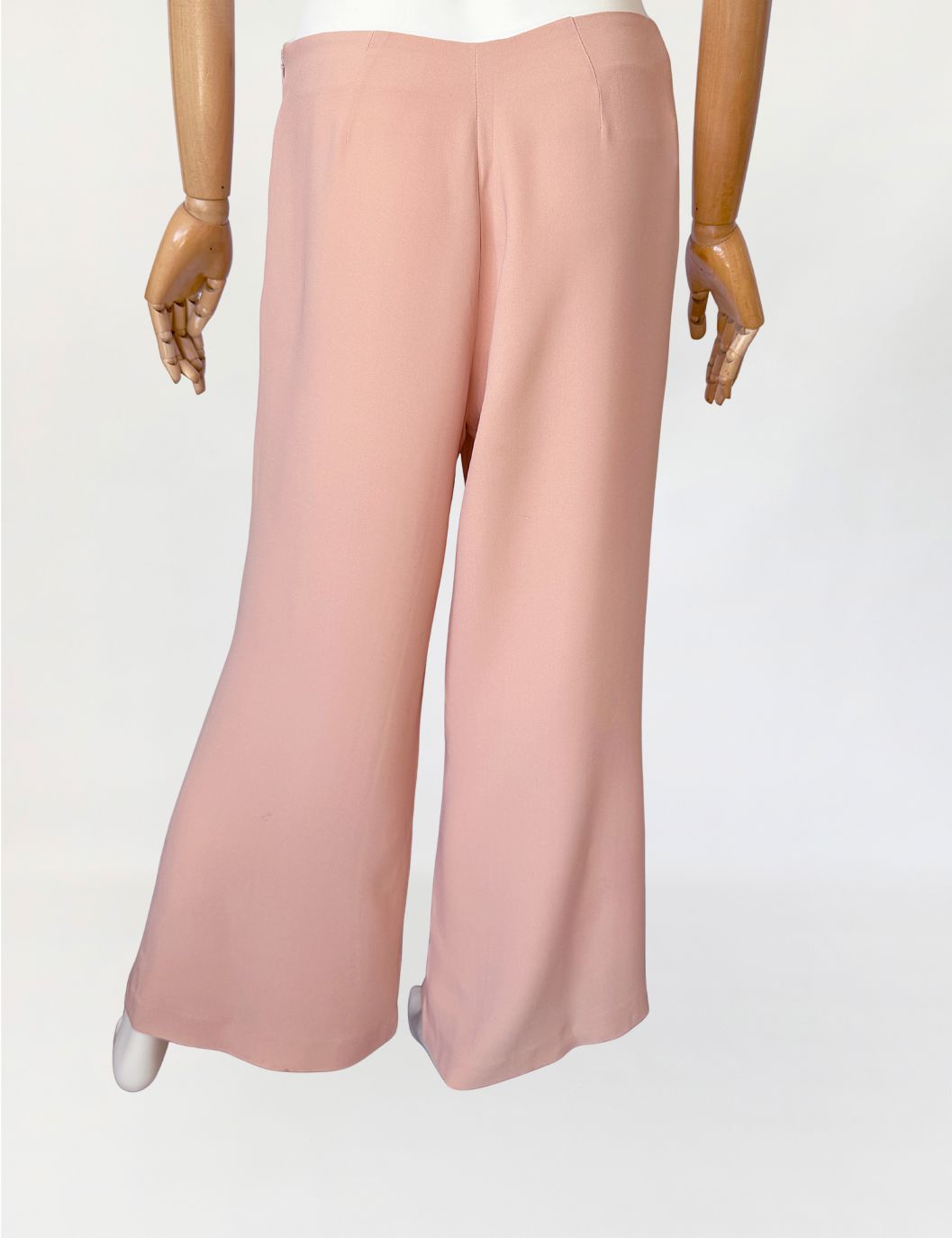 Spodnie vintage renomowanej marki Luisa Spagnoli. Wykonane z jedwabnej krepy w kolorze pudrowego różu. Model z długimi, szerokimi nogawkami.
