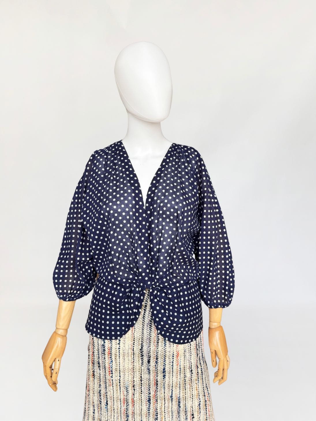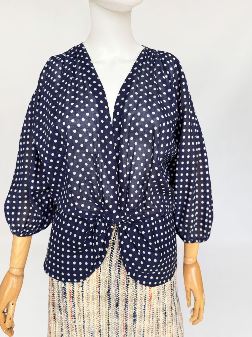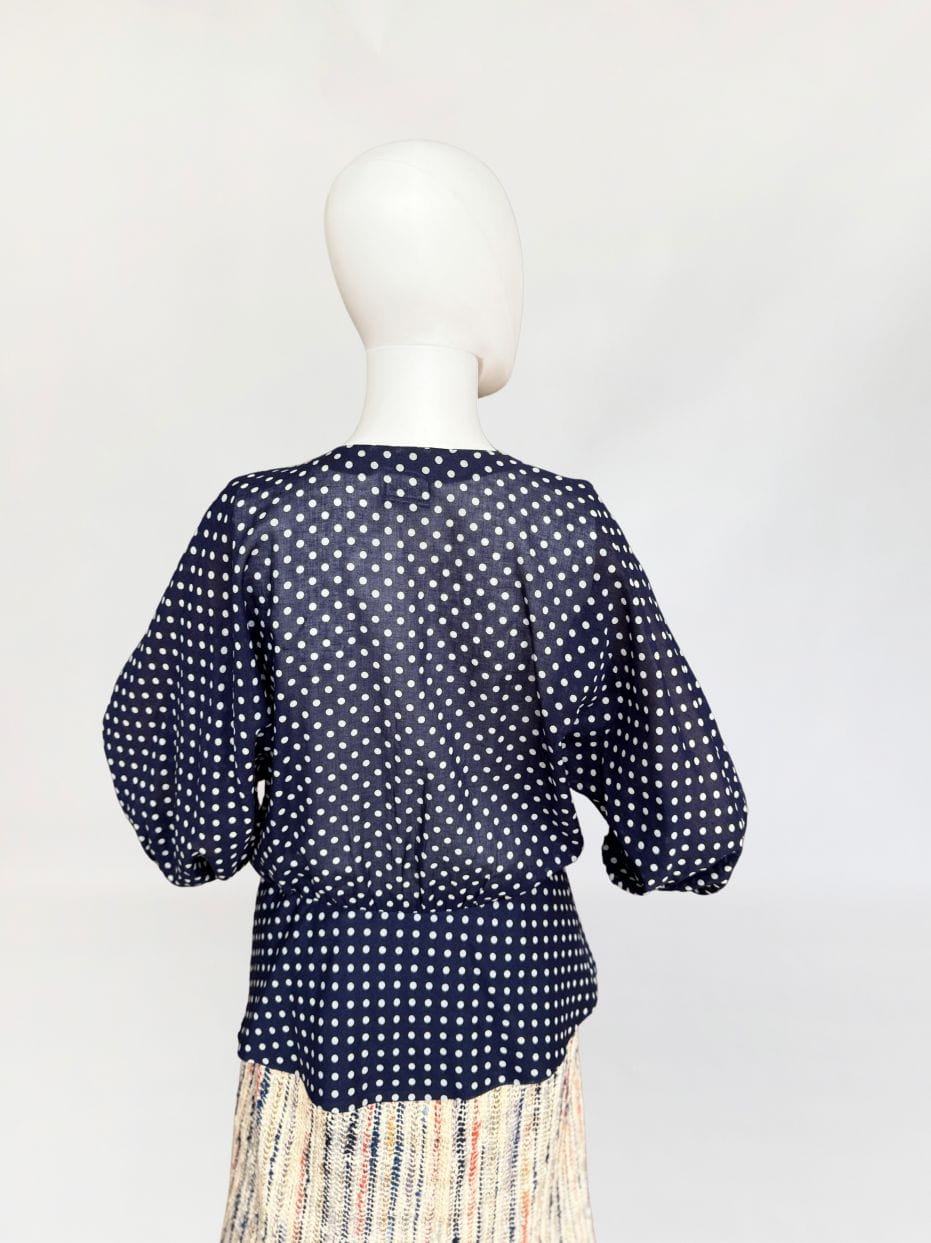 Lekki żakiet vintage z lat 80-tych marki Luisa Spagnoli. Wykonany z delikatnej bawełnianej tkaniny w białe groszki na granatowym tle. Konstrukcja o luźniejszej, typowej dla dekady linii ramion, z bufiastymi rękawami 3/4 zakończonymi gumką. Fason lekko taliowany, zapinany na pojedynczą haftkę umieszczoną w pasie.