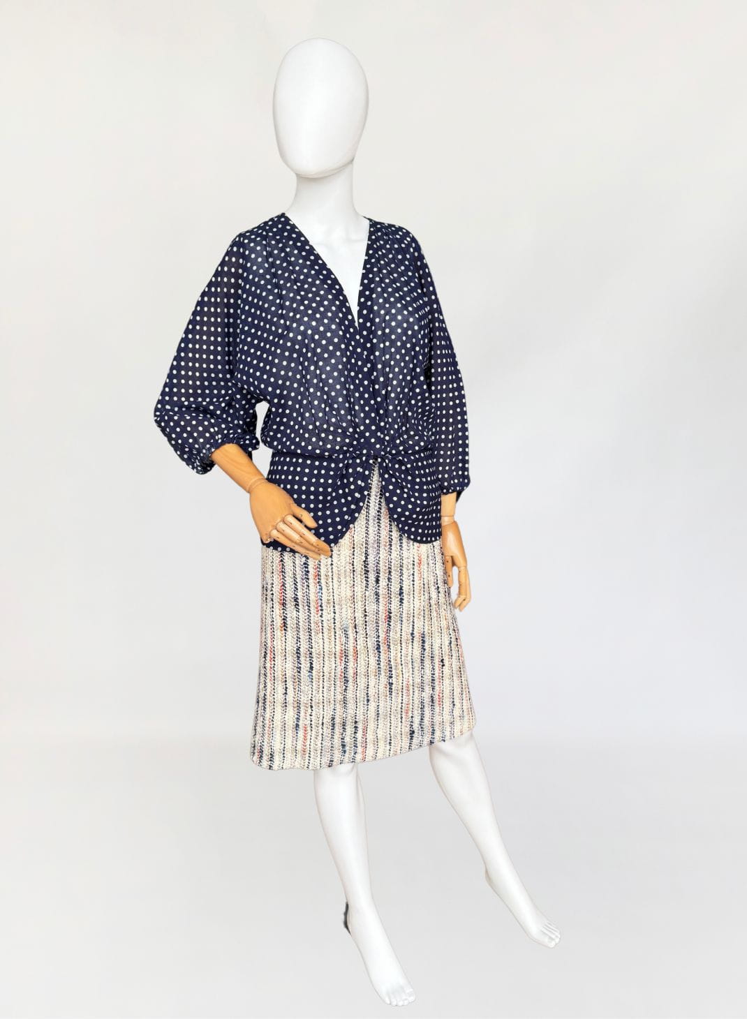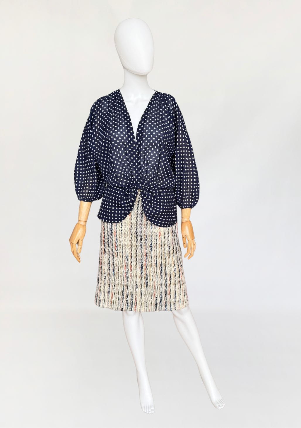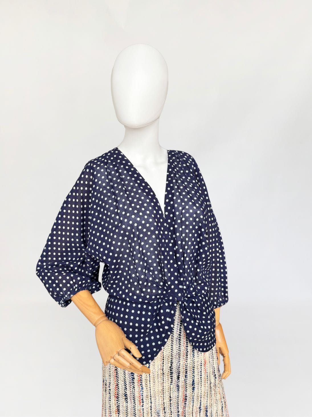 Lekki żakiet vintage z lat 80-tych marki Luisa Spagnoli. Wykonany z delikatnej bawełnianej tkaniny w białe groszki na granatowym tle. Konstrukcja o luźniejszej, typowej dla dekady linii ramion, z bufiastymi rękawami 3/4 zakończonymi gumką. Fason lekko taliowany, zapinany na pojedynczą haftkę umieszczoną w pasie.