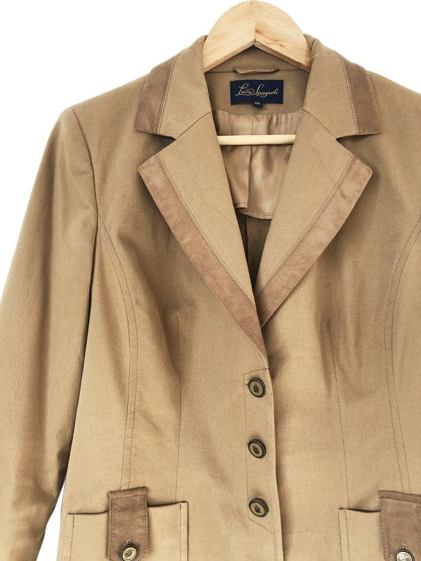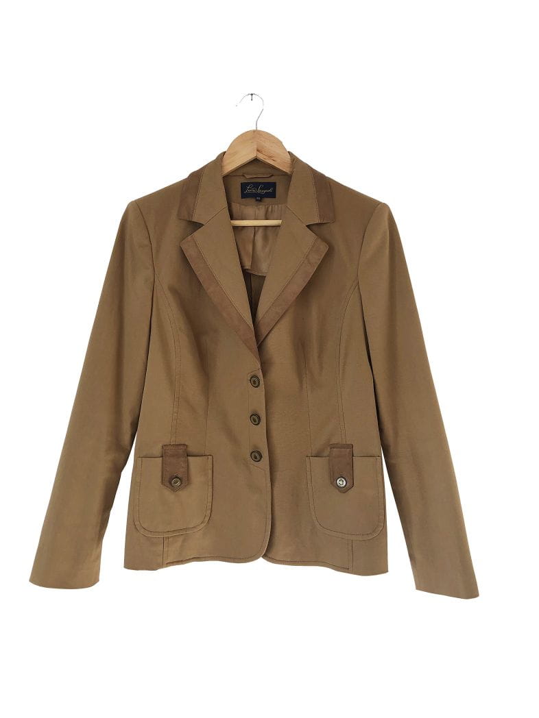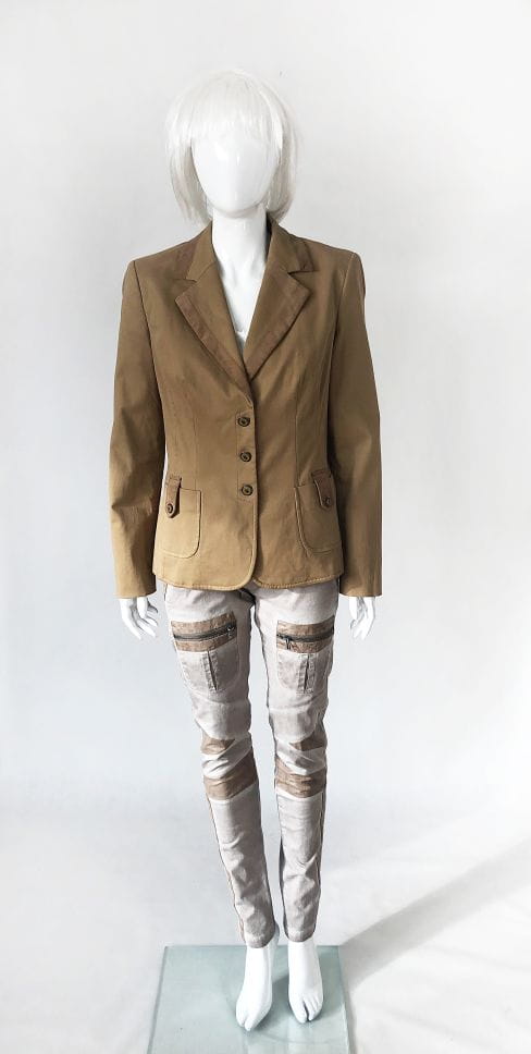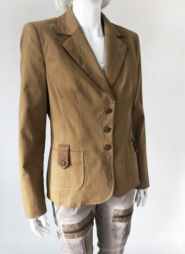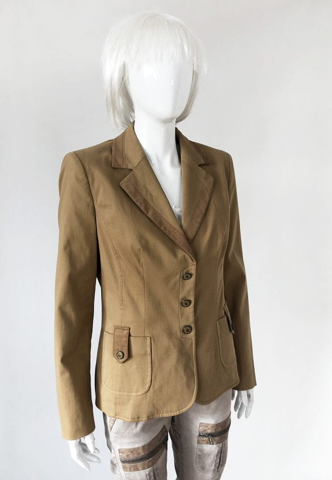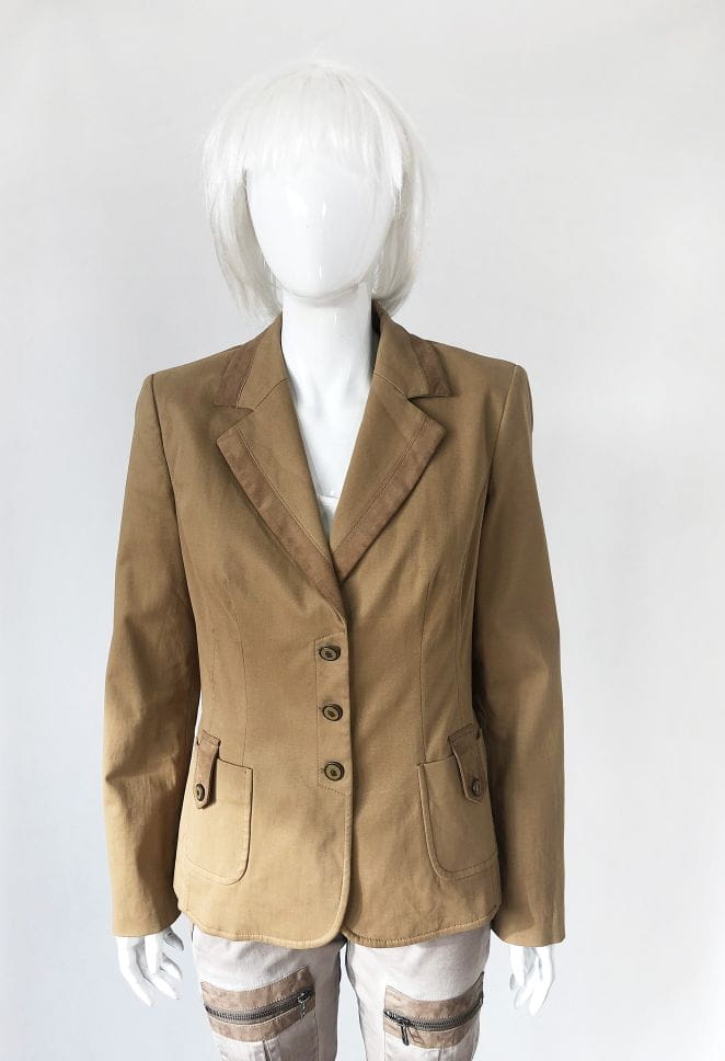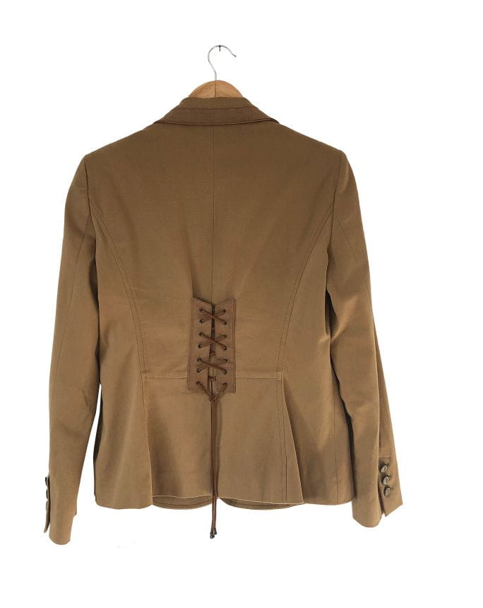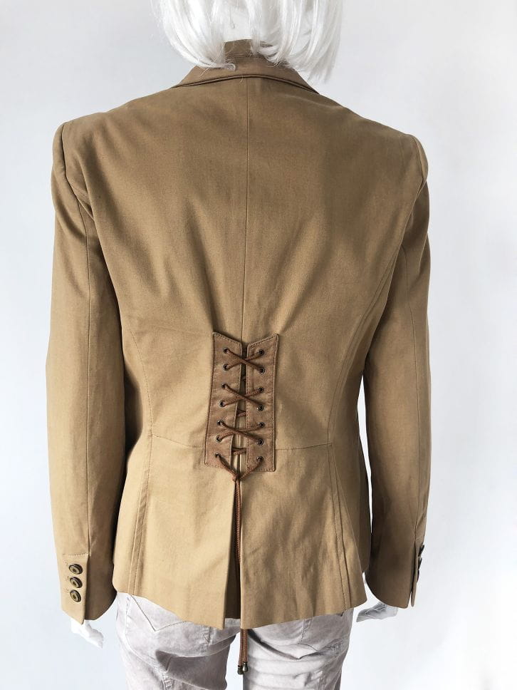 Marynarka projektu marki Luisa Spagnoli. Model w camelowym odcieniu. Świetnie skrojona: taliowany fason do bioder, ramiona lekko usztywnione, na plecach sznurowanie. Zapinana na logowane guziki.