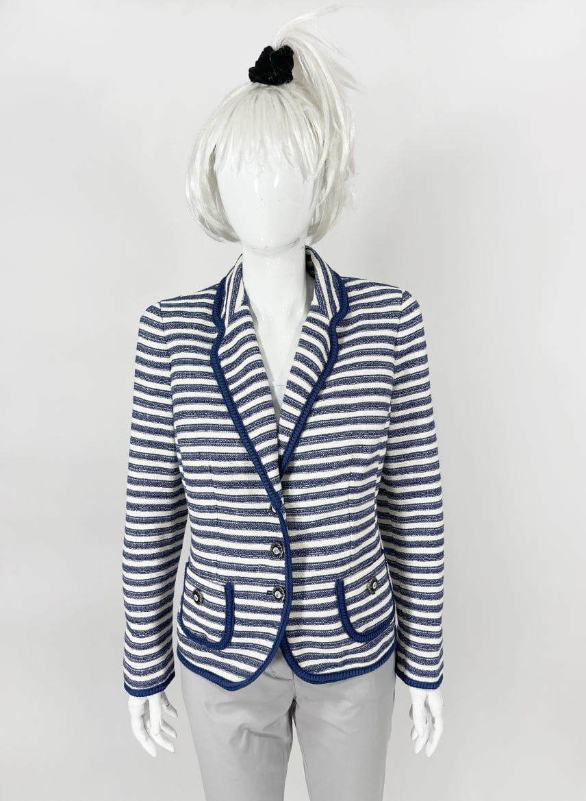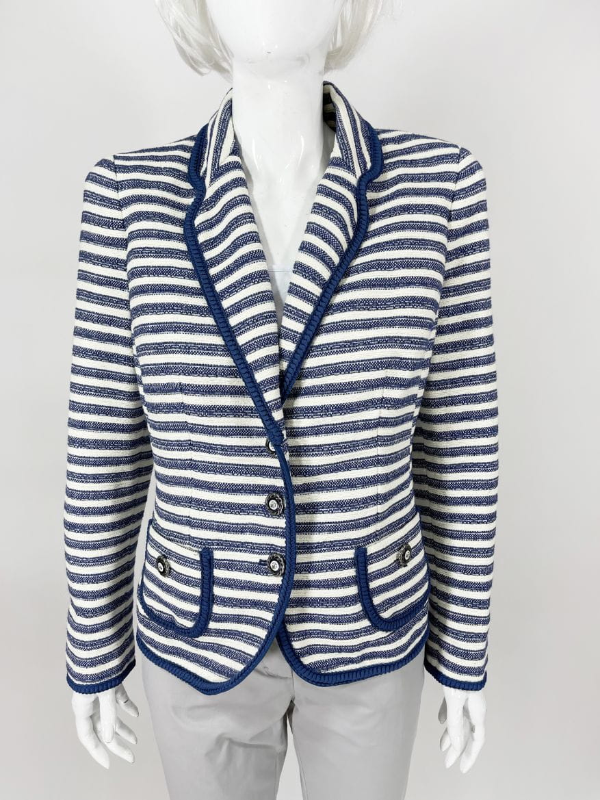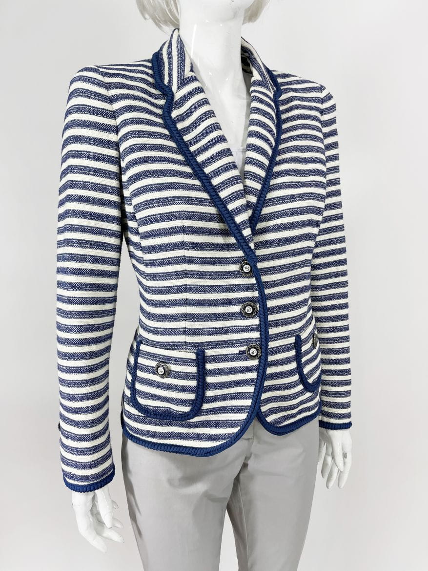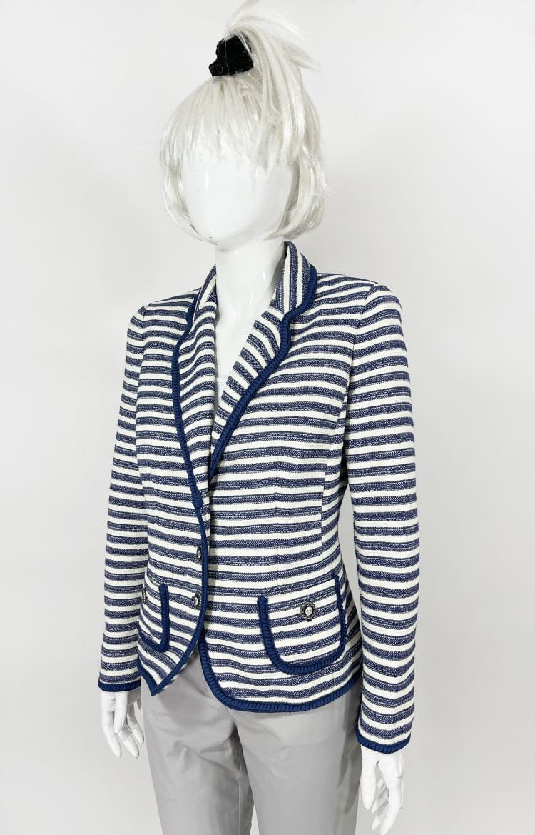 Luksusowy model Luisa Spagnoli w marynarskim stylu. Stylowa marynarka wykonana z solidnej płóciennej tkaniny z większością bawełny. Dekoracyjne duże guziki z kotwicami. Kołnierz i dół wykończone grubą lamówką. U dołu niewielkie kieszenie.