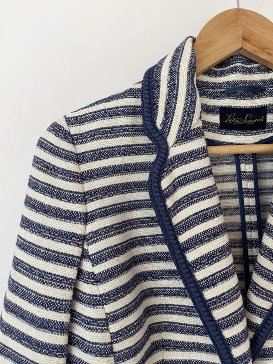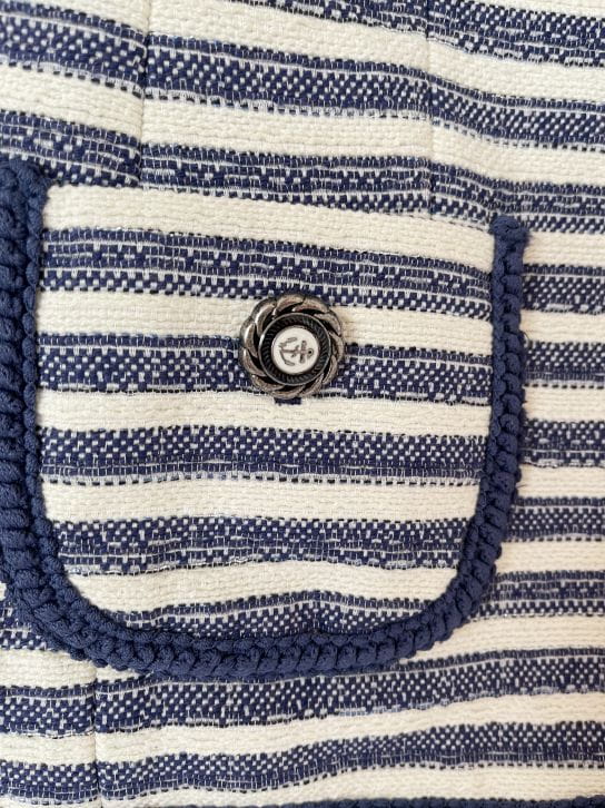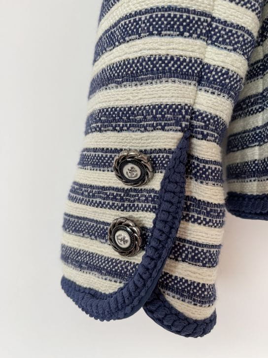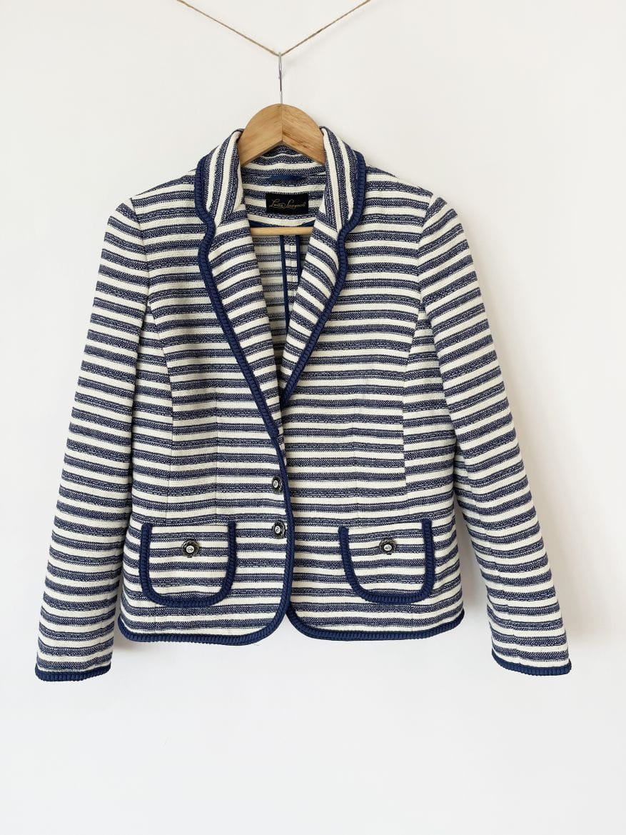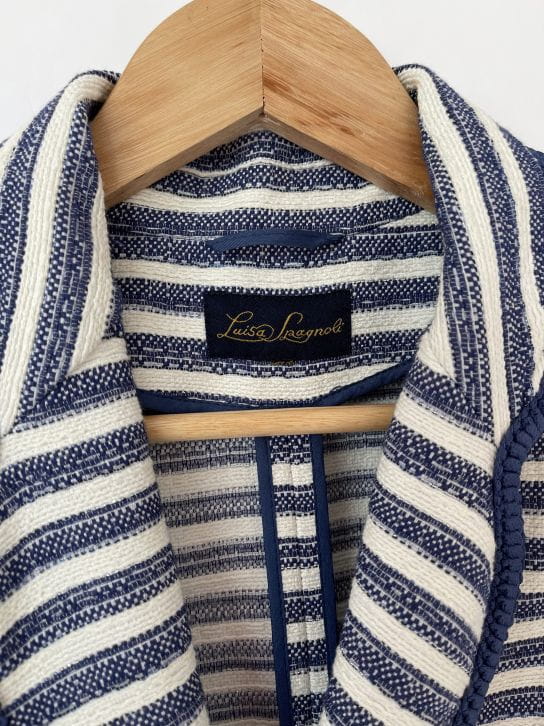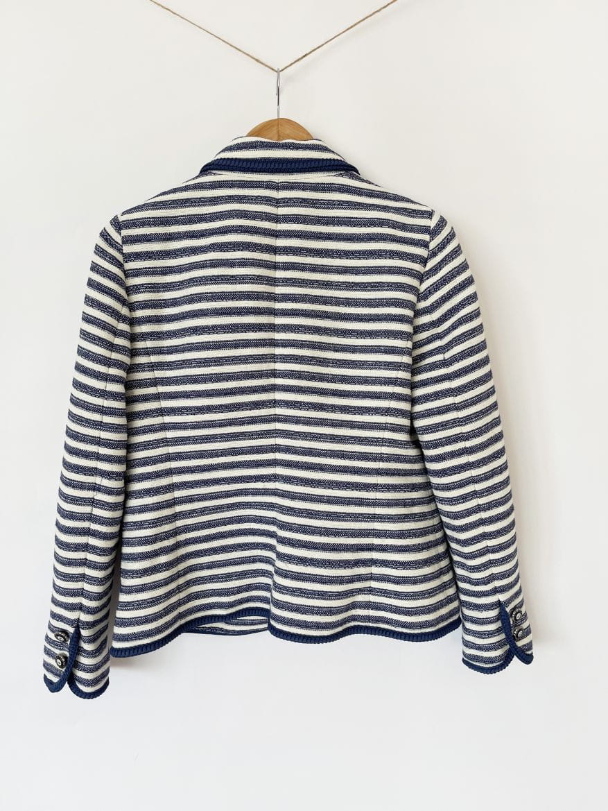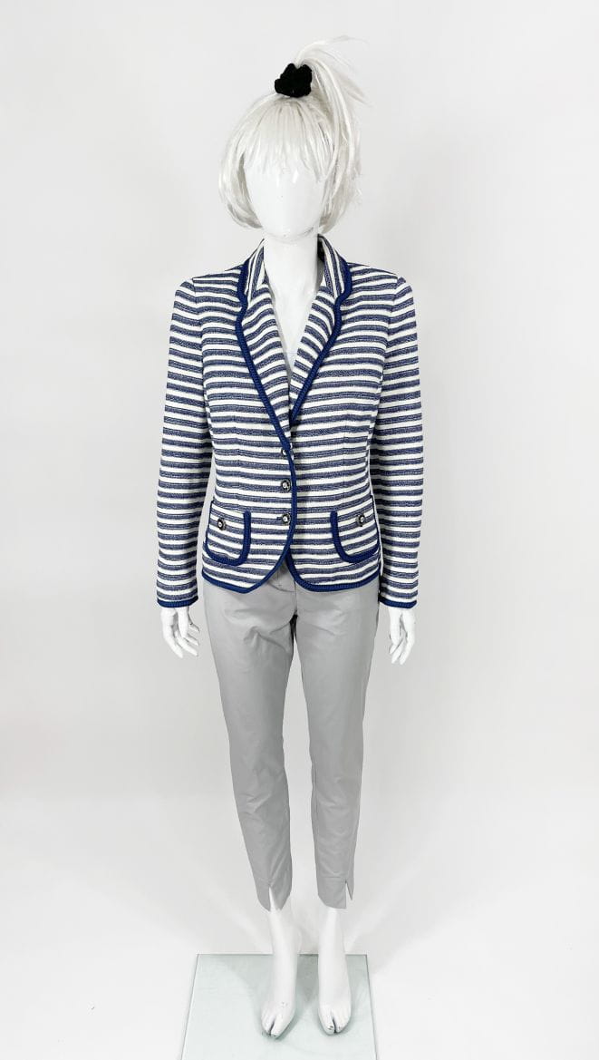 Luksusowy model Luisa Spagnoli w marynarskim stylu. Stylowa marynarka wykonana z solidnej płóciennej tkaniny z większością bawełny. Dekoracyjne duże guziki z kotwicami. Kołnierz i dół wykończone grubą lamówką. U dołu niewielkie kieszenie.