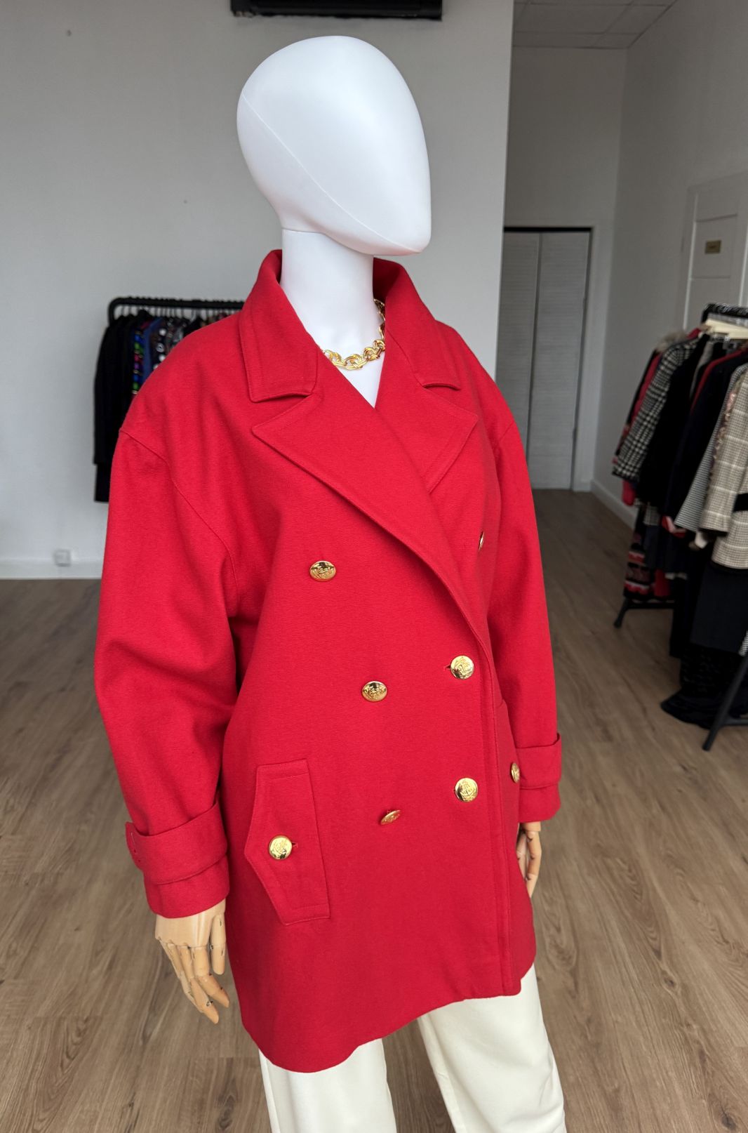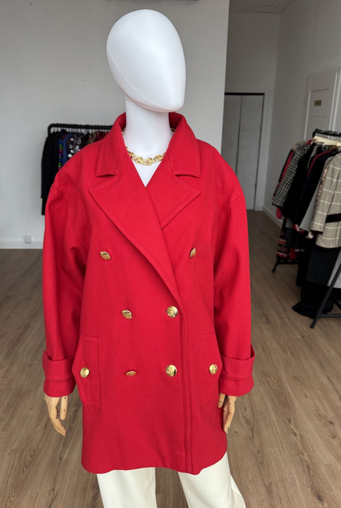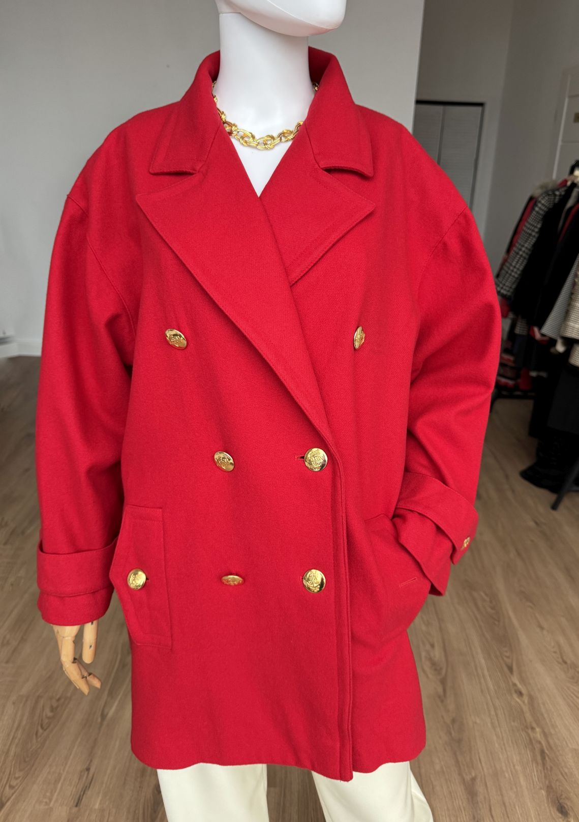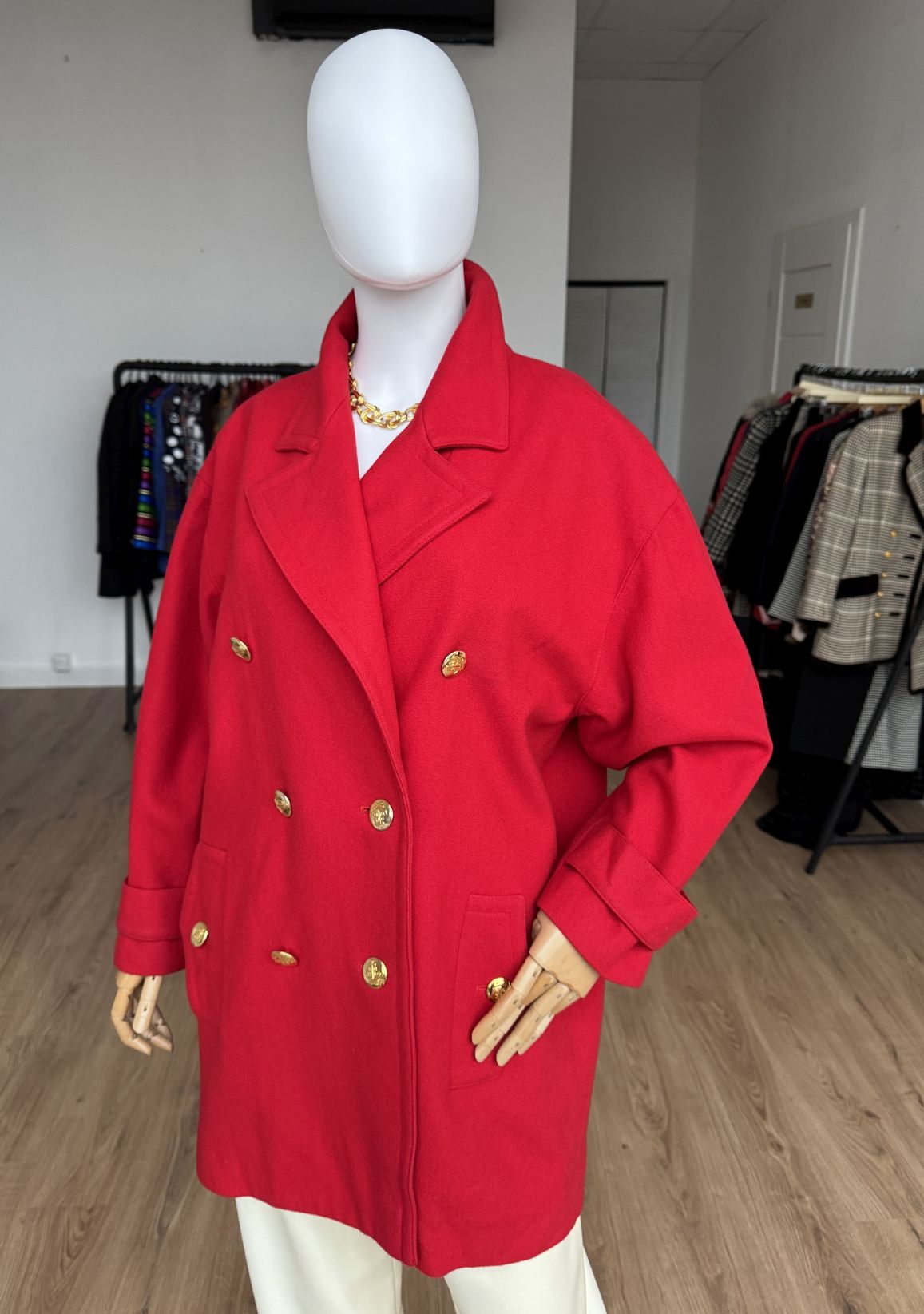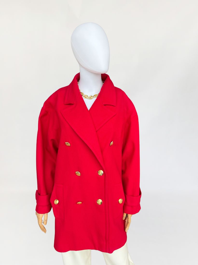 Wełniana kurtka vintage projektu luksusowej włoskiej marki Luisa Spagnoli. Oversizowy fason z dużym kołnierzem, dwurzędowym zapięciem na złote marynistyczne guziki i kieszeniami w dolnej części.