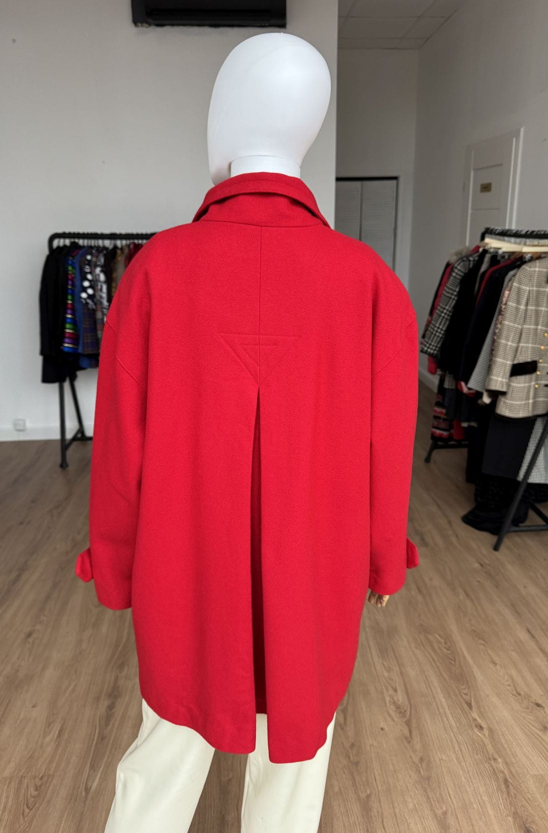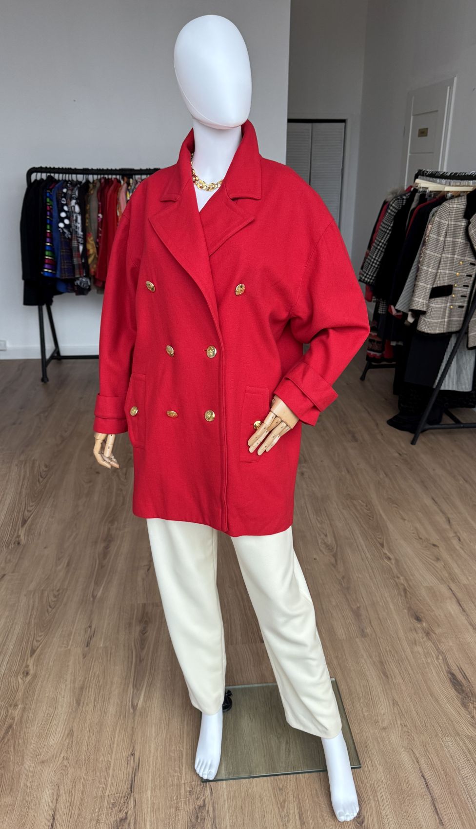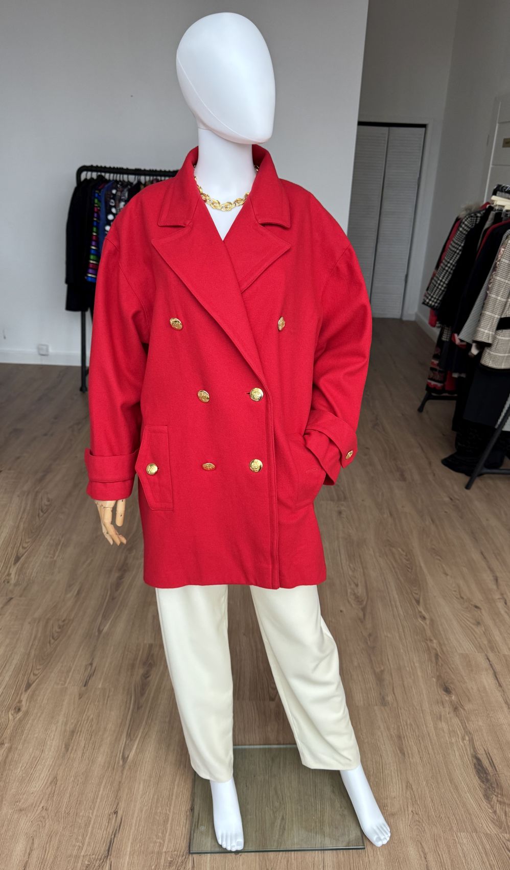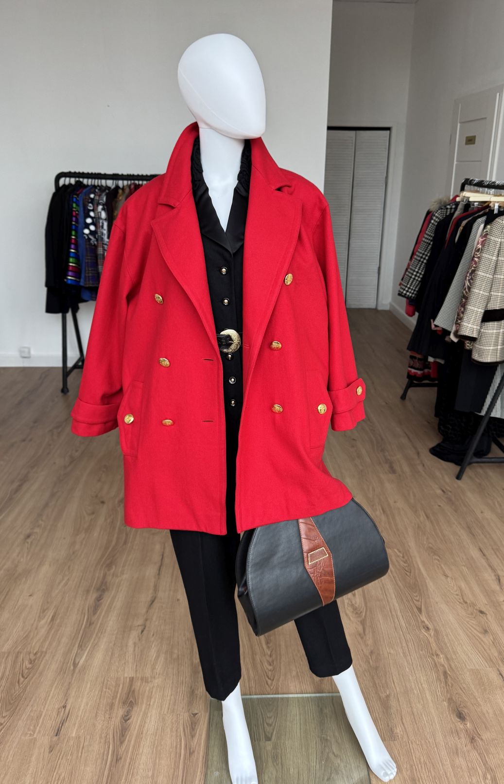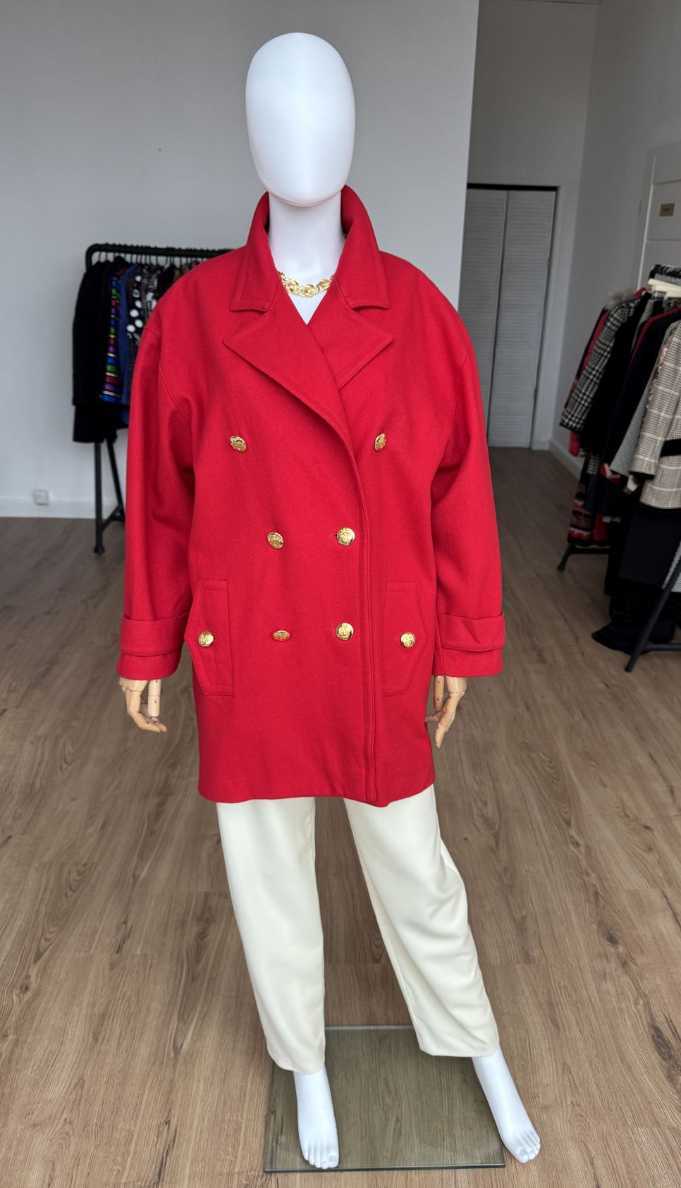 Wełniana kurtka vintage projektu luksusowej włoskiej marki Luisa Spagnoli. Oversizowy fason z dużym kołnierzem, dwurzędowym zapięciem na złote marynistyczne guziki i kieszeniami w dolnej części.